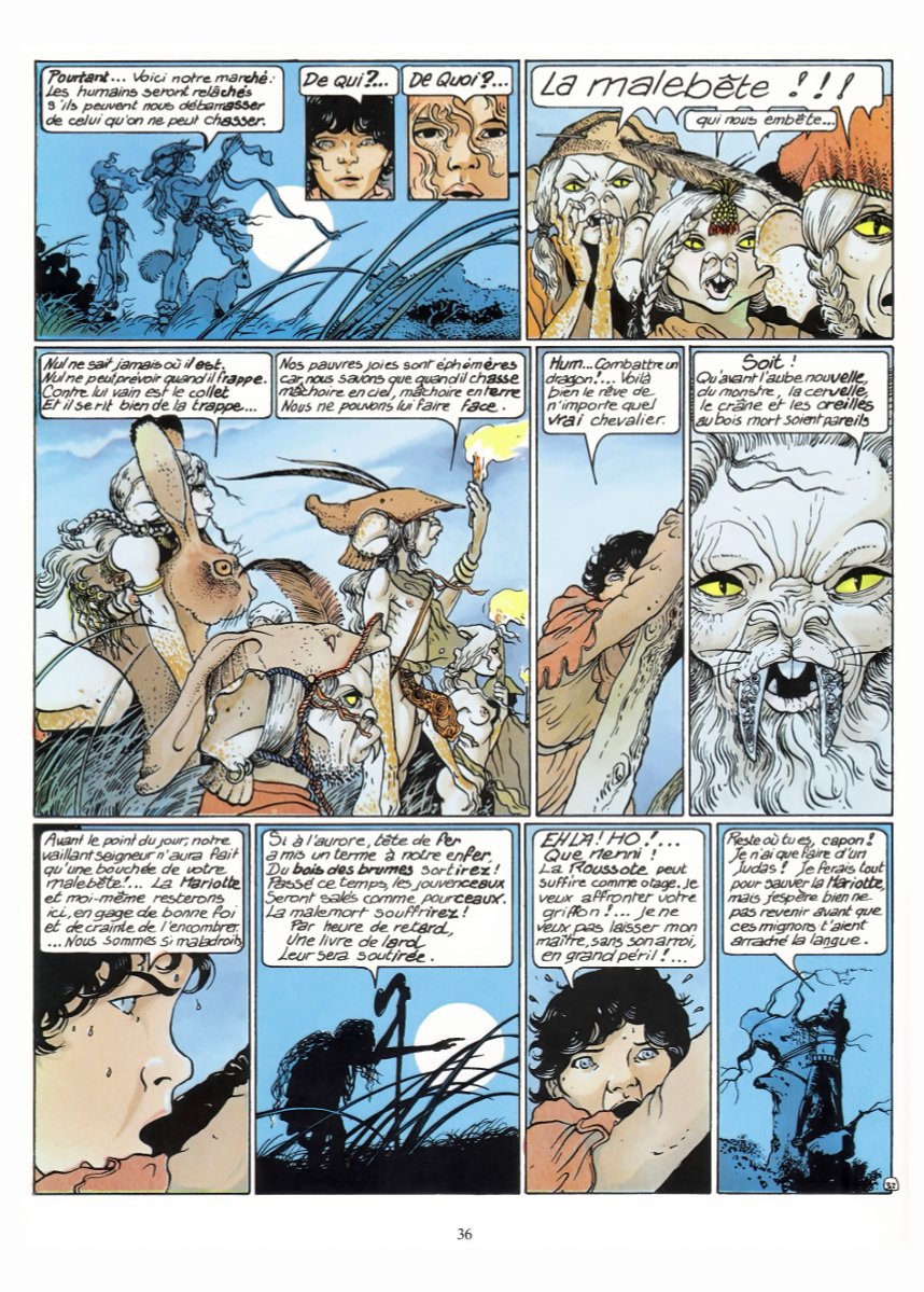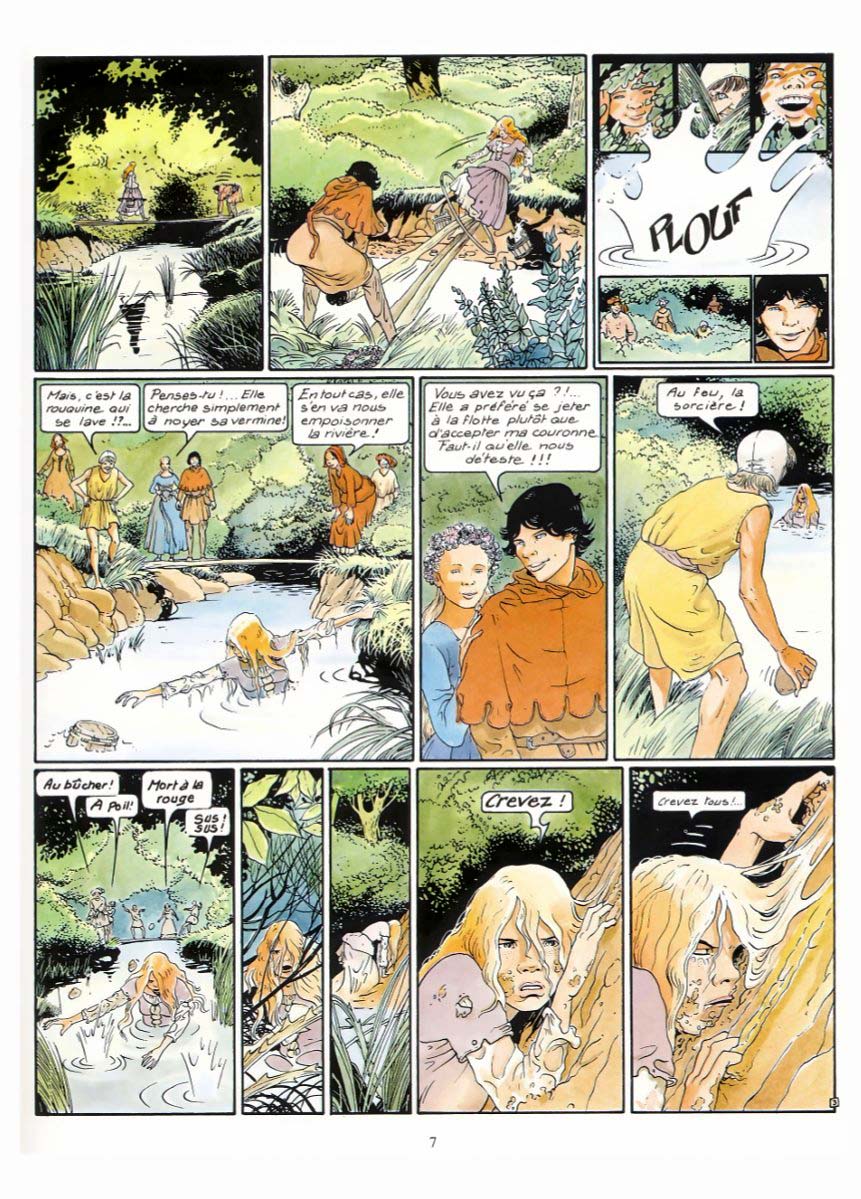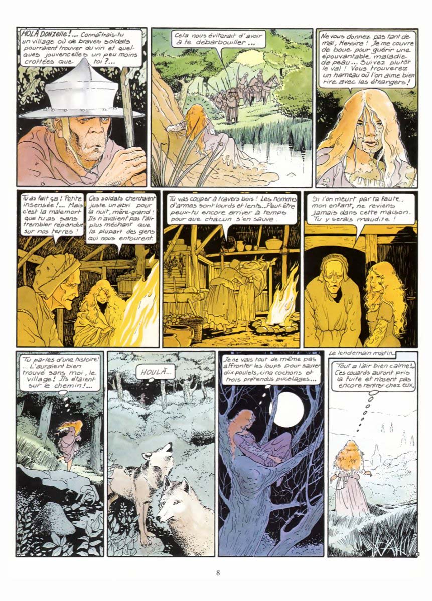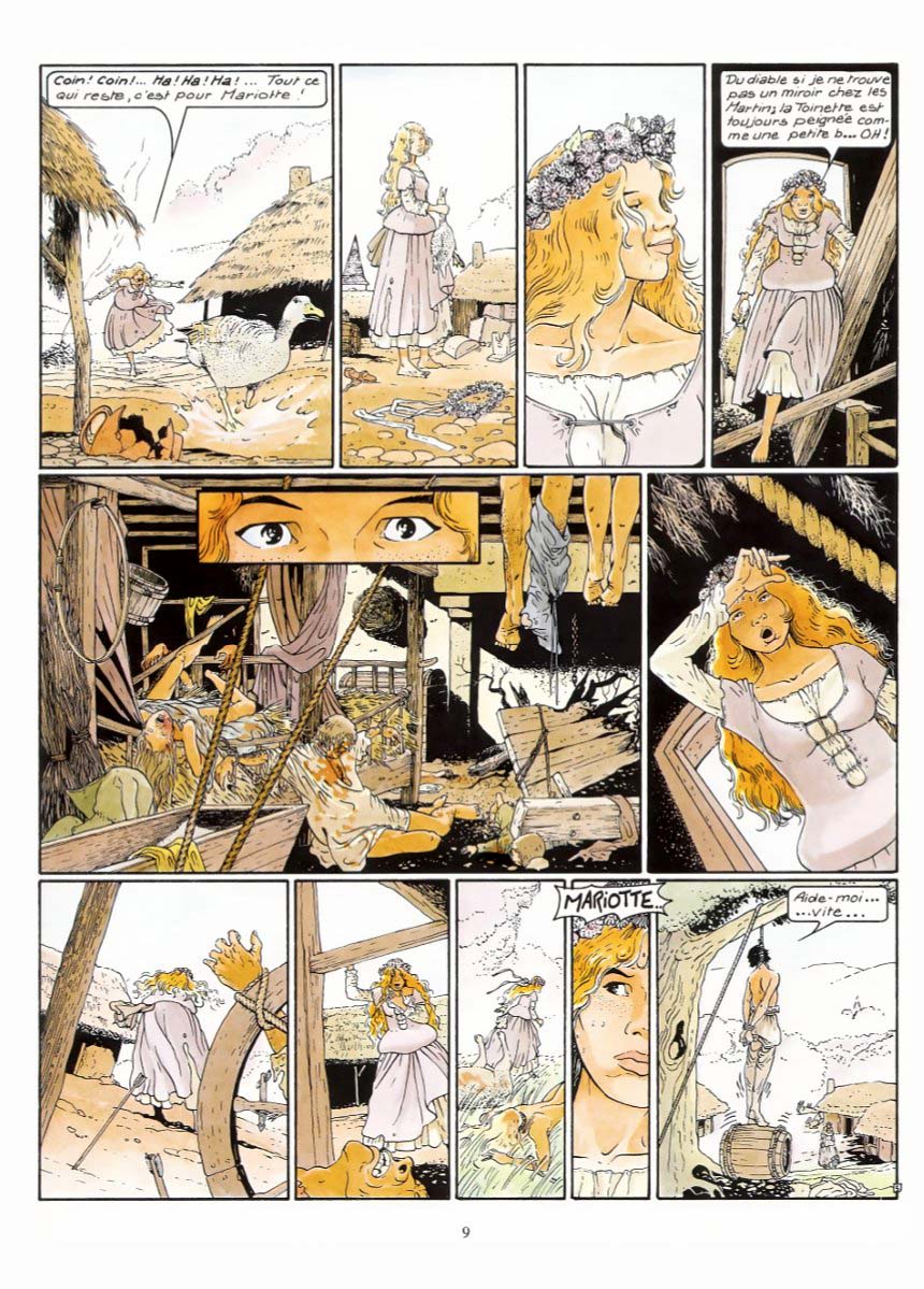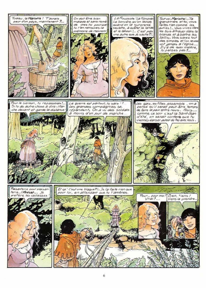 Un autre chef d’œuvre du 9ème art absolument magique et puissant. Une véritable odyssée moyenâgeuse glissant insidieusement (à la fin du 1er tome puis dans le 2ème) dans l'univers des mythes et légendes bretonnes. Mais pas les lutins et les fées de Pierre Dubois (que j'adore soit dit en passant.) Non là c'est plus réaliste et fortement documenté. Bourgeon a dû accomplir un travail de titan pour l'élaboration de cette saga. J'ai été bercé dans mon enfance par ces images plutôt dures mais incroyablement magiques d'un monde oublié (la cité des Douarts, un monde parallèle ?) Je n'ai pas tout compris à la 1ère lecture et ce n'est qu'au bout de 4 voire 5 lectures (sur plusieurs années bien entendu) que cette série a commencé à m'emporter. Dans le 3ème tome, nous replongeons violemment dans la réalité crue de cette époque sans pitié qu'est le Moyen-Age. C'est souvent horrible (le final avec son bûcher qui me fait un peu penser au "Nom de la Rose", les multiples mutilations, viols et autres tortures) mais aussi très sensuel et magique (la jeune femme sur la plage, l’héroïne souvent à moitié dévêtue, la jeune fille brune avec l’espèce de sorcier). Cette alternance entre ces moments de cruauté inouïe, et cette sensualité brute fait toute la puissance de cette série. Tous les personnages sont forts. L’héroïne bien entendu, l'Anicet (le jeune branleur bête et lâche par excellence) et surtout le chevalier errant. Ce personnage est une ordure mais au fur et à mesure du récit on s'attache vraiment à sa personnalité tourmentée. C'est le Moyen-Age, il faut être un loup pour survivre. Le langage moyenâgeux ne m'a pas gêné. Même si ce n'est pas évident à la 1ère lecture cela rend ce récit encore plus authentique (même dans sa partie fantastique) et l'aventure n'en devient que plus enivrante. Donc selon moi une des meilleures bandes dessinées françaises toutes époques confondues (légèrement supérieure aux Passagers du vent car plus sauvage et fantastique). Une aventure qui sent la pluie, la boue, les embruns et le sang.