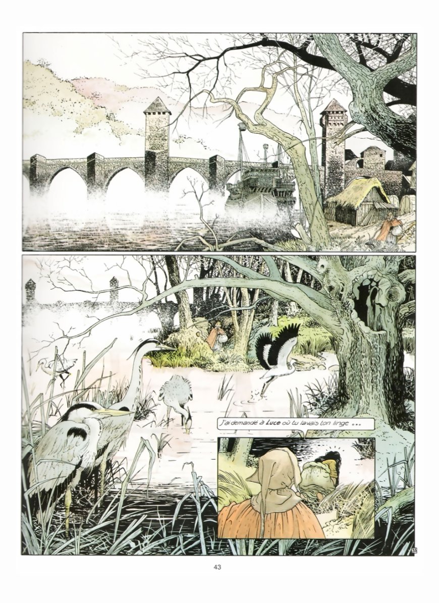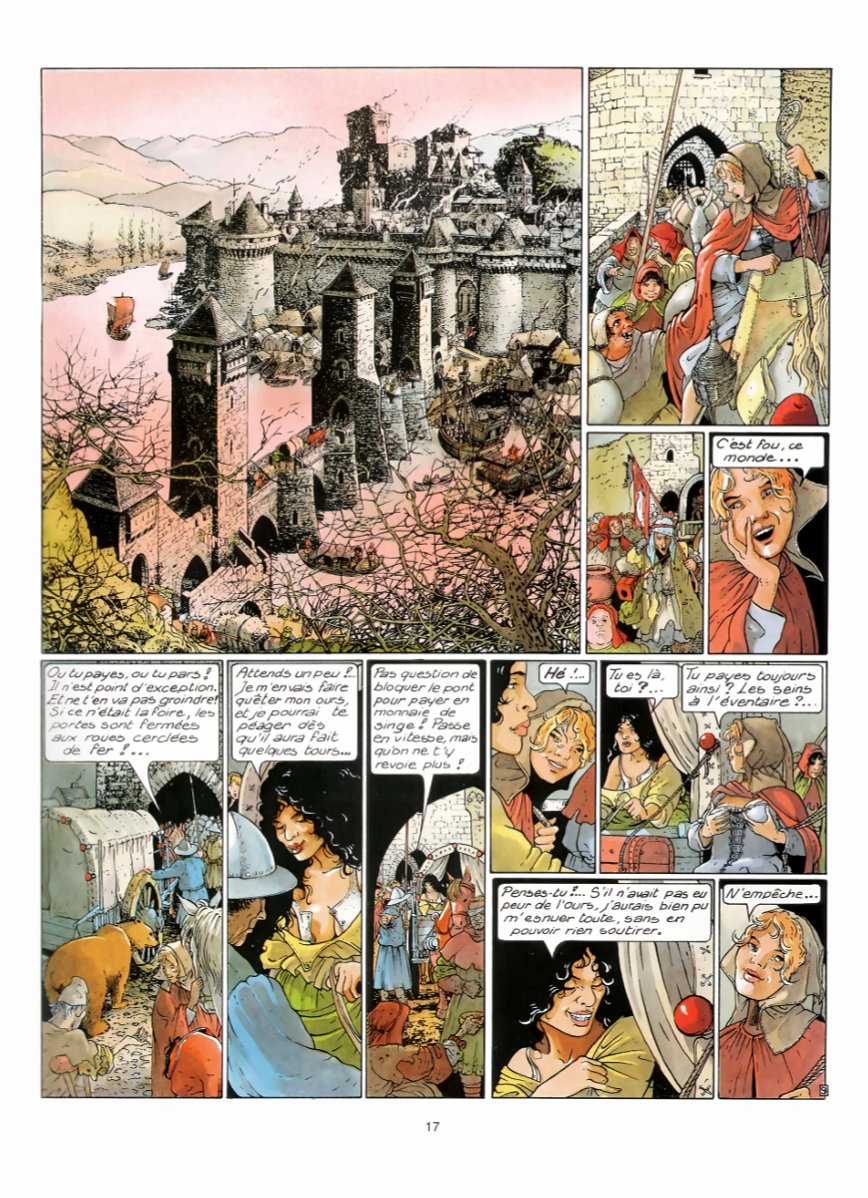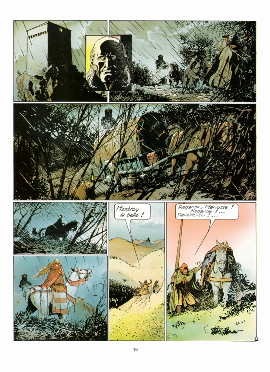 Bourgeon a réalisé en solo trois séries superbes, que j’adore, et que j’ai relues de multiples fois. Et ce dans des univers très différents, avec la SF pour Le Cycle de Cyann, l’aventure maritime du XVIIIème siècle avec Les Passagers du vent, et donc du médiéval fantastique avec « Les compagnons du crépuscule ». De ces trois séries, « Les compagnons du crépuscule » est sans conteste celle qui est la moins facile à appréhender, qui nécessite le plus d’efforts pour entrer – et rester ! – dedans. D’abord parce que le texte est très abondant, très riche et dense, mais aussi parce que certaines parties de l’intrigue sont un peu plus obscures : c’est avant tout le cas du deuxième album, clairement le plus complexe, avec certains passages peut-être moins fluides – et jouant davantage sur le fantastique, la poésie, l’imaginaire. Mais, si vous vous accrochez, vous découvrirez une histoire à la fois riche et belle, prenante, que j’aime en tout cas beaucoup. Comme pour toutes ses productions, Bourgeon s’est documenté, et cela se voit. Dans les dialogues d’abord, abondants et riches, comme signalé plus haut, mais aussi remplis de termes moyenâgeux (cette force est aussi une des difficultés déjà signalées). En plus des dialogues, ce sont les décors qui font « que l’on s’y croit ». En effet, que ce soit les habits, les habitations (ville et châteaux), mais aussi les paysages, le dessin de Bourgeon est très bon et très beau, et en plus est très crédible. C’est une belle reconstitution de l’Europe de ces temps troublés. En cela le dernier tome (deux fois plus épais que les précédents avec près de 130 pages !) est vraiment superbe, alliant un scénario aux petits oignons à un dessin franchement très bon. Ajoutons que, fidèle à son habitude, Bourgeon a su créer des personnages féminins très forts - et très beaux (dans tous les sens du terme d'ailleurs), comme Mariotte. C'est une série exigeante, mais que je vous encourage à découvrir si ce n’est pas déjà fait !