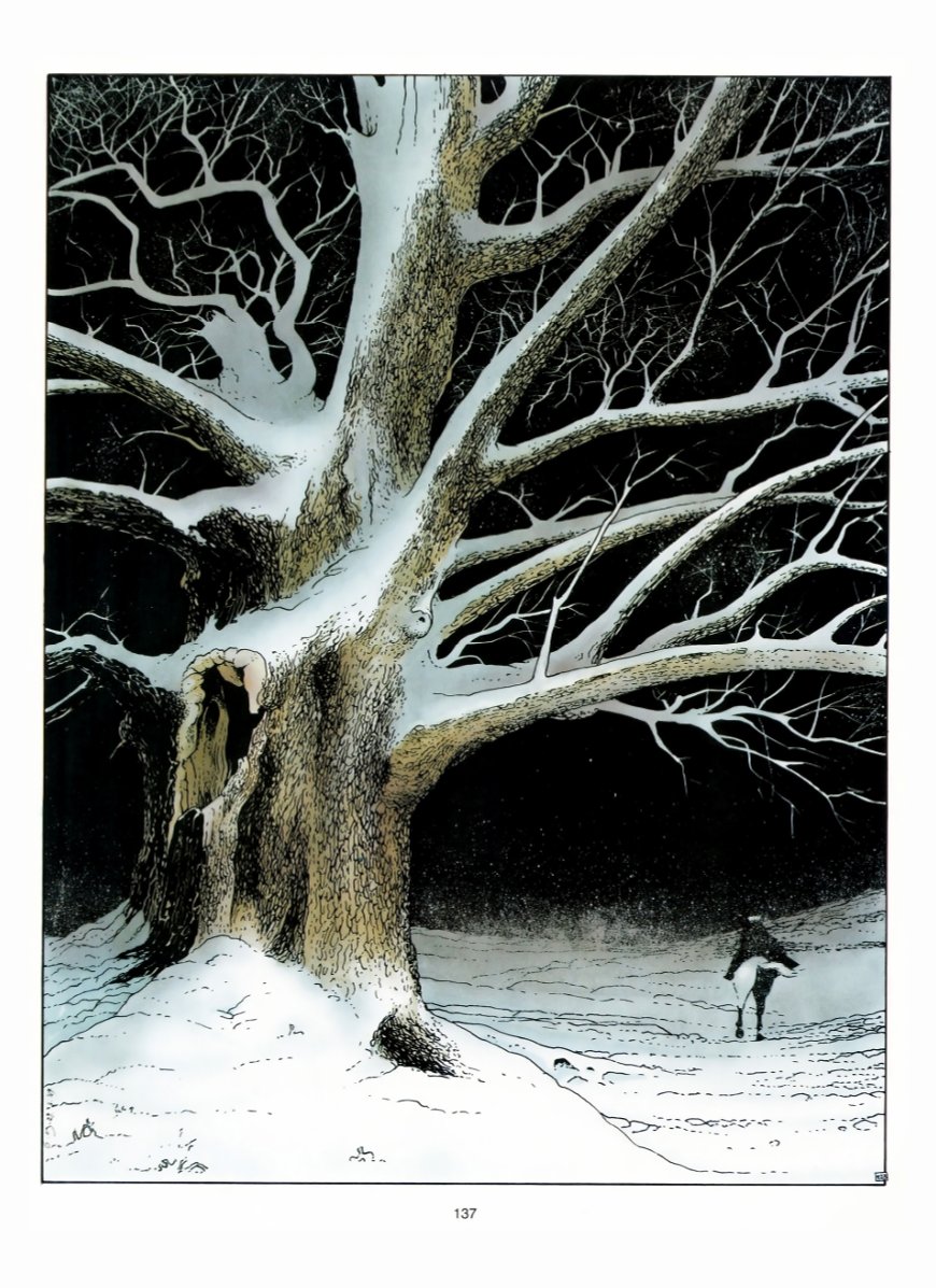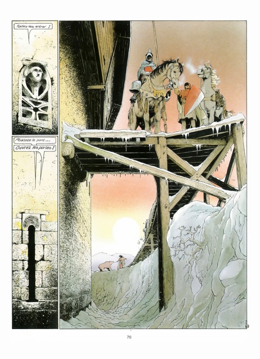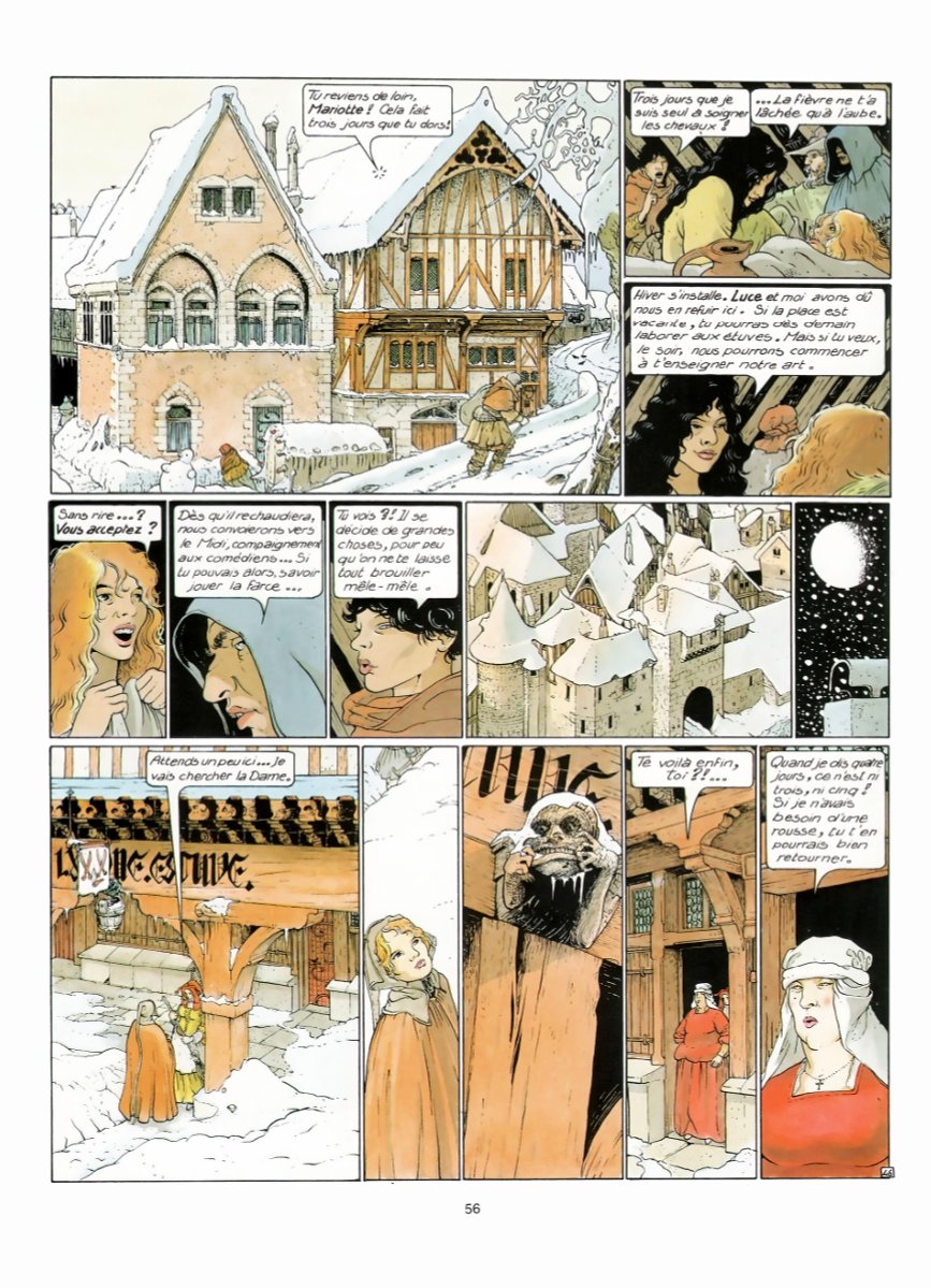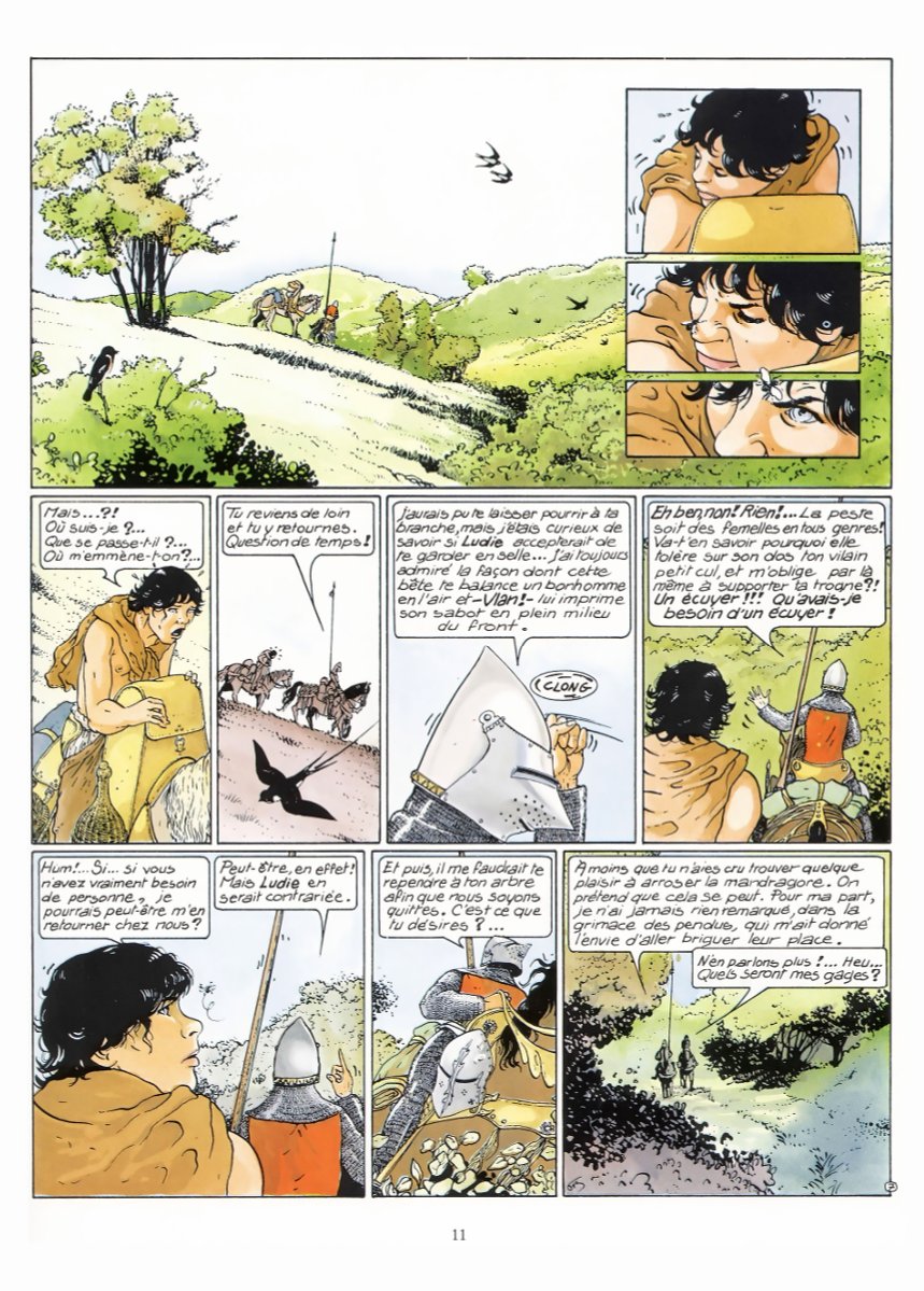 Bourgeon a réalisé en solo trois séries superbes, que j’adore, et que j’ai relues de multiples fois. Et ce dans des univers très différents, avec la SF pour Le Cycle de Cyann, l’aventure maritime du XVIIIème siècle avec Les Passagers du vent, et donc du médiéval fantastique avec « Les compagnons du crépuscule ». De ces trois séries, « Les compagnons du crépuscule » est sans conteste celle qui est la moins facile à appréhender, qui nécessite le plus d’efforts pour entrer – et rester ! – dedans. D’abord parce que le texte est très abondant, très riche et dense, mais aussi parce que certaines parties de l’intrigue sont un peu plus obscures : c’est avant tout le cas du deuxième album, clairement le plus complexe, avec certains passages peut-être moins fluides – et jouant davantage sur le fantastique, la poésie, l’imaginaire. Mais, si vous vous accrochez, vous découvrirez une histoire à la fois riche et belle, prenante, que j’aime en tout cas beaucoup. Comme pour toutes ses productions, Bourgeon s’est documenté, et cela se voit. Dans les dialogues d’abord, abondants et riches, comme signalé plus haut, mais aussi remplis de termes moyenâgeux (cette force est aussi une des difficultés déjà signalées). En plus des dialogues, ce sont les décors qui font « que l’on s’y croit ». En effet, que ce soit les habits, les habitations (ville et châteaux), mais aussi les paysages, le dessin de Bourgeon est très bon et très beau, et en plus est très crédible. C’est une belle reconstitution de l’Europe de ces temps troublés. En cela le dernier tome (deux fois plus épais que les précédents avec près de 130 pages !) est vraiment superbe, alliant un scénario aux petits oignons à un dessin franchement très bon. Ajoutons que, fidèle à son habitude, Bourgeon a su créer des personnages féminins très forts - et très beaux (dans tous les sens du terme d'ailleurs), comme Mariotte. C'est une série exigeante, mais que je vous encourage à découvrir si ce n’est pas déjà fait !