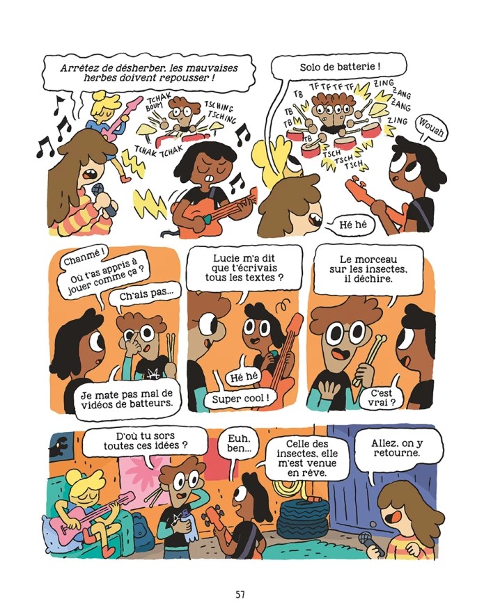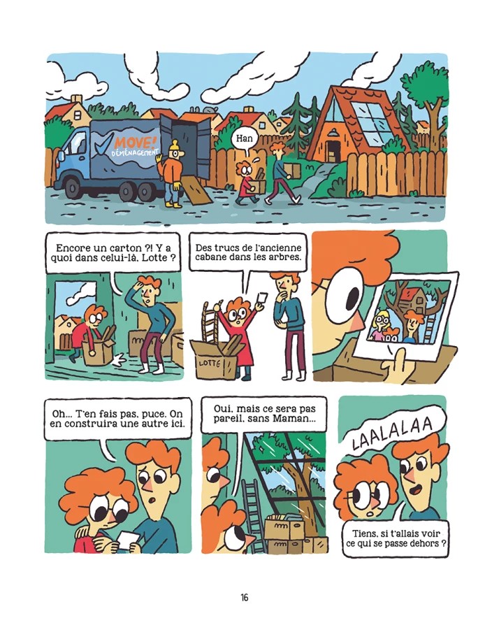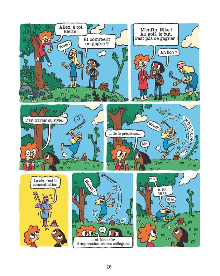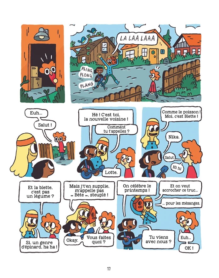 Je suis déçu par cette série jeunesse qui vise les JF de 8/12 ans. Le concept de trois copines indépendantes qui s'organisent seules pour vivre des aventures improbables est devenu assez commun. Je n'ai pas trouvé une grande originalité ni dans les aventures ni dans la personnalité de Nika, Lotte et Blette. Ces prénoms particuliers s'expliquent par l'origine allemande de la série. On retrouve les ingrédients classiques d'une telle série : musique, mode, garçons, aventures. Ce qui fait la différence entre les récits, à mon avis, est l'adhésion à l'humour de l'auteur. Ici c'est raté pour moi. Est-ce un problème de traduction ? Mais j'ai trouvé les dialogues assez quelconques. Pire j'ai trouvé le langage assez relâché par moment pour faire style ados. Je n'ai pas été trop séduit par le dessin de Thomas Wellmann même s’il se dégage une belle vitalité dans les saynètes. Par contre j'ai bien aimé la mise en couleur très vive et lumineuse. Je pense que l'on peut trouver bien mieux chez Sarbacane pour les enfants ou ados.