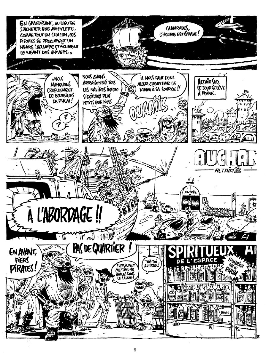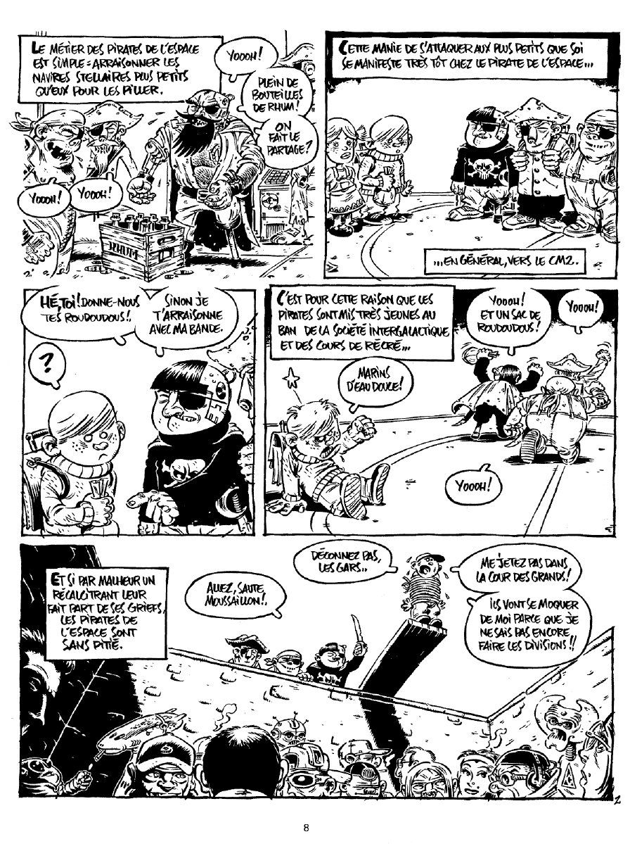 J’éprouve pour ma part beaucoup d’affection à l’égard de cet album. Larcenet se colle à la science-fiction et le résultat est décapant. Chacune des histoires courtes propose une bonne dose de rire et de situations originales. Comme il sait si bien le faire, Larcenet nous expose une galerie de personnages immédiatement attachants. Comment ne pas esquisser un sourire devant ces pirates de l’espace, ce soldat manchot ou ce scientifique qui découvre la femme ? Les dialogues et la narration font mouche. Ce n’est pas du Shakespeare, mais comme d’habitude avec l’auteur, c’est hyper efficace et séduisant. Les dessins de Ju/cdm collent parfaitement à l’univers proposé et à l’humour de Larcenet. Il leur manque certainement une forte personnalité ou un peu plus d’originalité pour être inoubliables, mais l’auteur s’en sort très bien. C’est un vrai bon dessin humoristique, facile à lire et les trognes et attitudes des personnages sont en parfaite harmonie avec les textes du scénariste. Il n’y a qu’à regarder les cases dans la galerie pour se rendre compte que c’est efficace. Je n’ai donc pas été déçu par ces petites histoires intergalactiques. Toutes sont originales et drôles à lire. C’est un album que je prends d’ailleurs plaisir à relire assez souvent. Ce n’est certes pas la meilleure chose que Larcenet ait pu produire, mais ça reste très chouette et rafraichissant. Contrairement aux avis précédents, j’imagine mal ma collection de Fluide Glacial ou de Larcenet sans ce petit album :)