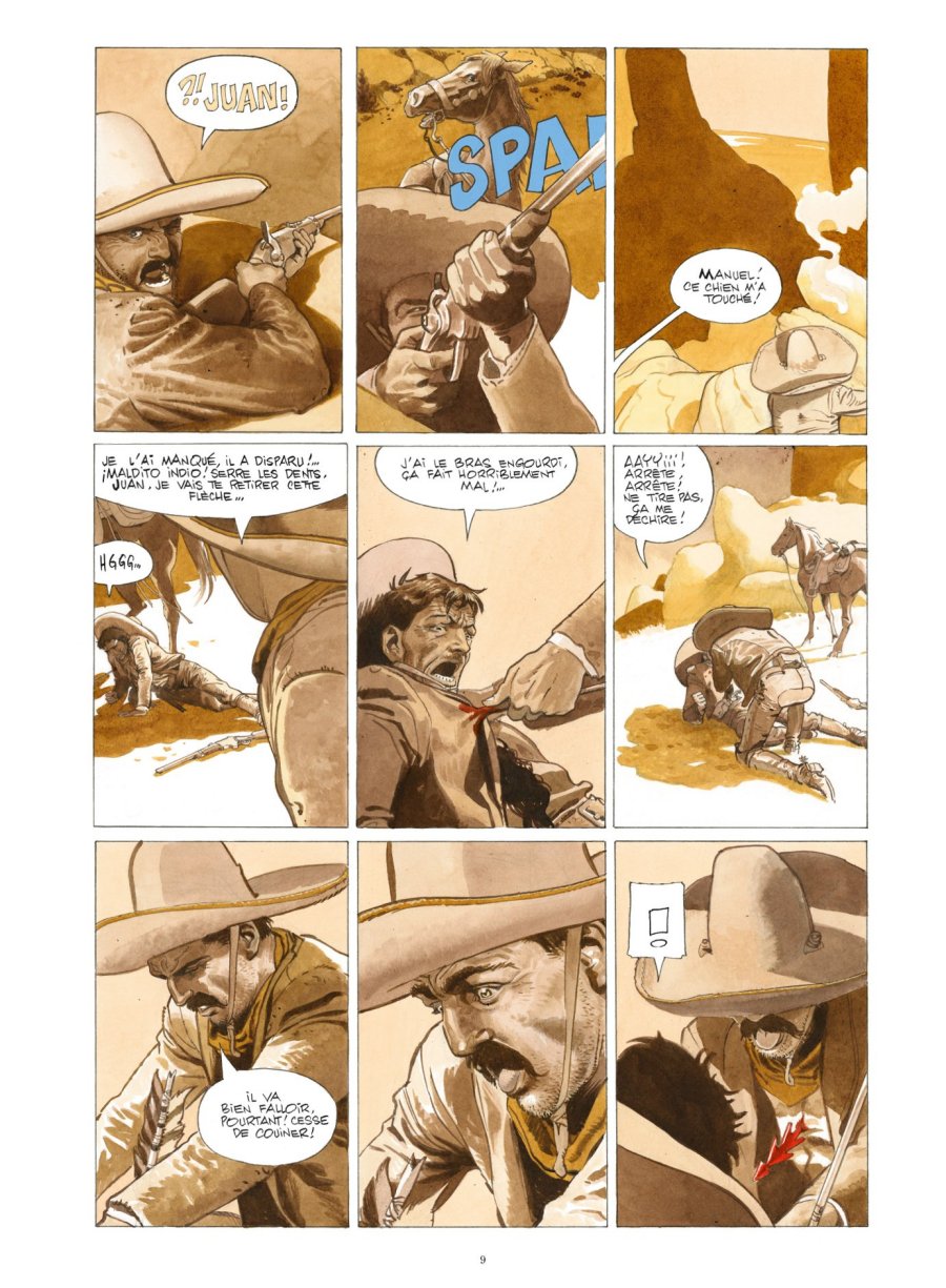C’est incontestablement un très bel album. Je l’ai acheté pour le dessin de Christian Rossi et, dès les premières pages, j'ai été plongé dans une ambiance lourde, écrasée de chaleur, sous un soleil de plomb, dans le vent et la poussière. Les pages sont graphiquement très belles, les couleurs parfaites. Du côté du scénario, j’ai mis un peu de temps à trouver mon rythme mais une fois partie, l’histoire s’est étirée lentement jusqu'à la fin. Les personnages sont attachants, pas seulement Woan, le jeune héros banni, mais aussi les personnages secondaires qui sont bien travaillés. On découvre la culture apache non pas de manière caricaturale mais au contraire avec beaucoup de nuances et de détails. Même le personnage de Geronimo est utilisé avec finesse. Cet album c'est aussi une belle leçon d’histoire évoquant le recul de la culture indienne, les contacts avec les Blancs, la dimension inexorable de cette évolution et une fin plutôt réussie. Un album très fort, à savourer lentement.