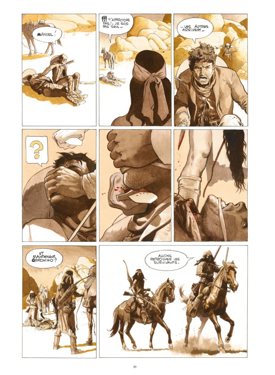 Je ne suis pas un grand spécialiste du genre Western mais j'ai beaucoup apprécié la lecture l'histoire de cet apache atypique et souvent solitaire. Christian Rossi choisit avec bonheur de nous faire suivre le récit des actions de résistances de Géronimo via le parcours de Woan un apache exclu jeune de son clan pour avoir rompu l'harmonie naturelle qui régit la vie de sa tribu. Le fil conducteur du parcours de Woan sert à Christian Rossi pour aborder le mode de vie des apaches en relation avec les éléments naturels ou historiques. Le récit se partage donc avec justesse entre ethnologie et histoire. La série montre le sérieux des recherches et des références de l'auteur et le côté fictionnel s'insère avec une forte crédibilité à la trame historique. La narration délivre une empathie certaine pour les indiens mais évite de tomber dans un manichéisme facile. Ainsi un final inattendu essaye de clore le chapitre de la violence pour rebondir vers une hypothétique place des natifs dans une société plus juste. Le graphisme soutient parfaitement le rythme du récit. Les scènes contemplatives dans la montagne ou la sierra alternent avec bonheur aux scènes plus dynamiques. Rossi a apporté un soin particulier à la gestuelle des combats sans en faire trop. Les paysages sont grandioses avec l'aide d'une mise en couleur où les jaunes et ocres dominent souvent pour donner une belle luminosité aux images. Une très belle lecture qui devrait plaire au delà du cercle des amateurs de western.