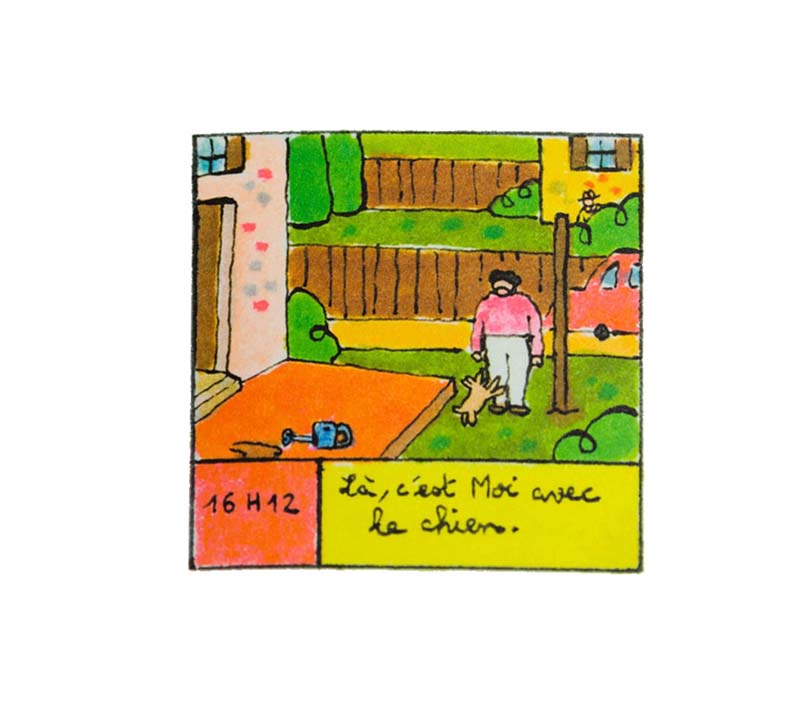 Qu'est-ce que j'ai ri, mon dieu !! "Une Journée avec Moi" est un tout petit album au format carré dans lequel, Alexandre Géraudie raconte... ben une journée avec lui. On devait déjà à l'auteur, en 2015, le tout aussi petit album « Du Pain et des Chats » dans lequel, à l’aide de photos et de commentaires absurdes qu’il ajoutait, il comparait du pain et des chats. On ne peut pas faire plus explicite. C’est aussi le cas avec cet album dans lequel il dessine, sur chaque page de droite, un dessin de lui en train de faire quelque chose ainsi que l’heure à laquelle il le fait. Par exemple : « 16h04 : Là c’est moi qui prend l’air cinq minutes », «16h05 : Là c’est moi qui fait semblant de pas entendre le voisin », « 16h10 : Là c’est moi qui plante une sorte de bâton »…etc. Et ça continue pendant une soixantaine, le tout avec un dessin (en apparence) absolument simpliste. C’est hilarant, c’est un voyage complètement absurde dans la vie d’un personnage à la vie la plus inintéressante …et c’est ça qui est amusant.