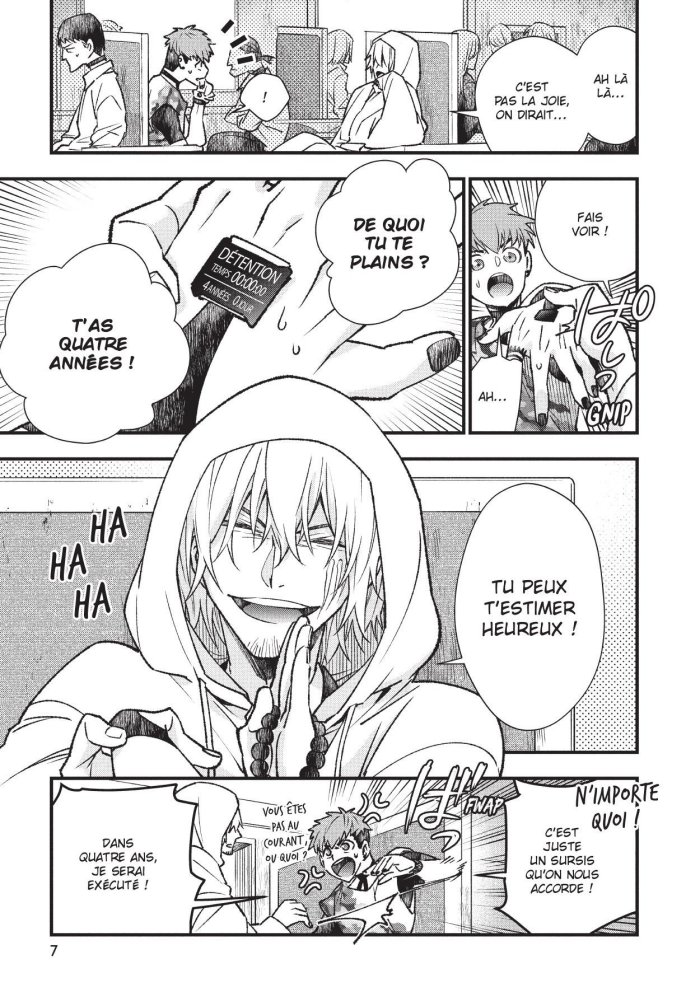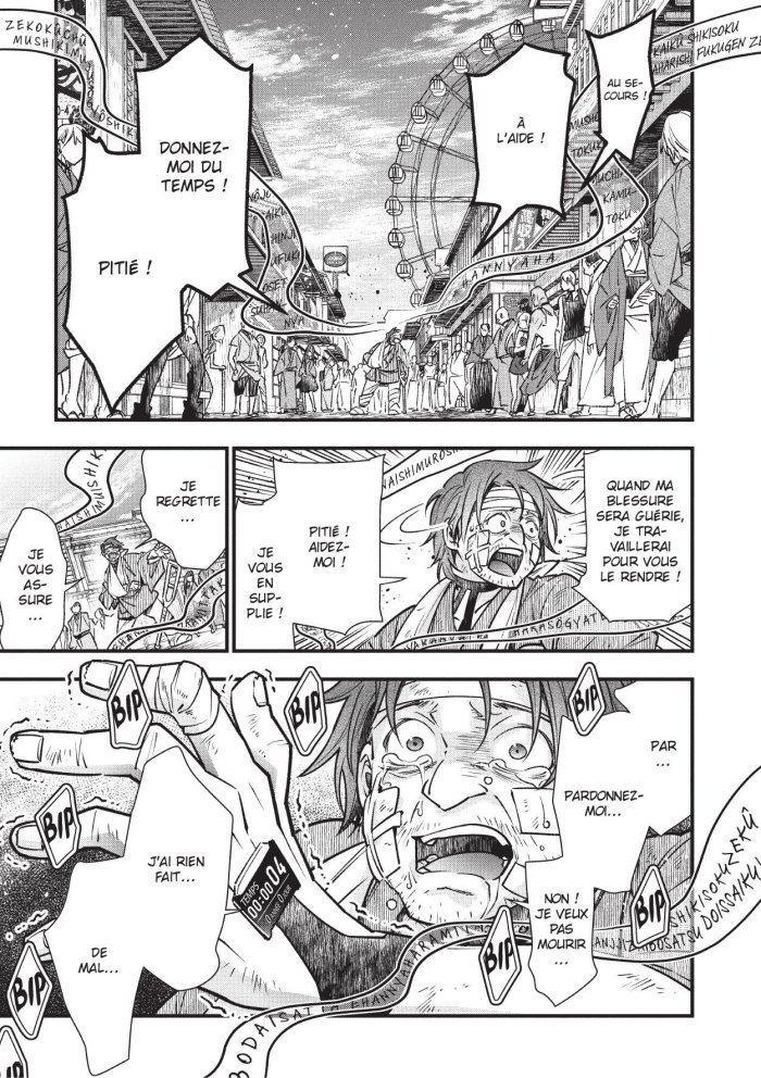 Ce manga se déroule dans un monde où toute personne ayant causé la mort d'un tiers est condamnée à mort et pour cela placée dans une ville prison dédiée avec un compteur égrenant le temps qu'il leur reste avant leur exécution. Mais ils peuvent acheter du temps à rajouter sur ce compteur, à condition d'effectuer les boulots que les autorités daignent leur proposer. Dans ce district de la mort, deux personnages sont au cœur de l'action. Le premier est une sorte de moine bouddhiste sensé amener la paix dans l'esprit des condamnés, mais il se comporte en réalité plutôt en exécuteur vengeur. Le second est une sorte de samouraï bourreau qui au contraire fait preuve de pitié envers les condamnés et, quand il ne peut pas les aider, il essaie d'abréger leurs souffrances. Les deux vont se retrouver à travailler ensemble et à s'influencer mutuellement. C'est un drôle de manga se plaçant dans un cadre un peu dystopique basé sur une société cruelle qui ne s'embarrasse pas de sentiments envers ses condamnés, et qui mêle de l'aventure et des formes d'enquêtes un peu policières, et toute une réflexion sur la mort, la peine de mort et ceux qui l'exécutent. Le ton est mature et relativement cru. La légèreté du comportement et des dialogues de certains personnages tranche (c'est le cas de le dire) avec la violence des faits : on y parle en effet de vraies mises à mort et les têtes tranchées y sont légion. Le moine, en particulier, ne se laisse pas facilement cerner, son comportement oscillant entre la fausse compassion, une légère folie douce dans ses paroles, une obsession implacable pour la justice expéditive et l'esprit torturé de quelqu'un qui souffre et cherche la vengeance. Son partenaire se révèle un bon contre-point, lui faisant preuve de plus de douceur et d'une vraie compassion même s'il n'hésite pas à tuer lui-même, mais plus dans un esprit de mettre fin au malheur. Le rythme du récit est bon, l'intrigue non linéaire et plutôt touffue, et le dessin est très maîtrisé et bien lisible. C'est un manga de bonne facture qui surprend un peu le lecteur par son contexte et ses protagonistes, et qui amène quelques réflexions sur la peine de mort, la justice et la vengeance. Il se termine en outre en 3 tomes seulement ce qui permet de ne pas le voir s'étaler trop en longueur.
