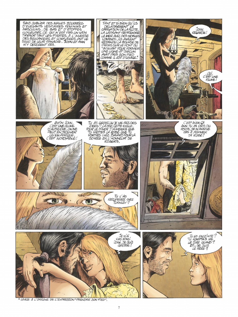 Les récits de piraterie foisonnent depuis quelques temps maintenant mais leur style peut fortement varier d’une série à l’autre. Ann Bonny s’inscrit dans une veine historique même si Franck Bonnet, l’auteur de la série, reconnait lui-même que l’on ne sait finalement que très peu de chose sur la pirate, voire qu’il est possible que tout ce qui a été écrit sur elle n’était que pure affabulation. Cependant, l’auteur maîtrise suffisamment son sujet pour créer un théâtre très plausible. J’ai particulièrement apprécié la représentation des différents navires pour laquelle l’auteur cherche vraiment à faire montre de réalisme. Mais ce qui m’a attiré avant toutes choses, c’est le style graphique de Franck Bonnet. Dès la première page, le trait comme la colorisation m’ont donné l’impression de lire une bande dessinée du siècle dernier (voire des années septante ou quatre-vingt). Ça fera sans doute peur à beaucoup, mais moi, ça m’a hypnotisé. Et à la lecture, cette sensation de lire une ‘vieille’ bd est encore accentuée par le style narratif, l’écriture et la description des différentes péripéties. Pour moi, c’est vraiment de la bd ‘à l’ancienne’, et cet aspect m’a beaucoup plu. L’histoire en elle-même est celle d’Ann Bonny, une des rares femmes pirates qui n’avaient pas systématiquement recours au travestissement pour se faire respecter des hommes, à un point tel qu’elle n’hésitait pas à s’afficher seins nus sur son bateau. Son histoire est faite de violence, de trahisons et de sexe. C’est donc le portrait d’une femme forte, rebelle et prête à tout au nom de son indépendance et s’il est difficile de croire que toutes ces aventures sont bien véridiques, il est agréable de se laisser porter par la dimension romanesque du personnage. Au final, voici un album plaisant… mais il ne faut pas être allergique à ce style quelque peu daté. Pas mal du tout, pour ma part.