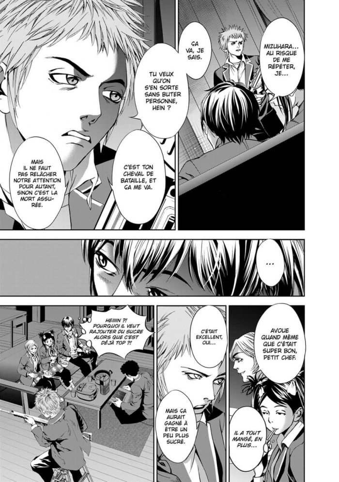 Vous avez aimé Battle Royale ? Vous reprendrez bien une petite dose létale version 2.0 ? 20 ans après, c'est sur une île-campus que la République d'Extrême-Orient va remettre le couvert pour "réguler les éléments posant problème". Cette île est régit par 'Sister', une intelligence artificielle qui va rapidement expliquer aux jeunes qui s'y trouvent les règles de ce nouveau "jeu". Là on se dit que ça sent la redite, mais petite subtilité, c'est cette fois-ci en équipe de 5 que nos protagonistes vont devoir combattre pour survivre : seul le groupe restant en vie pourra se sortir de cette nasse mortifère... Du coup ça change la donne ; ok, on est plus seul, mais ça veut aussi dire des embrouilles possibles en plus et du monde à gérer... Alors oui, on est dans un tome introductif où il faut bien planter le décor et le contexte, il faut aussi introduire les personnages et déjà approfondir certains d'entre eux. Pour autant, les premiers cadavres ne se font pas attendre, et les animosités non plus... Ambiance assurée ^^ Côté dessin, comme pour la série mère, on reste sur un dessin réaliste bien géré qui exacerbe les tensions et les situations dramatiques. Les scènes de violence sont bien traitées et enfoncent le clou... voire plus si affinités ! Bref, les amateurs de la série d'origine devraient s'y retrouver ; il faudra attendre sans doute quelques tomes pour voir si on évite les redites ou le copier/coller.