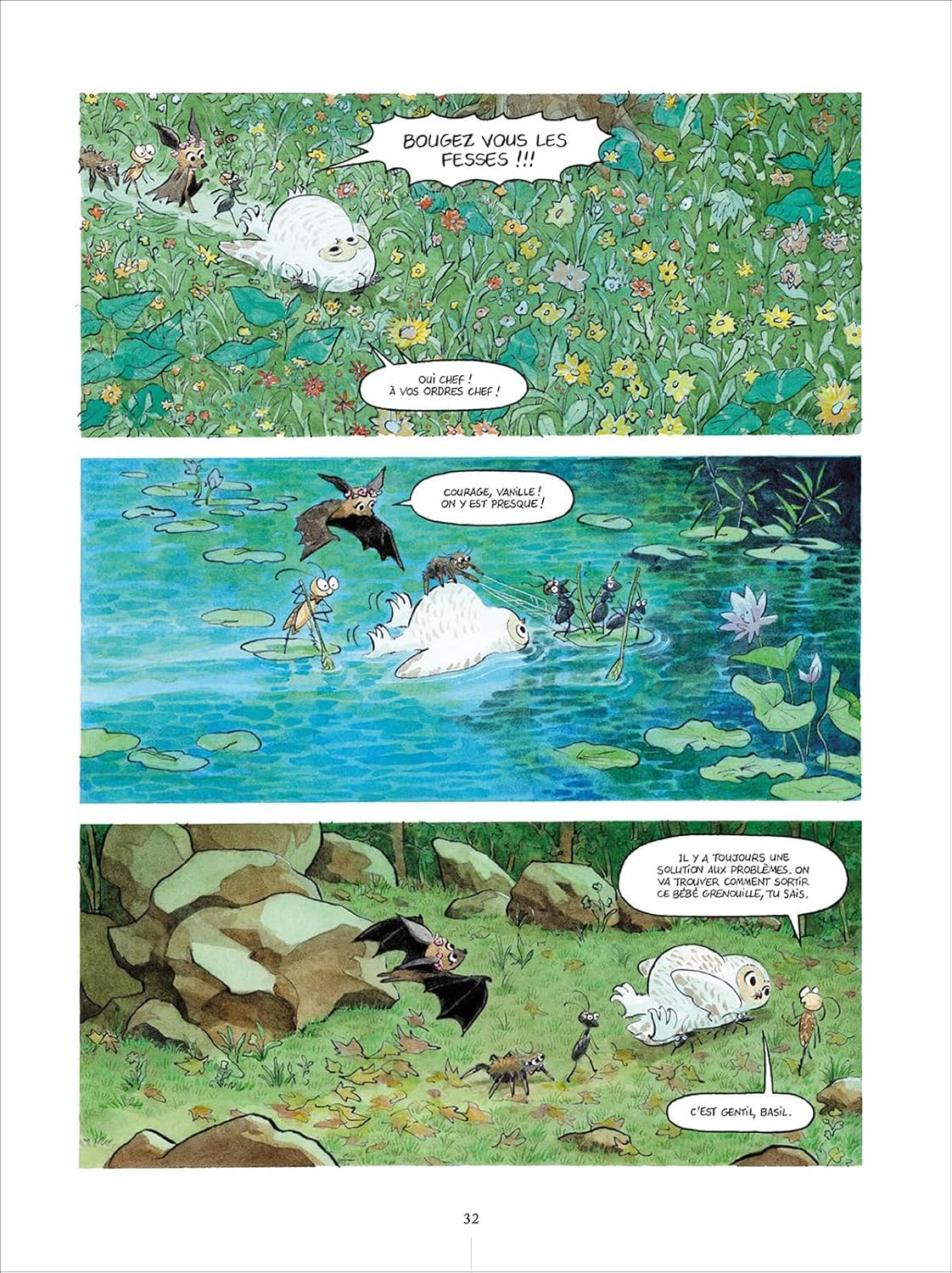 Dans la forêt de Greenwood, le Club du Samedi est une bande d'amis débrouillards, composée de jeunes animaux de différentes espèces qui s'entraident au fil de petites aventures du quotidien, entre concours de pâtisserie, enquêtes et imprévus. Au Chant des Grenouilles est une série concept dans le sens où elle réunit les mêmes scénaristes (Anaïs Halard et Barbara Canepa), tandis que chaque tome est confié à un dessinateur différent. Les six premiers albums sont ainsi illustrés successivement par Florent Sacré, Jérémie Almanza, Giovanni Rigano, Kerascoët, Alexis Nesme et Aurélie Neyret. Le graphisme constitue clairement le principal attrait de la série. L'ensemble est très soigné, avec une colorisation douce et travaillée, et l'on sent l'influence de Barbara Canepa dans la direction artistique. Chaque tome propose un univers visuel riche, avec de très beaux décors et une vraie atmosphère, renforcée par des planches parfois proches de l'illustration. J'aime également beaucoup la présence de la carte de la forêt et des lieux visités, qui participe à cette sensation d'immersion. Je suis en revanche plus mitigé sur le choix de multiplier les dessinateurs. Pris individuellement, chaque style a ses qualités, mais les différences sont suffisamment marquées pour créer une rupture assez nette d'un tome à l'autre. Cela m'a notamment frappé en passant du premier au second volume, avec une impression de changement d'ambiance et même de perception des personnages, dont les expressions et les visages ne renvoient plus tout à fait la même chose. Au-delà de ma préférence personnelle pour le style de Florent Sacré, cette variation nuit un peu à la continuité globale. Sur le plan narratif, la série propose d'abord un premier cycle en trois tomes, avant de basculer vers des histoires en un tome. Les intrigues restent assez simples et clairement orientées vers un jeune public. Pour un lecteur adulte, cela peut paraître un peu léger, avec des enjeux limités et un manque global de tension narrative. Le début de la série est notamment très introductif, avec une mise en place de l'univers et des personnages qui prend le pas sur une véritable intrigue, ce qui donne parfois l'impression qu'il ne se passe pas grand-chose. Le rythme constitue d'ailleurs un point un peu fragile. Le premier cycle m'a semblé légèrement étiré, alors que l'histoire en un tome du tome 4 (le dernier actuellement paru) est à l'inverse sont un peu trop vite lue. Malgré cela, l'ensemble est agréable à lire. Les dialogues sont plutôt naturels et bien écrits, et j'apprécie les petites pages à vocation éducative qui viennent enrichir le récit en présentant la nature, la faune ou même quelques recettes de cuisine. Il y a aussi des choix intéressants dans la composition du groupe, notamment la présence d'une araignée et d'une chauve-souris parmi les héros, ce qui change des habituels animaux plus consensuels. Le personnage de Shadow l'araignée, en particulier, est bien exploité et apporte une touche originale. En revanche, tous les protagonistes ne sont pas aussi attachants, et certains restent un peu en retrait ou manquent de relief, ce qui limite parfois l'implication dans leurs aventures. C'est une série visuellement très réussie, portée par une direction artistique forte et un univers plein de charme, mais dont les histoires peinent à proposer un véritable souffle narratif. Une lecture sans doute idéale pour un jeune public, mais qui laisse un peu sur sa faim lorsqu'on en attend davantage sur le fond.