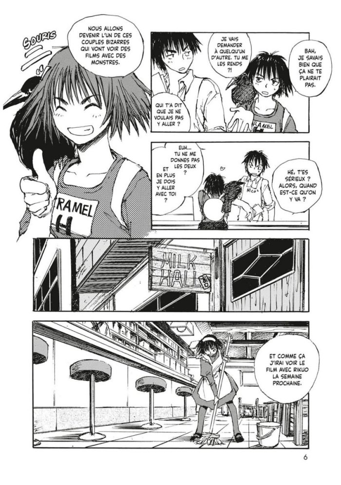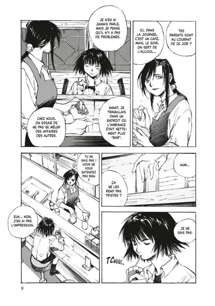 Pour commencer le dessin est vraiment laid, enfin "assez" laid parce qu'on a vu pire quand même. L'auteur a un style qui donne un aspect pas fini, crayonné que je n'aime pas. On a également parfois du mal à distinguer les personnages. Ensuite l'histoire ne m'a pas vraiment emballé non plus. En plus j'ai lu les tomes de manière assez hachée ce qui n'a pas aidé à resté concentré dans l'histoire. En réalité je ne pense pas avoir trop d'affinités avec ce genre d'histoires dans lesquelles au final il ne se passe rien. On se contente de décrire la vie de 4 ou 5 protagonistes avec une histoire de triangle amoureux, même si cet amour met bien du temps à se déclarer, pour finir quasiment en carré. Sans compter que je ne me reconnais pas du tout dans cette histoire ni dans aucun personnage. J'ai trouvé que les personnages n'avaient quasiment pas évolué en l'espace de 3 tomes. Lui toujours avec son petit boulot de merde même s'il commence à se mettre dans la photo, elle toujours avec son petit boulot de merde aussi et son corbeau. Bref la fin du 3 qui n'en est pas une il semblerait sinon c'est la pire fin que j'ai jamais vu ne laisse pas vraiment d'orientation sur la suite.