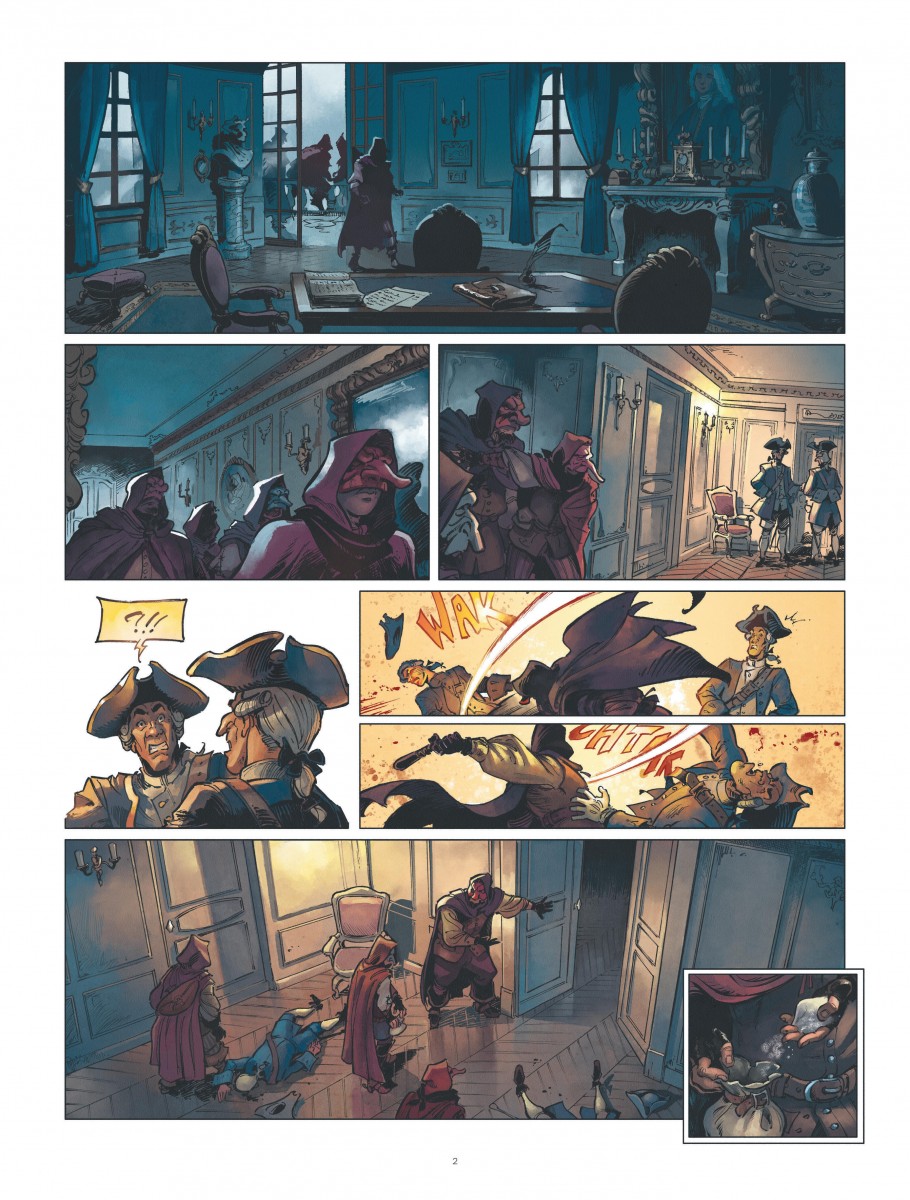 Une petite perle relativement passée inaperçue en fin d’année dernière qu’il est temps de réhabiliter. Le Secret du Roi se pose comme une série historique très romancée racontant en quelque sorte les premiers pas des services secrets au temps de Louis XV durant la Guerre de Sept Ans. Alors, ce n’est pas une uchronie où on modifierai le sens des grands évènements, nous sommes plutôt dans « l’Histoire secrète » où on nous cache des choses sur le comment cela s’est déroulé. Il y a de grosses libertés prises notamment concernant la technologie militaire, sans que l’on soit pour autant dans la SF le récit reste ancré dans le réel : et là l’inspiration est clair, c’est du James Bond avec le carrosse truffé de gadgets, des flingues improbables qui fonctionnent et ont une utilité, entrecoupé d’images et clins d’œil assez équivoques. Le récit réussit son pari d’être à la fois fun et entraînant, tout en restant tangible historiquement. De plus il y a de vrais bons rebondissements, cela fait du bien de lire une histoire qui s’écarte des sentiers battus. Les personnages sont bien campés, l’héroïne a du mordant, les seconds couteaux ont de la ressources, et les méchants… pas de spoilers :) Cet album nous laissant sur notre faim, il faudra attendre au moins le tome 2 pour connaître le fin mot de ce complot hourdi par la perfide Albion et ses cobelligérants. Dessins et couleurs m’ont tout de suite fait de l’œil, du semi-réaliste bien chatoyant qui me fait penser à du Eric Herenguel dans l’idée : c’est vachement généreux, après les proportions… chacun jugera. C’est dynamique comme se le doit un récit d’aventure, les personnages sont facilement reconnaissables, rien de négatif à redire là-dessus. En fait, tout est bien maîtrisé ici, juste, peut-être qu’un manque de pub fait que cette série n’a pour l’instant pas trouvé son public. Reste plus qu’à espérer que le bouche à oreille fera son effet.