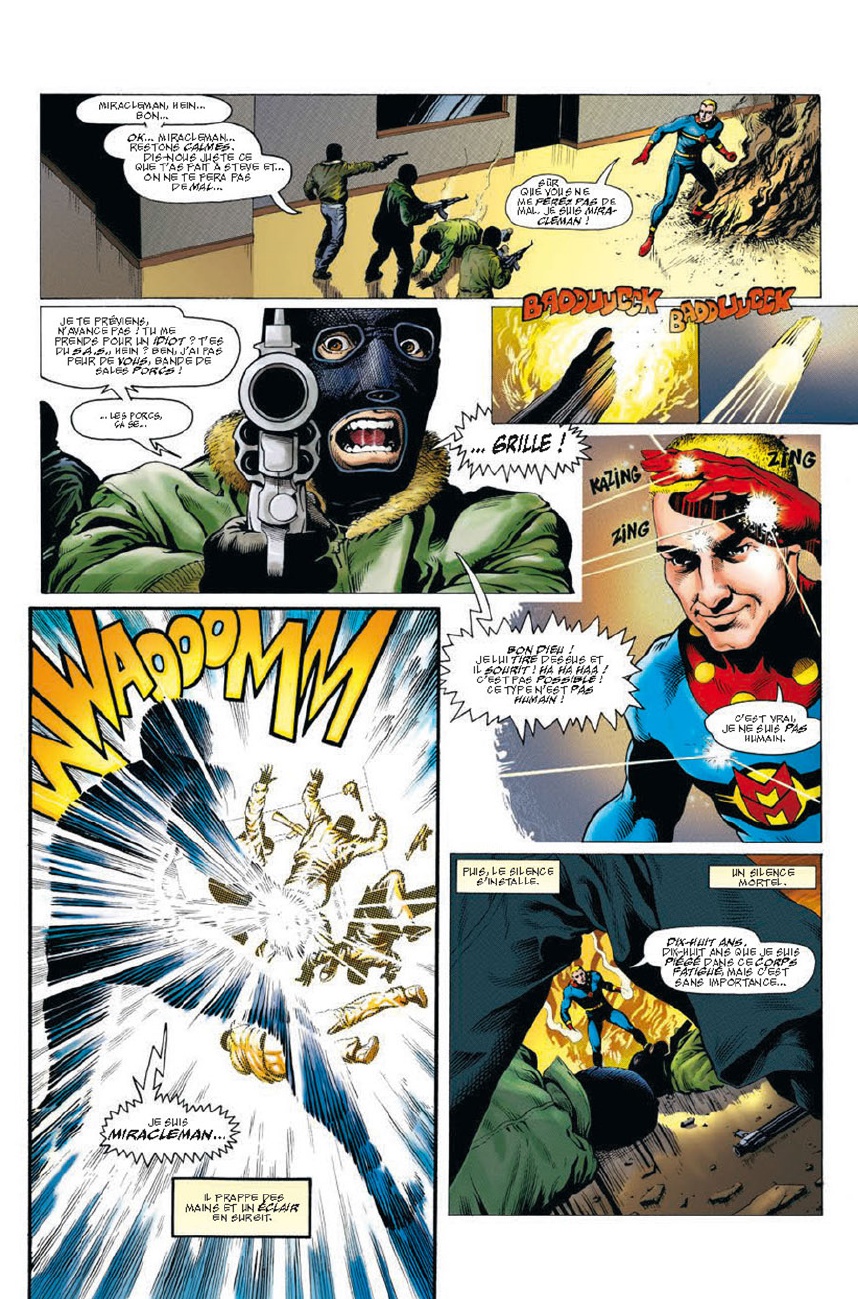Mon avis porte seulement sur le seul tome paru en France. Miracleman est un héros doté de pouvoirs surpuissants, après vingt cinq années d'amnésie il se souvient de ce qu'il était. C'est vrai que cette BD a un aspect vieillot vraiment poussé tant dans son traitement narratif que pour son aspect graphique, quand au fait que ce soit une oeuvre de réflexion qui préfigure plus ou moins Watchmen, j'en doute. C'est sûr que c'est un comic de super héros qui ne se contente pas de nous montrer des types costumés qui se castagnent sur des immeubles à new-york (en plus ça se passe à Londres), il y a des moments de doutes, les problèmes d'identification que rencontre Mike vis à vis de son alter ego Miracleman... à ce sujet le coup de l'amnésie est fort bien utilisé, il nous montre de façon assez simple qu'il est difficile d'être après avoir été. Une BD qui ne manque pas de soin c'est certain, je pense que son aspect "comic de l'age d'or" est voulu, que le costume dépassé (même en 1982) du héros l'est volontairement pour se démarquer du reste de la production plutôt bodybuildé et tape à l'oeil de ce qui se faisait à la même période. Moore ramenait ainsi doucement les surhommes vers un concept plus crédible, plus proche de monsieur tout le monde. Cela étant, il a fait largement mieux ensuite, sur le thème du héros quasiment invincible, Tom Strong va beaucoup plus loin tout en étant une BD très divertissante au premier degré. Cet album est de bonne facture, c'est sûr mais ce n'est pas un chef-d'oeuvre. J'aurais aimé pouvoir lire la suite quand même, surtout la partie dessinée par Totleben... mais bon c'est personnel, cet album fonctionne tout seul. A réserver aux fans de l'auteur, les autres risquent de n'y voir qu'une vieillerie sans trop d'intérêt.