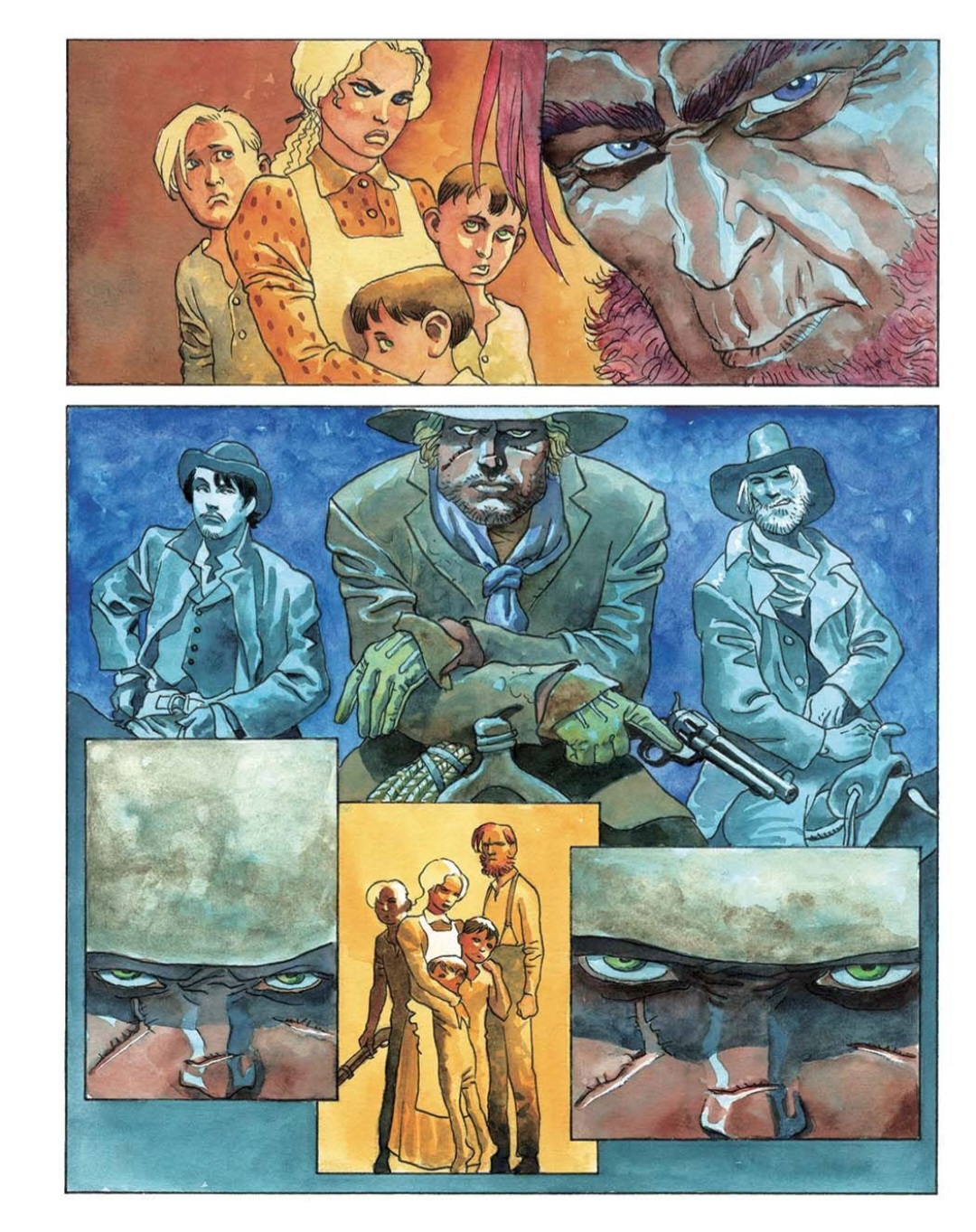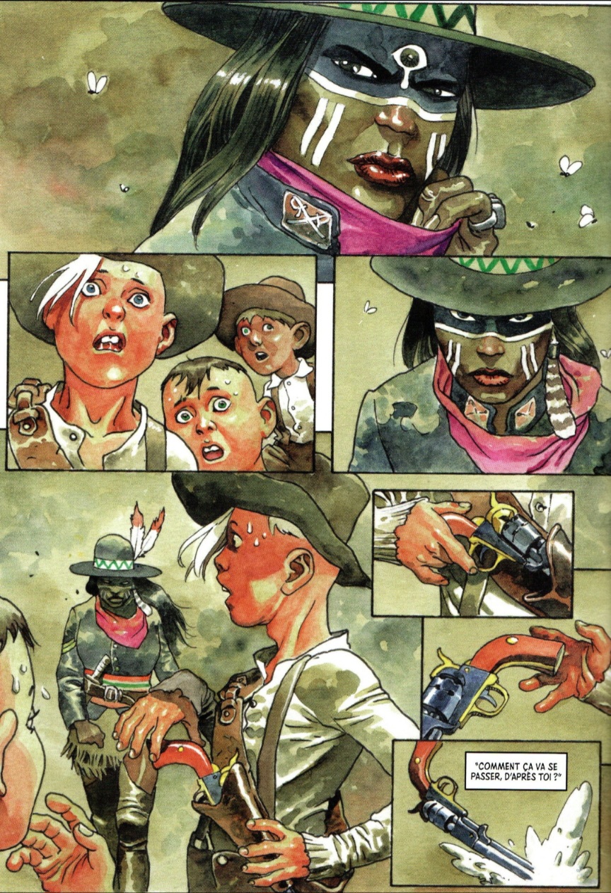 Un western aussi bon, beau et fort que Hoka Hey !. Je sais, je prends un gros risque en commençant de la sorte. Les auteurs de 100 bullets nous proposent une ballade et non une balade. Cette triste histoire est racontée par l'un des trois frères Blood, tel un long poème mélancolique et désabusé à la fin tragique. Il faut avouer que ce Far West ne fera de cadeaux à personne. Pour ne pas te gâcher la lecture - en te dévoilant les rebondissements qui vont parsemer le récit - je vais t'en dire le moins possible, juste faire une présentation des personnages. Les trois jeunes frères Blood vivent avec leur mère et leur père adoptif, un homme de dieu. Des gosses qui vont voir trois cow-boys, trois frères aussi, assassiner leur père adoptif et enlever leur mère. Ces trois cow-boys connaissent cette femme et l'un d'eux pourrait être leur père biologique. Les frangins Blood vont partir à la recherche de leur maman. Des personnages crédibles, complexes et très bien campés. Je vais faire un zoom sur cette femme, elle n'a rien de frêle et soumise, elle ne subit pas les événements, elle fait ce qu'il faut pour survivre. Une seconde mère, au tempérament bien trempé aussi, aura un rôle important, une comanche. Voilà, tu en sais assez. Une histoire touchante et une narration onirique, on va suivre en parallèle ces deux fratries où les liens du sang, mais aussi du cœur seront mis à rudes épreuves, où rien n'est totalement noir ou blanc. Un récit violent, mâture et maîtrisé. La boucle est bouclée avec cette dernière planche : "Je suis le fils de mon père". J'aimais déjà beaucoup le dessin de Risso, mais là, il monte le curseur à un niveau très élevé. L'utilisation de l'aquarelle et le choix des couleurs rendent ce récit immersif, dépaysant et profondément humain. Les cadrages et la mise en page permettent d'être au plus près de l'action et de ressentir les émotions des personnages. Superbe ! De nombreuses couvertures alternatives en bonus en fin d'album, par Risso, Jock, Dave Johnson, Gabriel Ba, Howard Chaykin... Un incontournable de 2025, je persiste et signe : un western aussi bon, beau et fort que Hoka Hey !. Note réelle : 4,5. Gros coup de cœur.
