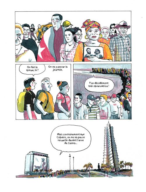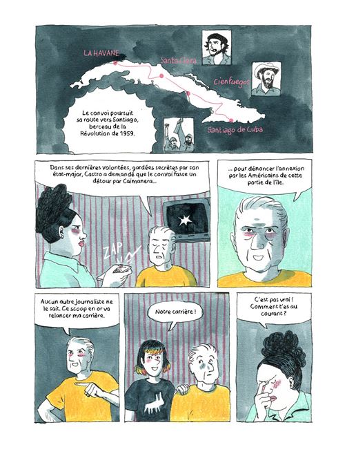 Au départ on pense qu'on va suivre deux journalistes partis à Cuba pour interviewer Fidel Castro. Un vieux baroudeur aguerri qui prend sous son aile une jeune pigiste, avec l'idée derrière la tête de lui transmettre les ficelles du métier de chasseur de scoops. Surprise à l'atterrissage : Fidel est décédé pendant qu'ils étaient en vol. Notre bonhomme ne se démonte pas et un scoop pouvant en remplacer un autre, il va faire jouer sa malice et son réseau pour essayer de dénicher une info qu'il serait le seul à couvrir, alors que tous les journalistes du pays son en route pour Cuba. C'est ainsi que commence ce récit qui va ensuite se diversifier pour entrainer le lecteur sur des chemins surprenants et variés. Le périple de nos journalistes sera l'occasion de raconter la vie de Fidel Castro, son parcours militaire et politique. Une petite biographie en quelque sorte... mais le spectre va encore s'élargir plus en nous racontant une partie de l'histoire récente de l'ile. Notamment la période de la guerre froide, les conflits politiques avec les USA, les problèmes d'embargo. Ce sera encore l'occasion de parler de la culture populaire de l'ile. Bref plus on avance dans le récit plus le cadre s'élargit, mélangeant fiction et cours d'histoire. C'est un peu surprenant, mais au final cela se révèle plutôt intéressant et original. Si quelques longueurs se font sentir dans le dernier tiers du récit, la fin plutôt inattendue redonne un peu de peps et d'intérêt à cette dernière partie. Au final cet album se distingue par deux aspects : son coté historique assez didactique et son originalité.