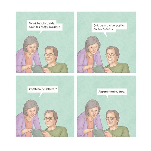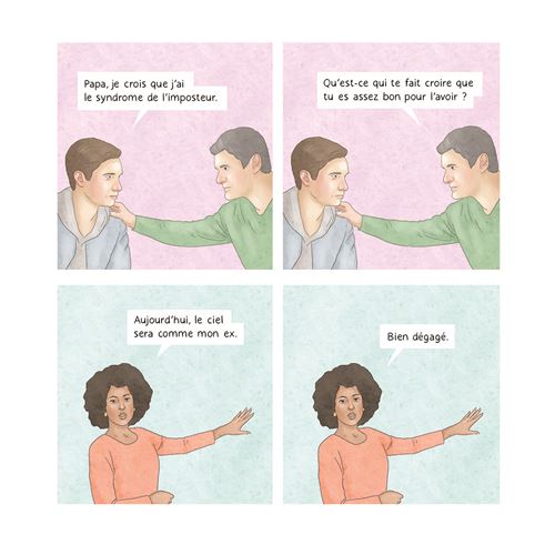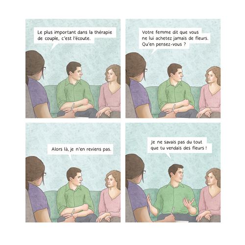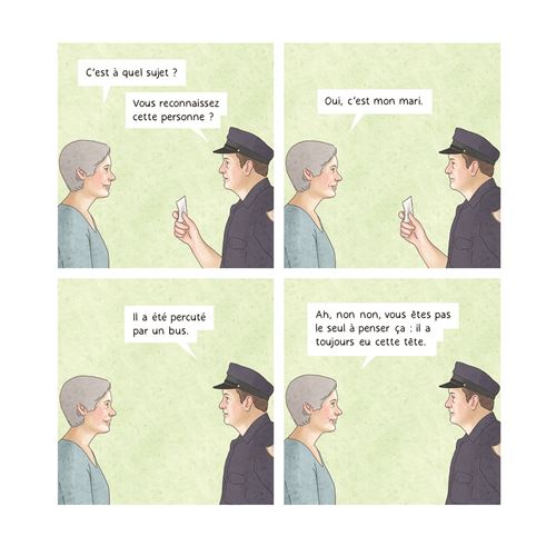 Quiproquos est un album de gags en une planche de 4 cases que l'auteure avait initialement dessiné pour les publier sur son compte Instagram. Il y a sans doute eu un petit succès sur la toile qui a attiré le regard de l'éditeur et amené Delcourt à publier les meilleurs sous forme d'album. Tous ces gags se basent globalement sur le même concept, celui qui donne son titre au recueil : le malentendu. En effet le ressort comique qui est utilisé ici tourne autour d'une incompréhension entre les protagonistes et ces quiproquos amènent la chute du gag. La recette est déclinée sur pleins de thèmes : la médecine, les relations humaines, l'entretien d'embauche, etc... Pour mettre en image ces gags, le dessin adopte un style minimaliste souvent dépourvu de décor, avec des poses très figées. Certaines cases sont parfois de simple copiées-collées les unes des autres. Ca rappelle un peu l'esprit absurde de Fabcaro, mais aucune comparaison n'est en fait possible. Nous avons ici un dessin froid et très informatisé qui est un peu anecdotique et n'apporte pas de plus particulier au propos. Une fois qu'on a dit tout ça : des dessins tirés de post Instagram, un dessin informatisé sans charme particulier, on pourrait se méfier un peu... Et pourtant ! Car en fait, c'est plutôt rigolo. On sourit de bon coeur, assez souvent, voire même on rigole bien, de temps en temps. - Je dois t'avouer quelque chose, parfois je ne supporte pas mes enfants - Ne t'inquiètes pas ça m'arrive aussi - C'est vrai ? - Oui je ne supporte pas tes enfants non plus Ca me fait rire. Et ça tient la longueur sur les 100 pages de l'album. Evidement comme tous les recueils tirés de gags publiés unitairement sur des blogs ou autres réseau sociaux, c'est pas toujours heureux d'en enchaîner la lecture de 60 à la suite. Mais en plusieurs fois ça passe bien et au final on a ici plutôt une bonne surprise.