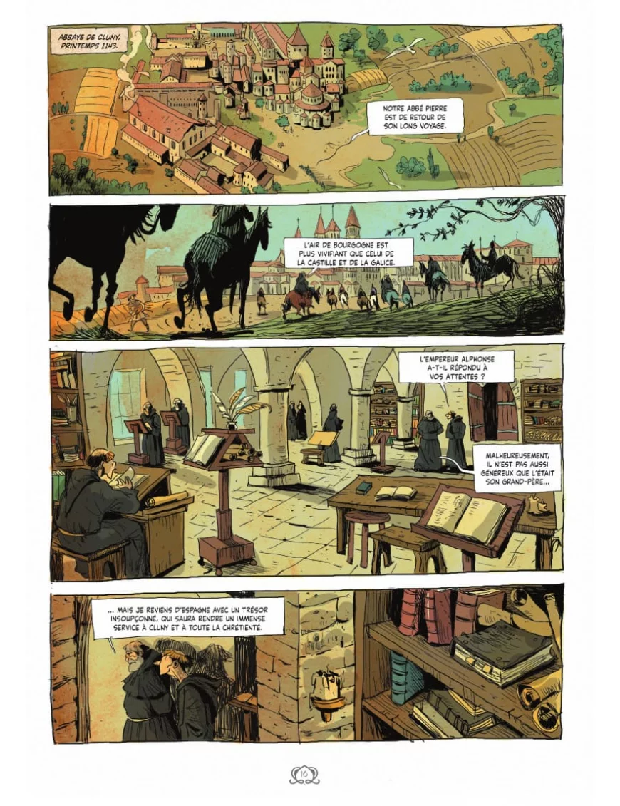Les six ans du projet n’ont pas été de trop. - Cette bande dessinée constitue un documentaire sur l’histoire du Coran en Europe. Son édition originale date de 2025. Il a été dessiné par Ernesto Anderle, sous la direction de Maurizio Busca & John Tolan, avec le comité scientifique composé de Mercedes García-Arenal, Jan Loop, John Tolan et Roberto Tottoli, avec un suivi éditorial assuré par Tristan Martine & Pauline Veschambes. Il comprend environ cent pages de bande dessinée, réparties en douze chapitres, chacun comprenant un court paragraphe de texte en introduction et deux pages de documentations complémentaires en conclusion. Il se termine avec une riche bibliographie de quatre pages, recensant chaque source utilisée, chapitre par chapitre, et deux pages de présentation d’autres ouvrages de l’éditeur. Sa lecture ne nécessite aucune connaissance préalable sur le sujet, ni sur la foi en général. Le Coran en Europe. Le Coran est présent en Europe depuis que les troupes arabes et berbères du général Tariq firent la conquête d’une partie de la péninsule ibérique en 711. Au Moyen-Âge, une partie importante de la population de l’Espagne et de la Sicile est musulmane. À partir du XIVe siècle, l’empire ottoman s’étend entre les Balkans et en Europe centrale, déclenchant dans ces régions une présence importante de Musulmans qui dure jusqu’à aujourd’hui. Au XIXe siècle, les puissances coloniales européennes dominent un grand nombre de pays musulmans ; au XXe siècle dans un contexte de décolonisation, de nombreux Musulmans de ces anciennes colonies émigrent en Europe. Le Coran fait partie de la vie quotidienne de ces Musulmans européens, mais il suscite aussi l’intérêt des non-musulmans : Chrétiens, Juifs ou Athées. Le livre les fascine, les intéresse, parfois leur fait peur. C’est l’histoire de ces réactions complexes et variées dont il est question dans les pages qui suivent. Les origines du projet – John Tolan est professeur d’Histoire à l’université de Nantes, il vagabonde entre les milieux universitaires de l’Amérique du Nord, de l’Europe et du monde arabe. Il étudie les échanges entre civilisations latines et arabes au Moyen-Âge et bien au-delà. Il aime casser les stéréotypes, que ce soit sur l’Islam ou sur l’époque médiévale. Avec Jan Loop, professeur d’histoire religieuse à l’université de Copenhague, Mercedes García-Arenal, historienne des échanges culturels dans l’islam, le christianisme et le judaïsme, et Roberto Tottoli, spécialiste de l’Islam, ils montent un groupe de recherches à Madrid le quinze septembre 2017, et bâtissent le projet de recherche sur le Coran en Europe. La première traduction latine du Coran – Pendant un voyage dans la péninsule ibérique, effectué en l’an 1142, l’abbé de Cluny, Pierre le vénérable, rencontre deux célèbres traducteurs d’ouvrages scientifiques de l’arabe vers le latin : Robert de Ketton et Herman de Carinthie. Soucieux d’établir un fonds de connaissances de l’islam basé sur des sources fiables et non sur des légendes, il charge les deux savants de traduire des textes clé de l’islam dont le Coran : c’est la première traduction latine de ce texte. Une illustration de couverture magnifiquement ouvragée qui met en avant le mot Safar (Voyage, en arabe), différents personnages comme composant le cadre autour du titre, et le livre du Coran ouvert sur un présentoir. S’il feuillète au préalable cette bande dessinée, le lecteur constate qu’il commence par une double page de texte avec des illustrations, puis deux pages présentant les quatre directeurs du projet avec de toutes petites cases de dessins, et de gros phylactères. Vient alors le sommaire sur deux pages, listant les douze chapitres, avec à chaque le nom du ou des chercheurs l’ayant écrit : La première traduction latine du Cora, un frère florentin à Bagdad, Un Coran trilingue, Le livre des Morisques, de L’Ibérie à Rome Léon l’Africain et le Coran, Luther et le Coran latin de Bibliander, L’importance de faire une bonne impression, Philologues, antiquaires, polyglottes et autres exégètes, Les livres de Buda, La beauté du Coran, Le Coran de Napoléon, Abraham Geiger et le tournant scientifique au XIXe siècle. Chacun des douze chapitres s’ouvre avec son titre et un court paragraphe introductif, la bande dessinée commençant dans la page suivante, et comprenant sept pages, sauf trois chapitres à cinq pages et un à huit pages. En fin de chaque séquence, se trouvent des développements historiques sous forme d’un texte avec des illustrations. Par exemple pour la première, sur L’abbaye et de Cluny et l’Islam, les deux traducteurs du Corpus islamolatinum, Le voyage de Pierre le vénérable, une carte, un encart avec l’adresse internet pour lire cette première traduction. Le lecteur ressent immédiatement qu’il s’agit d’un ouvrage de vulgarisation d’une recherche universitaire. Passé l’introduction et la présentation des auteurs, il retrouve les caractéristiques narratives d’une bande dessinée. D’un côté, quatre experts de recherche universitaire, un projet financé par le Conseil Européen de Recherche (ERC), la constitution d’un équipe composée d’une quarantaine de chercheurs, doctorants et post-docs pour une durée de six ans, un colloque de lancement en octobre 2019 à Naples, œuvrant sur des sujets allant de la paléographie arabe à des récits de voyage… et la ferme intention de faire connaître leurs recherches au-delà du monde des chercheurs : une exposition itinérante à travers toute l’Europe et pourquoi pas… une BD. De l’autre côté, un support avec ses propres caractéristiques, et un éditeur qualifiant l’ouvrage de Docu-BD. Le lecteur apprécie rapidement cette manière de structurer en l’ouvrage, en allégeant l’exposition dans la partie BD, en illustrant les