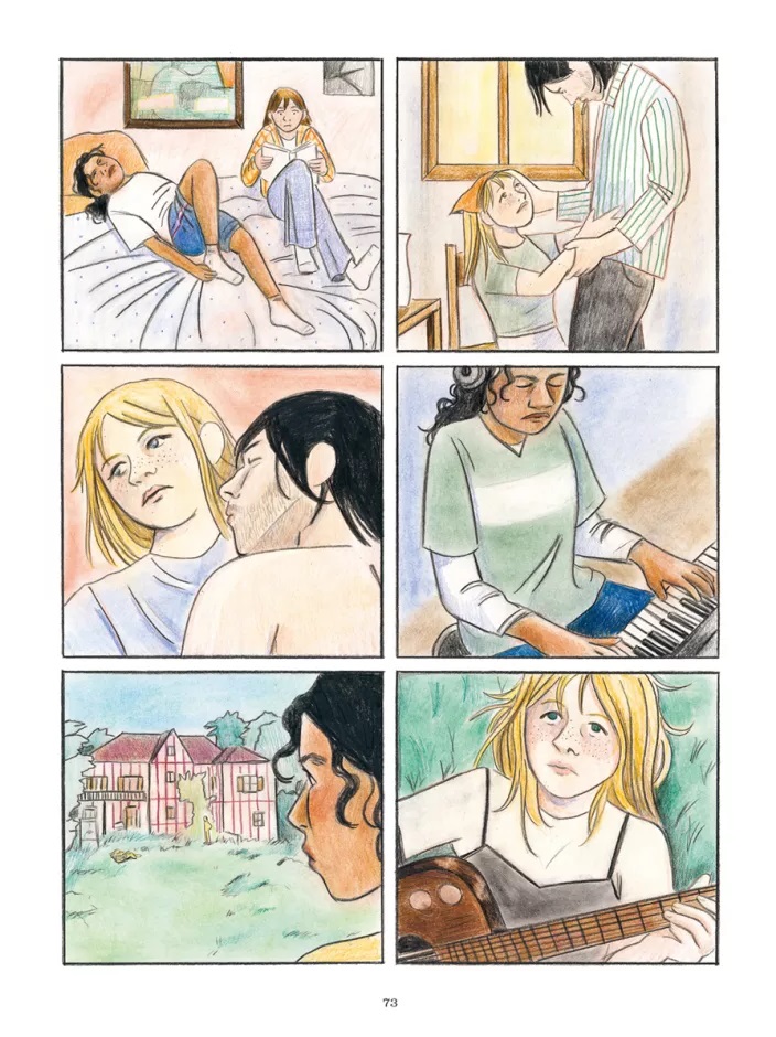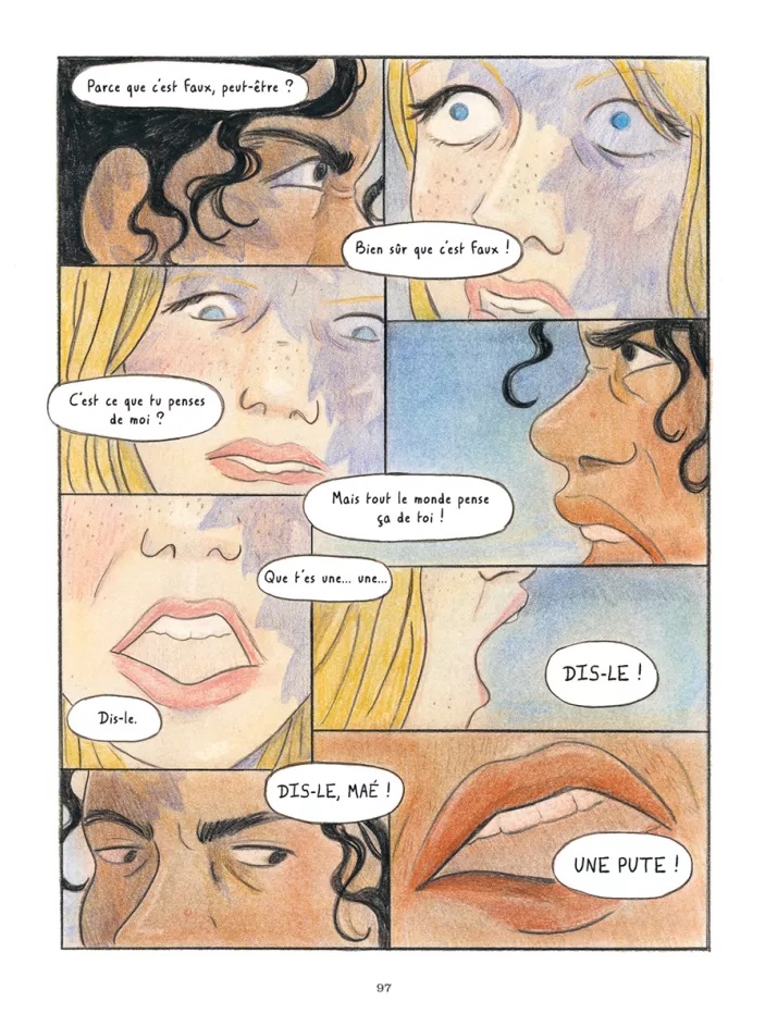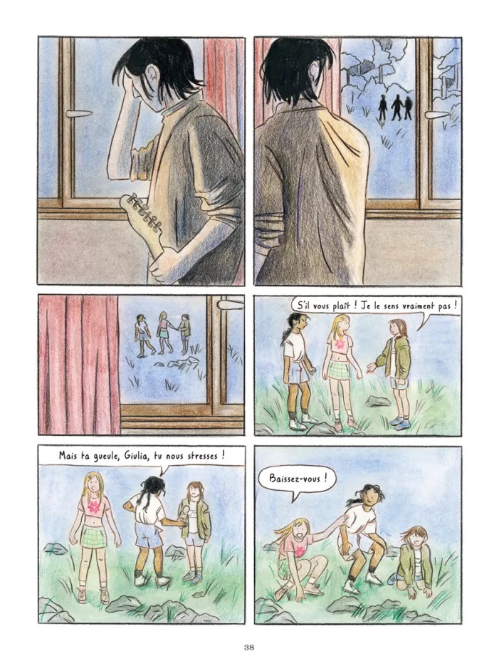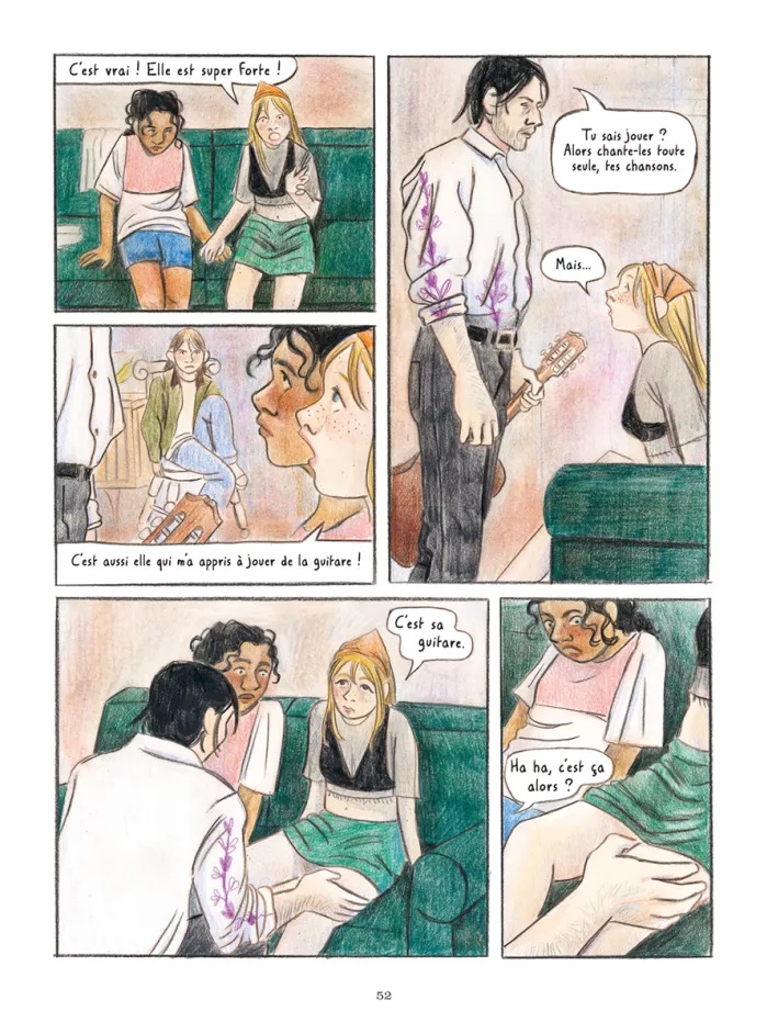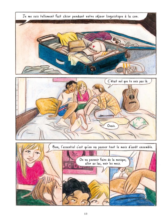Je n'ai jusqu'alors pas eu la chance de lire La Falaise, premier roman graphique a priori fort réussi mais déstabilisant, de Manon Debaye. Cette seconde œuvre retint néanmoins fortement mon attention : le style visuel m'attirait assez (un trait fin, précis et pourtant peu assuré, associé à de délicates couleurs crayonnées), la thématique musicale me réjouissait évidemment (des ados fans d'un musicien rock, composant elles-mêmes de la musique), le sujet féministe (le regard des hommes sur les corps féminins, ici adolescents), brûlant en cette rentrée littéraire, réclamait idéologiquement et professionnellement mon attention. Ce fut un choc ! De ces BD qui, une fois refermées, vous laissent coi quelques instants, les yeux possiblement humides de colère, l'esprit et les idées s'agitant frénétiquement, pour recréer du lien avec les thématiques sociétales contemporaines et les combats à mener, avec des souvenirs de lectures, films ou chansons ravivés. Manon Debaye est parvenue en quelques situations, à dresser un portrait assez juste de trois amies dissemblables et longtemps inséparables. Ce qu'elles se confient, ce qu'elles cachent, les personnalités des unes et des autres via les ascendances, décisions et prises de parole. Mais ici, contrairement à la merveille de Vanyda Celle que..., la cruauté affleure de toute part installant un malaise jusque dans des situations espérées rêvées (comme celle de la rencontre avec leur idole). Le véritable sujet s'impose alors : comment le regard des hommes sur les femmes façonne le monde, les corps, les attitudes... influençant sournoisement jusqu'au regard des mères ou celui des meilleures amies, atteignant naturellement l'estime de soi. La BD choisit d'aller vers le terrible drame, sans spectaculaire, ni panache, en demeurant dans un effroi glacial et contenu. La seconde partie évoquera l'après, la culpabilité, la reconstruction, la résilience, l'impossible oubli. Mini faiblesse du récit et des illustrations, ces destins brisés ne nous apparaitront pas avec clarté, les nouveaux visages entraperçus (ou vieillis ou appartenant à de nouveaux personnages), pas toujours aisément identifiables, créeront un doute et une distance, pas inintéressants d'ailleurs car renforçant l'impact du retournement de situation final. Et permettant furieusement d'insister sur les déterminismes sociaux engendrant honte et silence plutôt que colère et combat, sur l'affreuse réalité de ces situations tristement communes, peu perceptibles pour un œil extérieur même bienveillant. BD féministe importante, qui s'inscrit dans une urgence (au même titre que "Notre affaire", "Les Yeux d'Alex", Rouge signal, "Une obsession", "Ces lignes qui tracent mon corps"...), une dynamique sociétale contemporaine chamboulant enfin le petit monde de la BD, longtemps demeuré en retrait sur ces sujets.