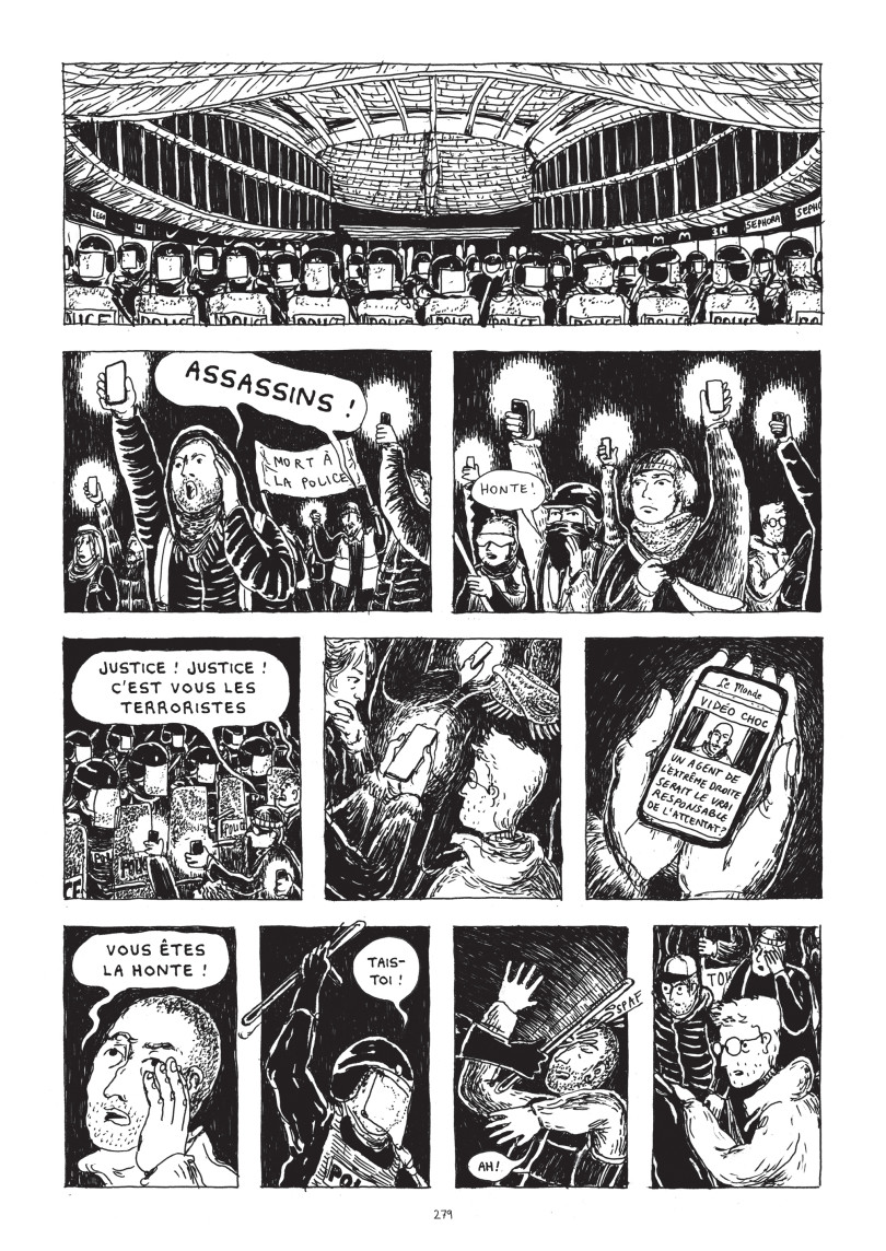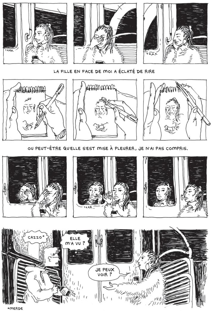 L’album est épais (350 pages quand même !), mais il se lit assez rapidement. Il y a peu de texte – et pas mal de pages qui en sont dépourvues – et l’histoire se révèle finalement plus limpide que je ne le pensais (craignais) au départ. Car la narration use de certains flash-backs qui, un temps, m’ont un peu dérouté, m’obligeant parfois à quelques retours en arrière pour vérifier certains détails. Démarrée comme une sorte de roman graphique avec histoire d’amour compliquée, l’intrigue se transforme peu à peu en thriller, autour de l’action d’activistes (de « L’écran blanc », référence à leur mode d’action, des manifestations/flash-mobs non violentes se mettant en place grâce aux réseaux sociaux). Le personnage principal est une sorte d’alter-égo de l’auteur, comme lui immigré italien féru d’architecture et de dessin. L’intrigue se déroule dans un Paris très légèrement futuriste (quelques années « d’avance » tout au plus), alors qu’une « Présidente » développe une société phagocytée par un pouvoir autoritaire et liberticide, contre lequel les activistes déjà cités se lèvent. Jusqu’à ce qu’un attentat ait lieu. Le récit s’articule autour de cet attentat, juste avant, pendant et après. Avec des questionnements sur les méthodes d’actions, quelques retours sur Mai 68, etc. Si Pinto semble s’inspirer pour la Présidente de l’italienne Giorgia Meloni, on peut aussi penser à une Marine Le Pen au pouvoir – tant les personnes et programmes se ressemblent. Le récit est agréable, fluide, et dynamique, même si, passé le début étonnant et les petits soucis de découpage, il se révèle moins original qu’escompté. Le dessin de Pinto, un style moderne et presque « amateur » par endroits (en tout cas un dessin nerveux, jouant sur des esquisses, comme « jetées » sur un carnet comme le fait le personnage principal, qui portraitise à la volée des passagers du métro) est vivant et au final original et agréable, malgré certains défauts. Un album – et un auteur – à découvrir.