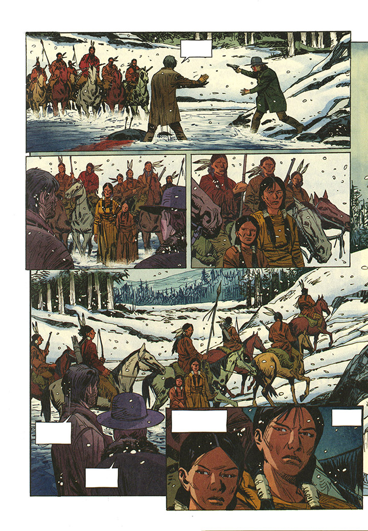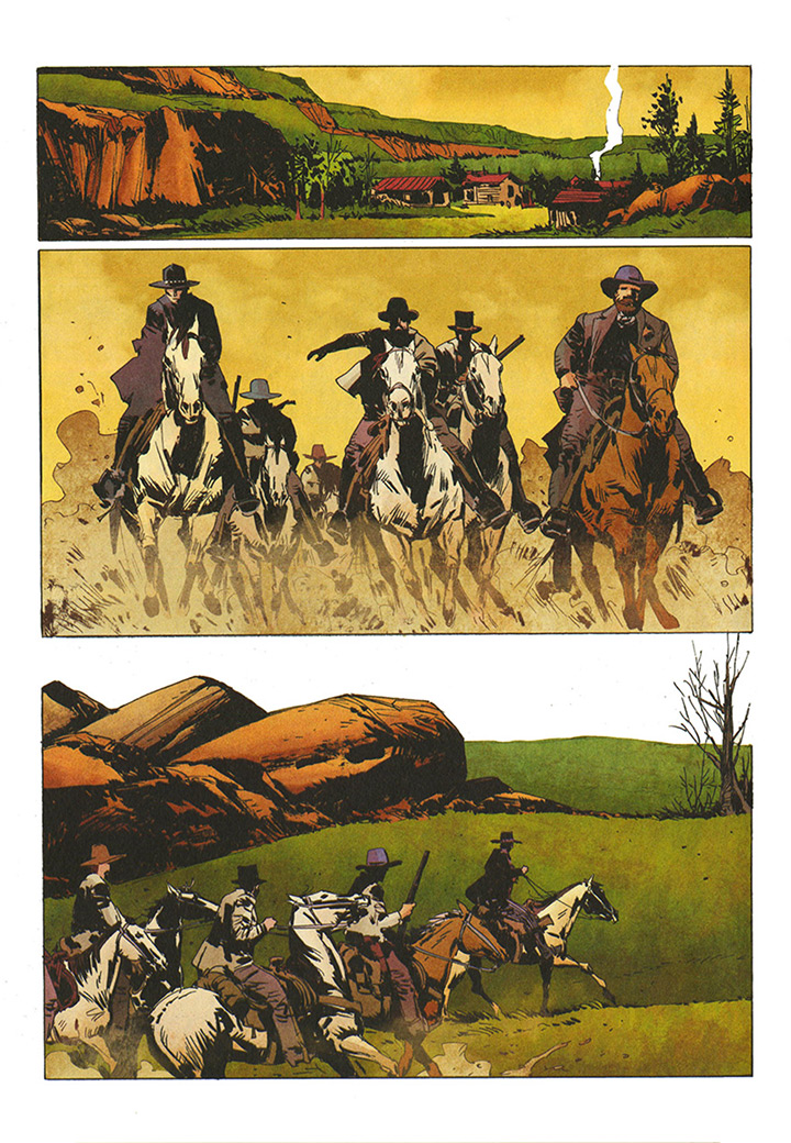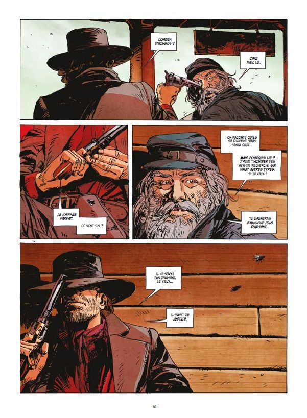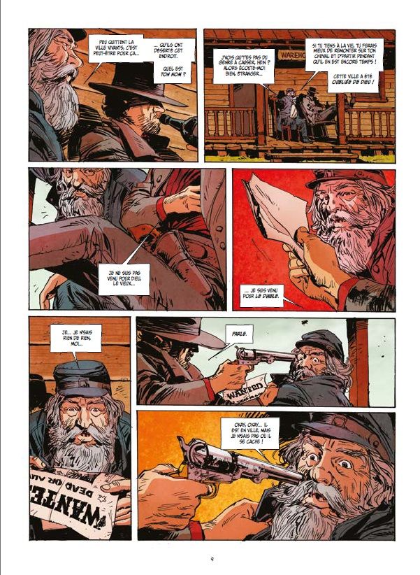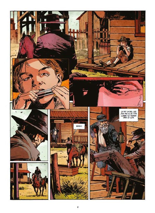 Un western très classique. On va suivre l'histoire d'un homme, de son enfance à sa mort. Le récit est divisé en quatre chapitres bien distincts. Le premier se penche sur son enfance qui fera de lui un être impitoyable. Le second, de sa vie de chasseur de primes à celle de bandit. Le troisième, de sa période trappeur et de rédemption. Et le dernier est un pont qui relie les trois précédents. Un récit violent qui ne révolutionne pas le genre avec des ingrédients tels qu'un duel aux revolvers, une attaque de train et la présence des comanches. Un récit agréable à lire, la narration alterne les scènes de violence et celles plus calmes qui prennent le temps de développer ce loup solitaire. Le scénario est un peu maladroit sur deux/trois scènes. Un récit où les clins d'œil (tic d'un des personnages) au cinéma sont nombreux. D'abord avec ce nom de ville : Eastwood. Mais j'y vois surtout un hommage à Henry Fonda (qui pour moi est l'âme du western, bien plus qu'un pâle John Wayne), on ne connaîtra jamais le prénom de cet homme ("Mon nom est personne"), le duel avec les gros plans sur les yeux bleus azur sous l'ombre du chapeau ("Il était une fois dans l'ouest"), et le prénom Frank (toujours dans "Il était une fois dans l'ouest", mais aussi dans "Le brigand bien aimé" et "Le retour de Frank James"). Je peux me faire un film aussi. ;-) C'est avec plaisir que je retrouve Pedro Mauro après L'Homme de la loi, il a un style qui convient très bien au western. C'est classique mais avec une touche de modernité avec son trait sale et sa colorisation réussie. Le dépaysement est garanti avec le soin apporté aux décors, surtout ceux aux grands espaces. Une mise en page cinématographique. Du très bon boulot. Pour les amateurs du genre. Note réelle : 3,5.