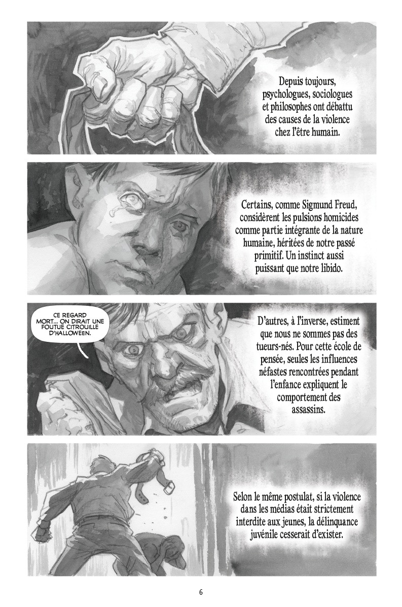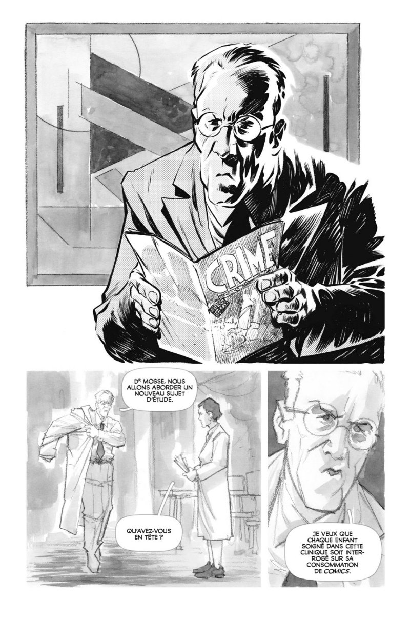 Plutôt fan du coup de crayon d'Eric Powell, j'étais curieux de découvrir cette biographie du Dr Wertham, personnage que j'avais découvert grâce à une autre BD : Fredric, William et l'Amazone de Jean-Marc Lainé et Thierry Olivier. Dans cet album j'avais découvert ce personnage parti en croisade contre les comics en plein Maccarthysme s'affrontait avec William Moulton Marston, le créateur de Wonder Woman, qui défendait lui l'intérêt pédagogique de ces créations. Ici, point de William Moulton Marston, on se recentre sur Fredric Wertham, un psychiatre d'origine allemande gorgé d'ambition qui va immigrer aux Etats-Unis et s'imposer au fil des ans comme un spécialiste des criminels. Car s'il est avant tout connu pour sa guerre contre les comics, Fredric Wertham fut avant tout un spécialiste des tueurs en série ; c'est ce que montre parfaitement la première partie de l'album. C'est en cherchant à déterminer les causes et les influences menant au crime que le Dr Fredric Wertham va se focaliser sur les comics qui apparaissent et pullulent après-guerre. Ce sont pour lui la cause de tous les maux de cette jeunesse dévoyée... Si c'est ce fanatisme qui restera comme image du personnage, nos auteurs n'en oublient pas pour autant la part humaniste de Wertham. C'est en effet grâce à lui que la ségrégation à été supprimée dans les écoles ou encore qu'il fût l'un des premiers à ouvrir une clinique psychiatrique pour les défavorisés à Harlem. En tout cas, voilà un album, un brin bavard, mais qui met en lumière un personnage central de l'histoire de la BD américaine. Peu s'en est fallu que celles-ci disparaissent sous ses coups de boutoir, aboutissant tout de même au fameux Comics Code Authority. Le graphisme d'Eric Powell est parfait pour l'exercice, avec cette colorisation tout en sepia, rendant à merveille le côté autoritaire du personnage et l'ambiance de chasse aux sorcières de l'époque.