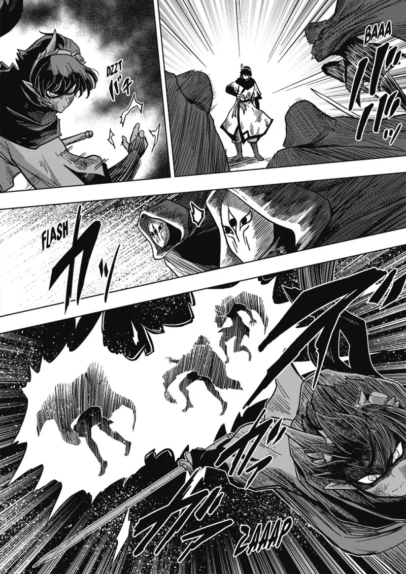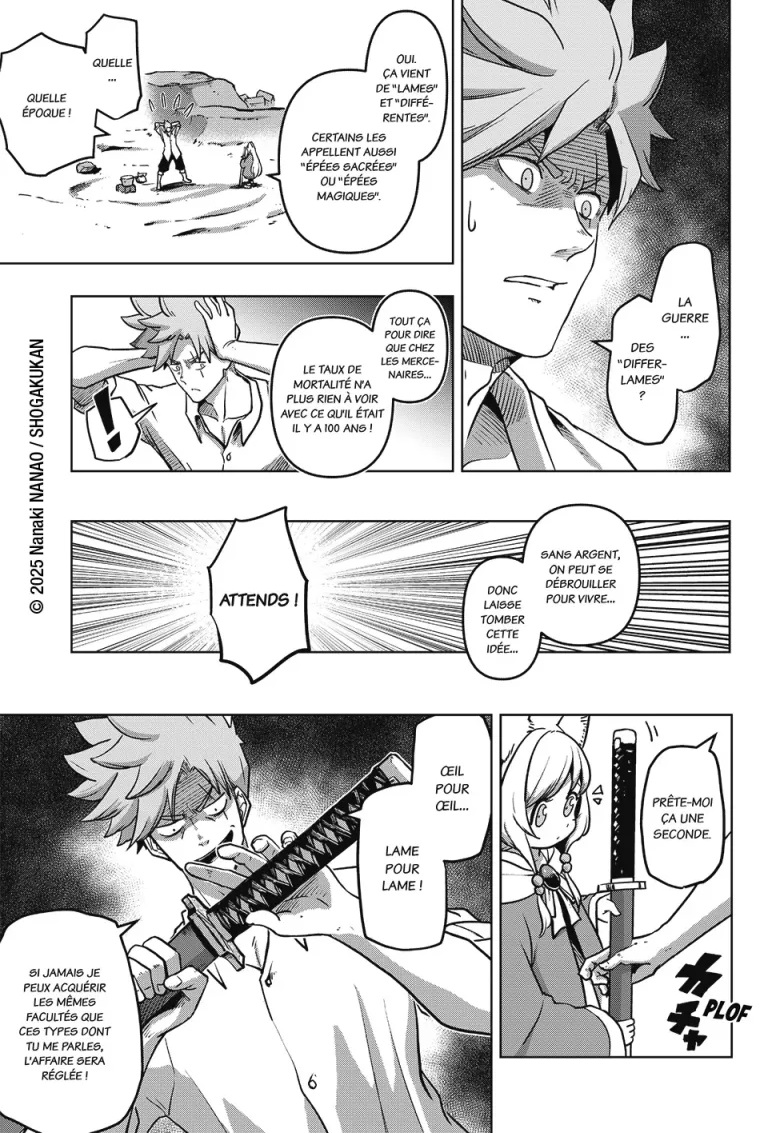 Dans un monde obscur de fantasy, un mercenaire vétéran découvre l'existence de guerriers dont la puissance dépasse largement celle des humains. Alors qu'il échappe de justesse à la mort, il est sauvé par une jeune fille aux oreilles de renard, dotée de pouvoirs extraordinaires. Tous deux sont projetés un siècle dans le futur, dans un monde dévasté par la guerre que se livrent les détenteurs d'armes sacrées, sources de cette force surhumaine. Pour survivre, le mercenaire et sa mystérieuse protectrice s'installent dans une région isolée et ouvrent une taverne, espérant ainsi attirer des épéistes et, peut-être, mettre la main sur la lame sacrée qui conviendra enfin à notre héros. C'est un récit d'heroic-fantasy qui entretient longtemps ses zones d'ombre. D'où viennent ces armes sacrées ? Qui est réellement cette jeune semi-humaine si puissante ? Pourquoi protège-t-elle avec autant d'acharnement un mercenaire en apparence si banal ? L'auteur choisit délibérément de ne pas répondre tout de suite, allant jusqu'à forcer artificiellement la situation en faisant refuser au héros de poser des questions alors même que sa protectrice détient les réponses. De ce fait, le lecteur reste longtemps dans l'incertitude quant à la direction que prendra l'histoire. Quête épique d'un élu destiné à rétablir la paix ? Constitution d'un groupe de héros qui s'uniront contre le Mal ? Récit de kingdom building où l'intrigue se limiterait longtemps au développement de la taverne et de son domaine ? Ou encore jeu de manigances complexes où le mercenaire ne serait qu'un pion manipulé ? Toutes les possibilités semblent ouvertes, mais l'attente finit par créer un léger sentiment d'artificialité dans une intrigue qui paraît parfois cousue de fil blanc. Je reste donc partagé quant à mon avis sur la série. Elle se lit agréablement, bénéficie d'un dessin de qualité (même si les décors restent assez simples), et suscite malgré tout la curiosité : on a envie de découvrir où tout cela va nous mener.