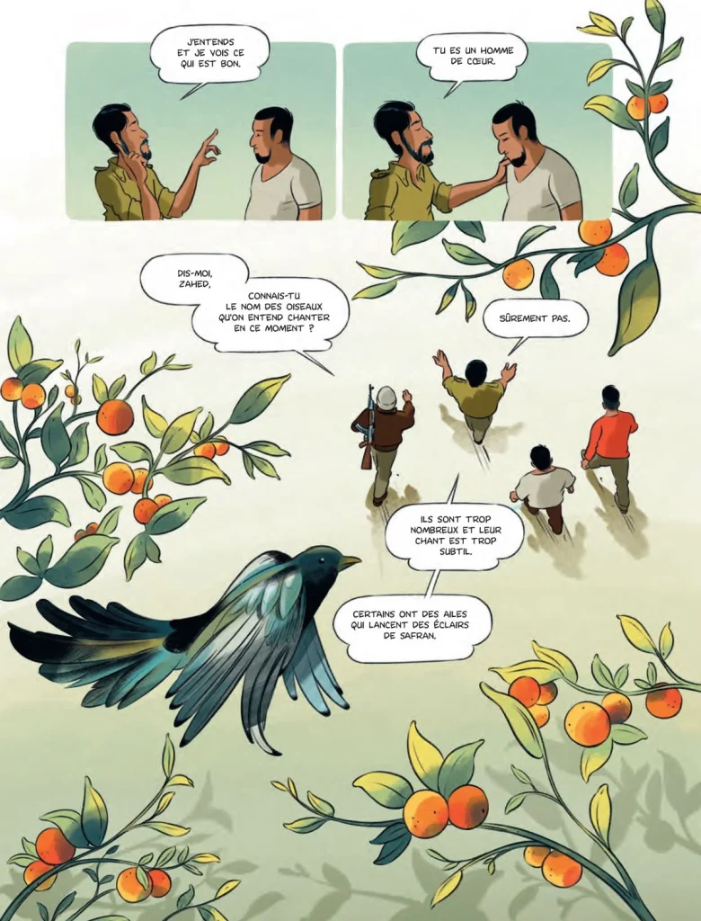 Amed et Aziz, frères jumeaux de neuf ans, vivent paisiblement à l'ombre des orangers. Mais un jour, un obus traverse le ciel, tuant leurs grands-parents et s'emparant de leur enfance.
