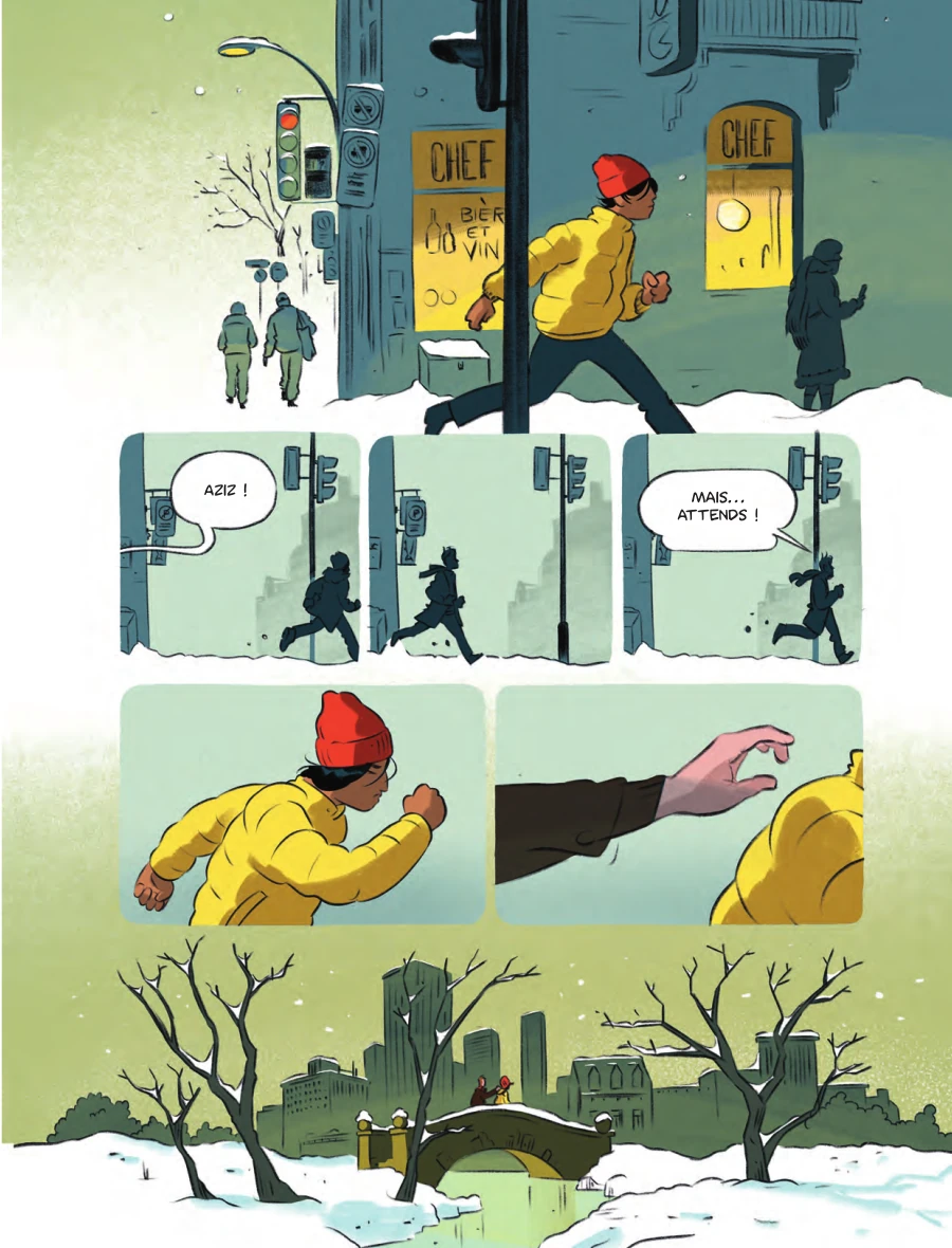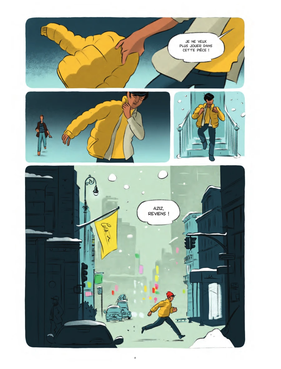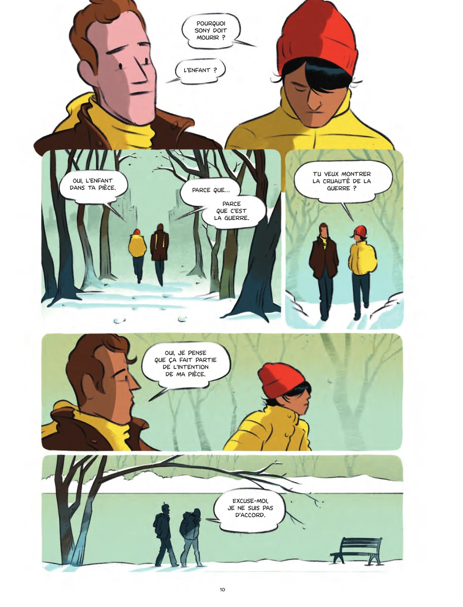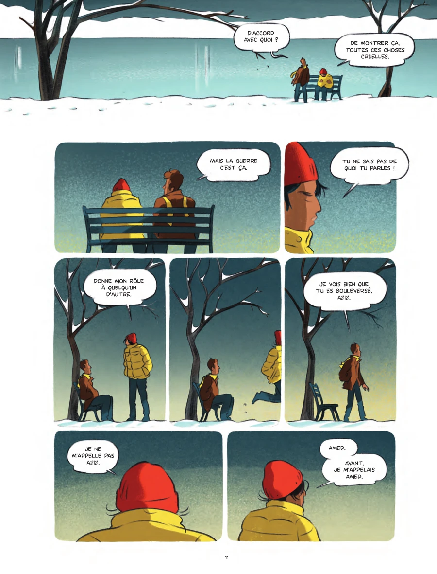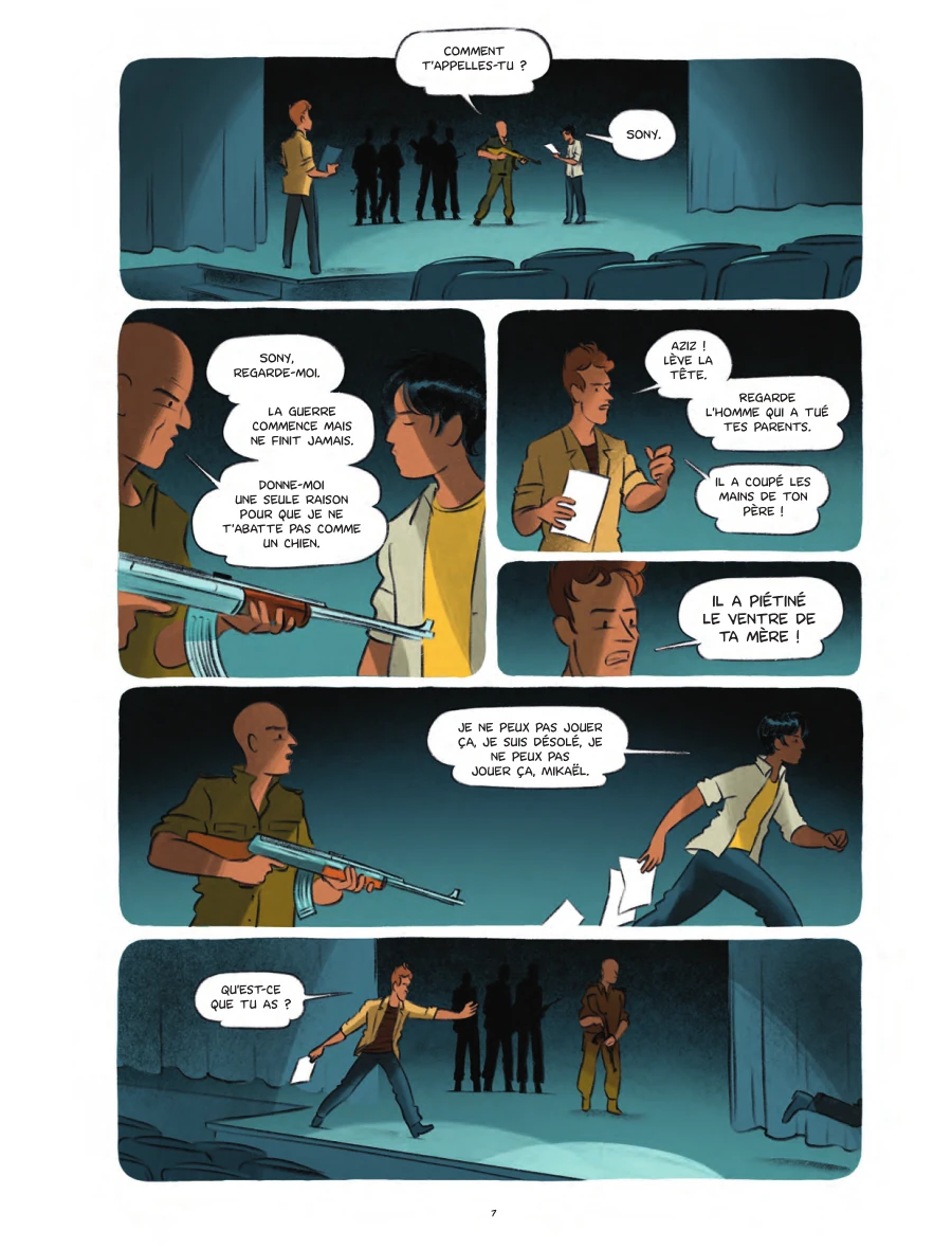 Achetée un peu à l’aveuglette pour mon boulot sur la foi d’un papier plutôt favorable, cette BD m’a conquis. Je ne connaissais pas du tout le récit original, mais les auteurs évoquent un sujet d’actualité douloureux (le terrorisme en l’occurrence) qu’ils parviennent à élever au-dessus d’un contexte précis et à rendre accessible à un public plus jeune. Bon, graphiquement, j’avoue, ce n’est pas la grosse éclate, même si le dessin est tout à fait correct. Disons que l’ensemble manque un peu de personnalité, et le trait d'un peu de finesse, et que vu le style, on aurait apprécié davantage de détails. C’est surtout le scénario qui marque les esprits, ainsi que son cheminement émotionnel. L’histoire commence lors d’une répétition de théâtre qui voit l’un des acteurs quitter la scène précipitamment, affirmant qu’il est incapable de jouer le rôle qui lui est assigné. Le metteur en scène le rattrape, et notre homme révèle qu’il porte en réalité un tout autre nom. Et puis hop ! Flashback ! Le truc monte gentiment, puis il s'installe une ambiance pesante mais pudique. On devine les choses bien davantage qu'on ne les voit, et c'est la grande force de ce récit qui se fait comprendre à demi-mot (d'où une frustration éprouvée du côté des dessins, mais peut-être qu'après tout, il fallait cette douceur de trait...). J'ignore bien entendu si cela est le fait du roman à l'origine de cette adaptation, mais en tout cas, le sujet n'en est que bien plus fort car il s'infiltre dans tous vos pores, dans tous vos neurones tout en ne vous imposant rien. Très chouette histoire, très forte, qui en outre sait se mettre à hauteur d'adolescent. Une belle surprise.