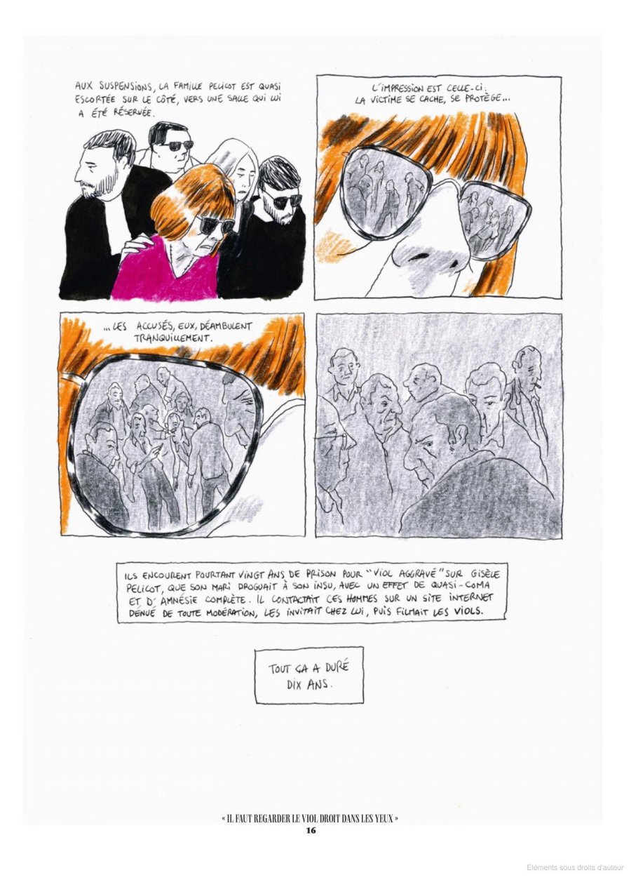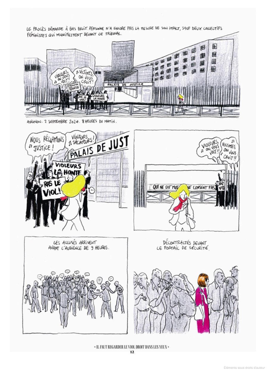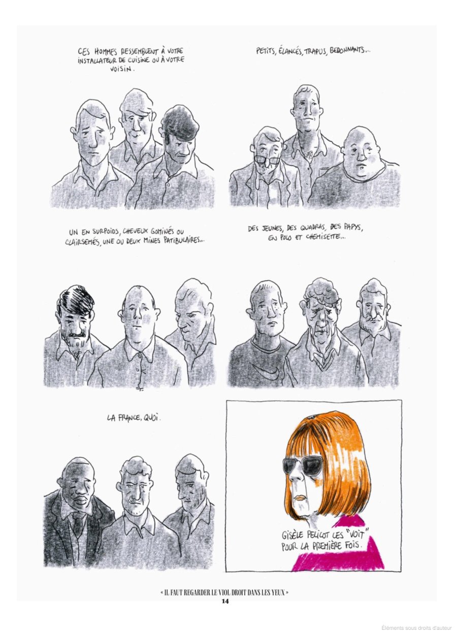 En trente séquences, souvent dessinées par un auteur différent, cette bande dessinée couvre les moments clés du procès Pelicot et ses enseignements à travers des histoires individuelles, des portraits et des pages documentaires. Elle aborde les questions essentielles soulevées par cette affaire : le traitement des viols par la justice, la construction de la masculinité, la culture du viol, etc.