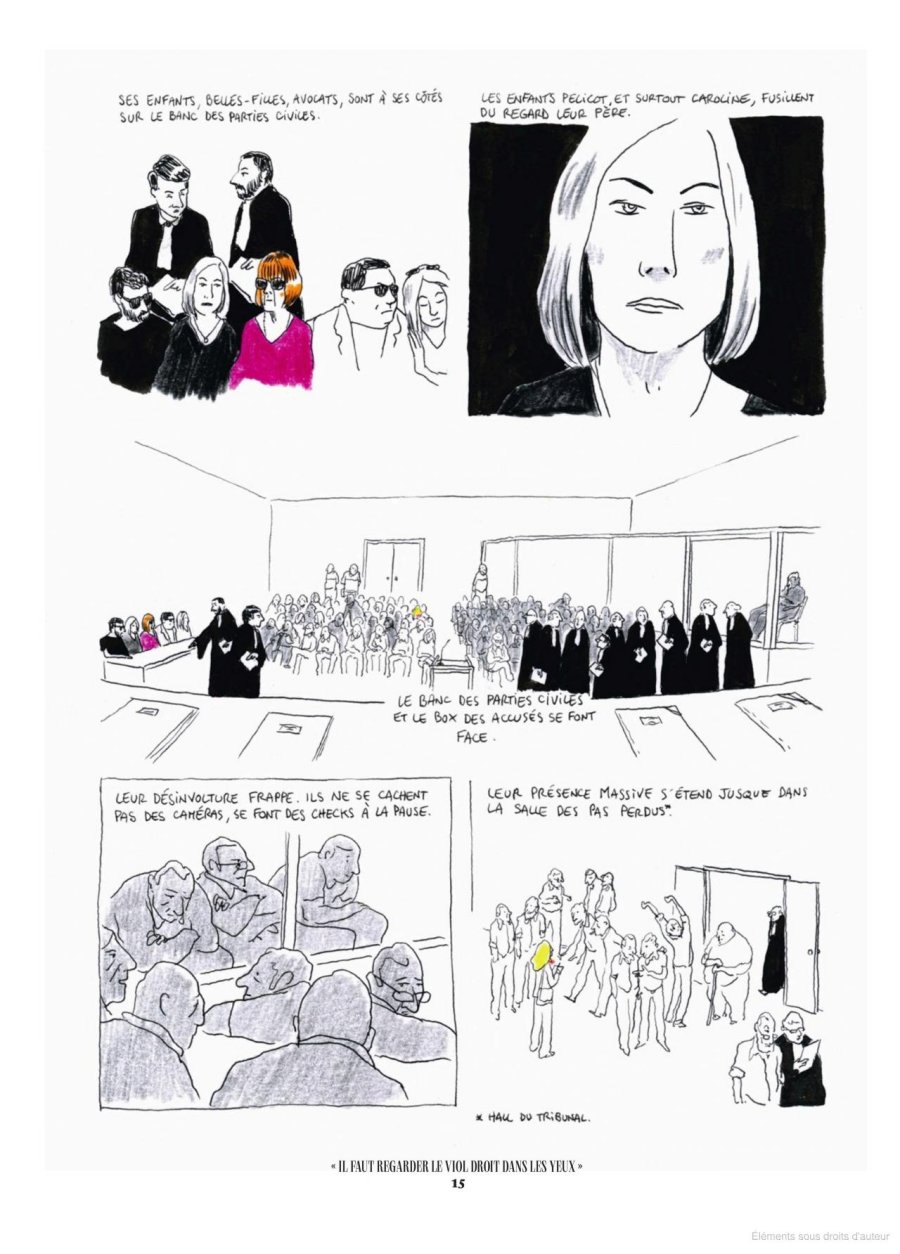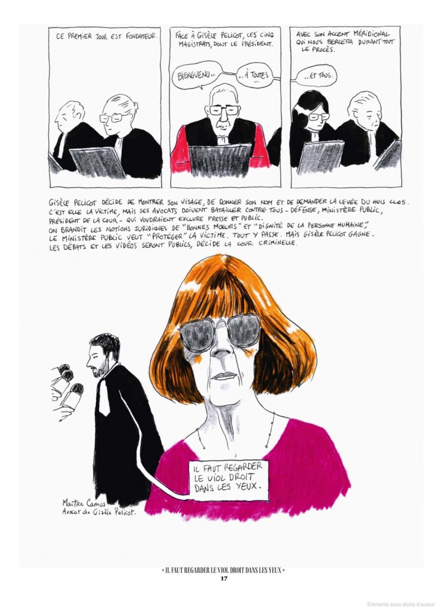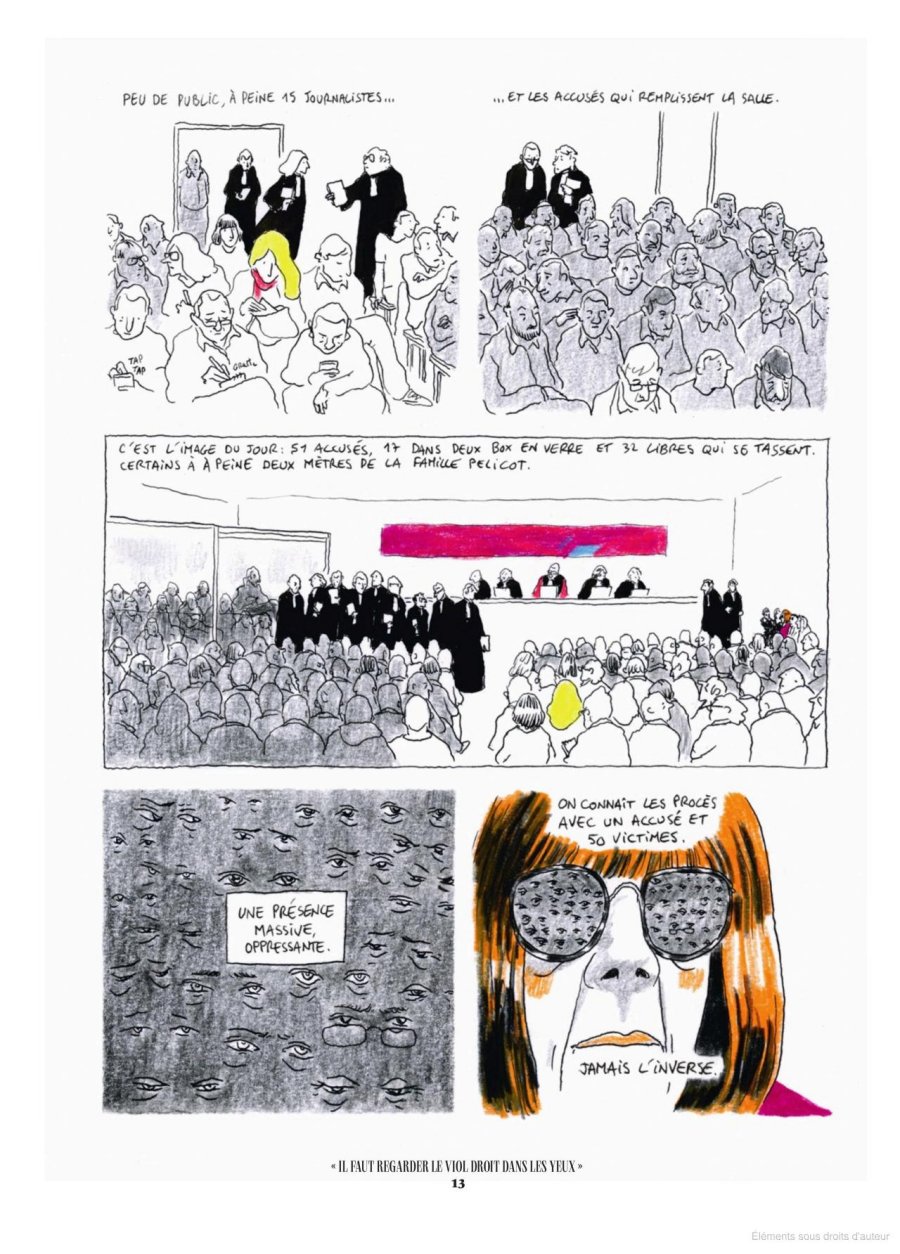En trente séquences, souvent dessinées par un auteur différent, cette bande dessinée couvre les moments clés du procès Pelicot et ses enseignements à travers des histoires individuelles, des portraits et des pages documentaires. Elle aborde les questions essentielles soulevées par cette affaire : le traitement des viols par la justice, la construction de la masculinité, la culture du viol, etc.