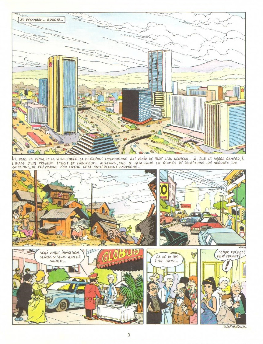 J'avais plutôt aimé ce que j'ai lu des éditions Milan, qui ont publié dans les années 80 quelques BD parues dans le magazine Mikado. Certes, Coline Maillard était loin d'être un chef-d'œuvre, mais on y trouvait le charme désuet de séries jeunesse dans la plus pure veine de l'âge d'or des années 60. Avec Les Aventures de Fred et Alfred, Dimberton nous proposait même une saga étonnamment mature et délicieusement pleine de loufoquerie. C'est ce que je croyais trouver dans Rémi Forget, mal aiguillé par le dessin pourtant sympathique de Serge Carrère. En réalité, on n'est pas ici dans une véritable œuvre jeunesse qui cherche à perpétuer l'héritage de Tintin, comme on aurait pu le croire. Alain Oriol et Serge Carrère nous plonge en fait dans les méandres d'une enquête sur la corruption des dirigeants politiques sud-américains, épaulés par des sectes qui n'ont de religieux que l'apparence. Cela aurait pu faire un sujet de BD intéressant, sans doute. J'avoue pourtant n'avoir jamais réussi à m'intéresser à ce récit, certes relativement bien mené, mais dont la narration est beaucoup trop conventionnelle pour qu'on y accroche à un moment ou à un autre. Même si les enjeux sont intéressants, les péripéties se déroulent lourdement, les bulles pèchent régulièrement par excès d'information, et la BD peine à trouver son équilibre entre récit d'aventures et documentaire sur la corruption en Amérique du Sud. Et malgré le dessin tout à fait charmant de Serge Carrère, on ne trouve jamais l'aspect bondissant espéré, car ça n'est pas le but de cette bande dessinée. C'est dommage, car si le côté aventures du récit avait été mieux maîtrisé, aucun doute que sa charge documentaire et politique serait bien mieux passée. En l'état, on ne sait jamais trop ce qu'on lit entre deux bâillements. Et on en sort avec la triste sensation d'un sacré gâchis !