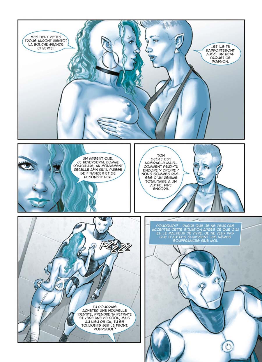 Le travail de Walter Trono est excellent techniquement, dans un style hyper réaliste et un dessin qui se focalise sur les personnages, au détriment des décors et arrière-plans, souvent escamotés. Ce parti-pris, ainsi que la couleur bleue qui sature les cases, accentuent la froideur de l’ensemble, le côté désespérant et apathique du régime dans lequel se déroule l’histoire. Prévue en cinq tomes, celle-ci nous dépeint une société dystopique et dictatoriale, qui, à l’instar de l’Église durant le moyen-âge, traque toute idée de plaisir, d’amour, toute relation sexuelle ne pouvant être acceptable que pour procréer. Les contrevenants et autres opposants sont persécutés et envoyés dans des camps de rééducations dans lesquels des sévices corporels – et sexuels – leur sont administrés. Face à cette dictature, certains résistent. Par le fait, en pratiquant des relations sexuelles sensuelles et uniquement tournées vers le plaisir, ou par la propagande, en tentant de diffuser des idées contraires à la doxa officielle. C’est le cas de Valentine, dont le père a été assassiné et dont la mère a été arrêtée par la police politique, ce qui l’a fait entrer en résistance. L’intrigue purement politique et thriller de Pistoia est classique, mais agréable à suivre (à voir ce que ça donnera par la suite), même si un peu « légère ». Mais, puisqu’on est chez Tabou, les auteurs nous gratifient de quelques scènes de sexe torrides, bien rendues – qui nous font encore plus regretter les interdictions que ces actes dénoncent. Une entame sans trop de surprise, mais plaisante à suivre et à regarder – pour un public averti bien entendu.