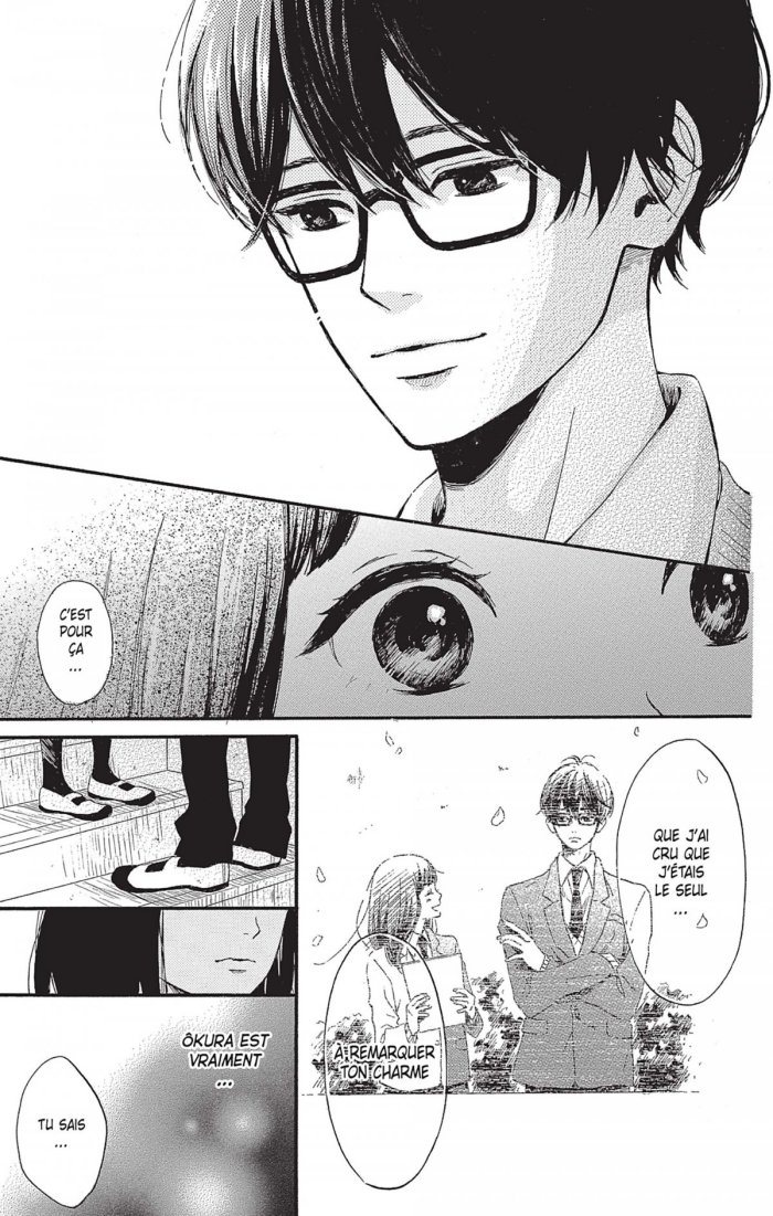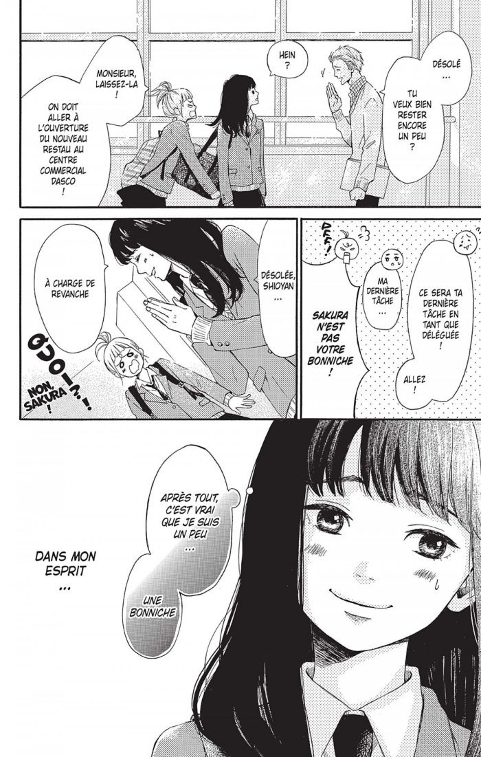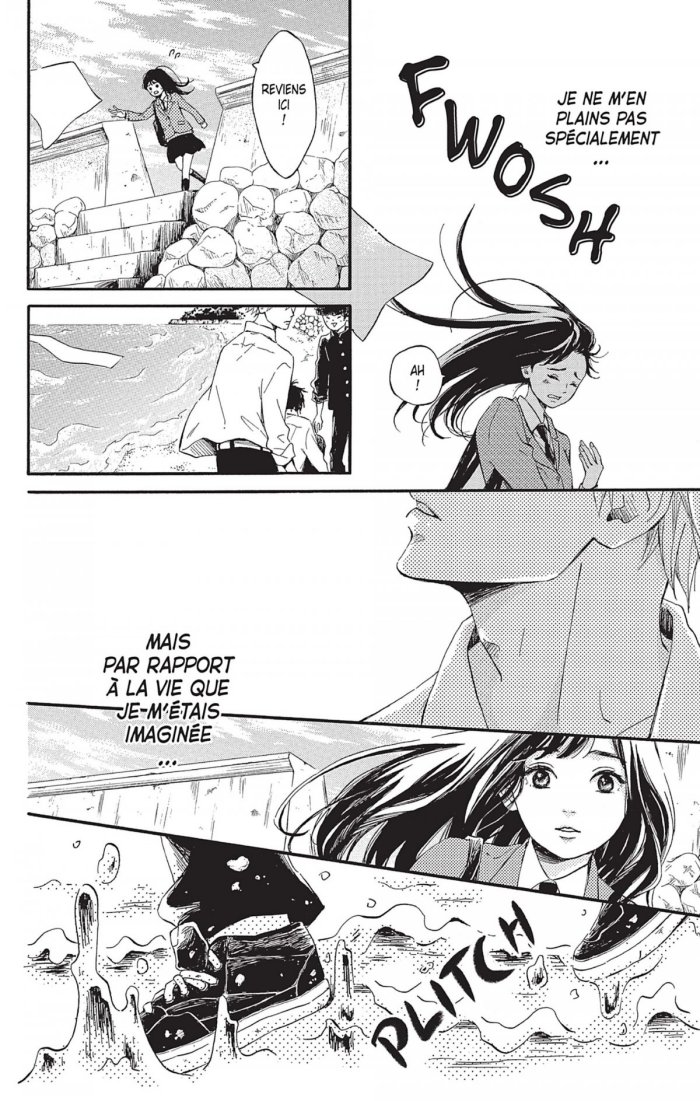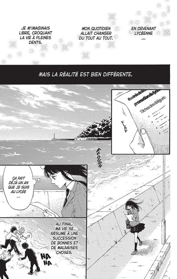 Un sticker sur la couverture du tome 1 proclame "Shôjo feel good". En effet à la lecture du manga on a l'impression que l'idée est de montrer que tout le monde est beau, tout le monde est gentil, et qu'on peut tomber, du premier coup, sur le prince charmant. D'ailleurs il y a une référence directe au Prince charmant de Blanche-Neige et les sept Nains. Pas la référence la plus noble, ceci dit, quand on pense à la scène du baiser. Mais on y a cette vision romantique répandue jusqu'aux années 2010. Là on a un schéma relativement classique, et tellement naïf : la lycéenne lâche par mégarde un papier important, le garçon qui passe par là le rattrape, après avoir à moitié plongé dans la mer. Il a des beaux yeux, hop, elle tombe amoureuse. Ils s'envoient des messages, passent tout leur temps libre ensemble, sans toutefois laisser de côté leurs amis respectifs. Là, je valide. là où je suis plus réservé, c'est sur d'autres détails : Ao essaie d'embrasser Sakura, mais elle ne veut pas aller trop vite et refuse. Il la force donc à presque l'embrasser; Une autre fois, lors d'une sortie avec les copains en rivière, elle avoue porter un maillot de bain sous une tenue légère. Il demande à la voir, elle refuse là encore. Il ouvre d'autorité cette tenue légère. Plus tard, lorsqu'ils consomment leur passion commune, il la force à se retourner. Sakura n'est jamais gênée par ces détails, mais je trouve que dans une relation normale, et respectueuse, ce n'est pas normal. Un autre détail, plus ridicule que révoltant : Ao et Sakura prennent un bain ensemble lors d'un week-end en amoureux. Lorsque Sakura se redresse pour embrasser son petit copain, on voit qu'elle est habillée d'une serviette. A moins qu'il s'agisse d'une tradition au Japon, je n'en vois pas trop l'intérêt. Bref, même si l'ensemble n'est pas déplaisant, ces red flags m'ont un peu agacé, et ce malgré un dessin élégant de Vega Nakashima, sans fioriture, sans petites fleurs qui se baladent au coin des cases.