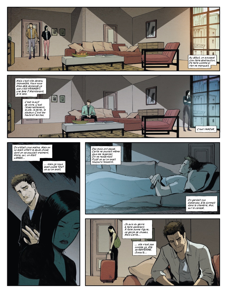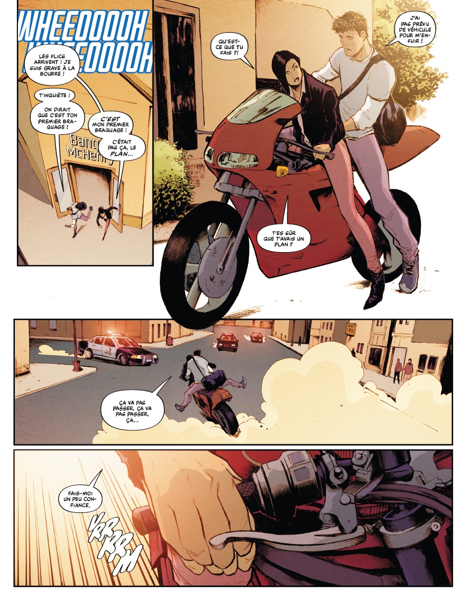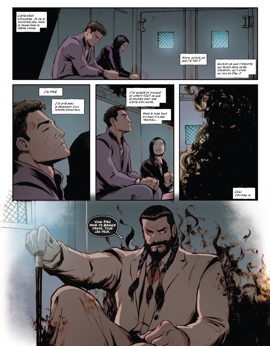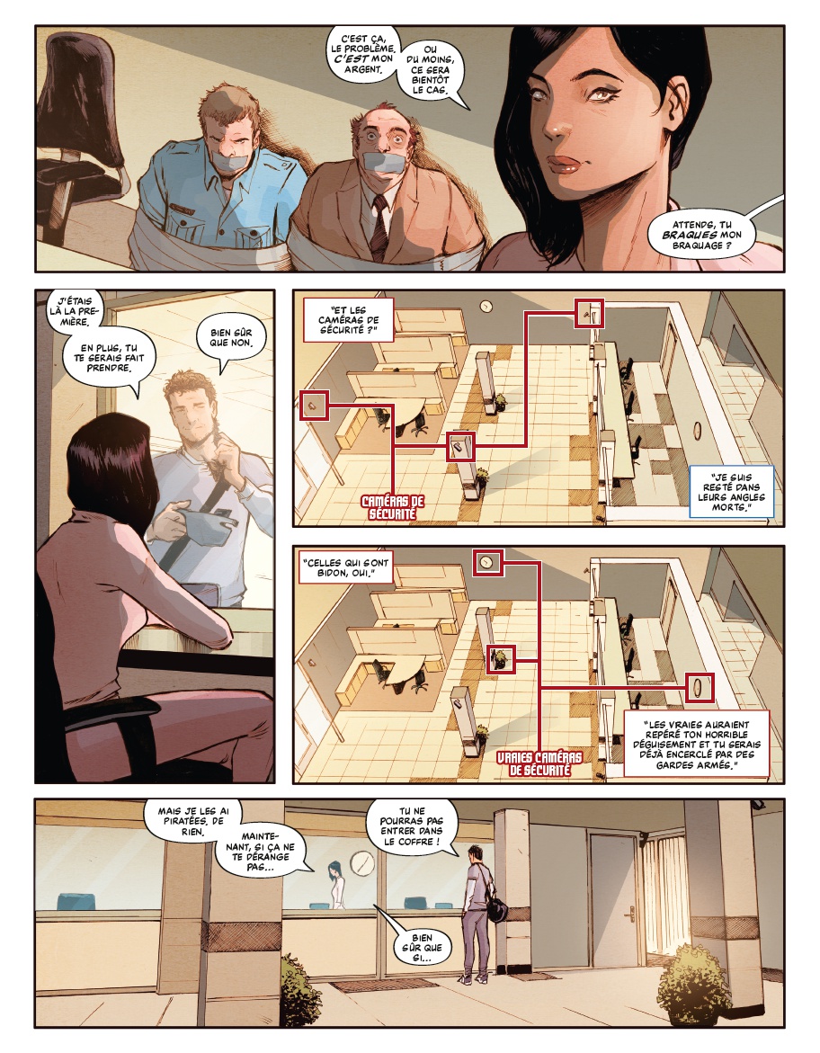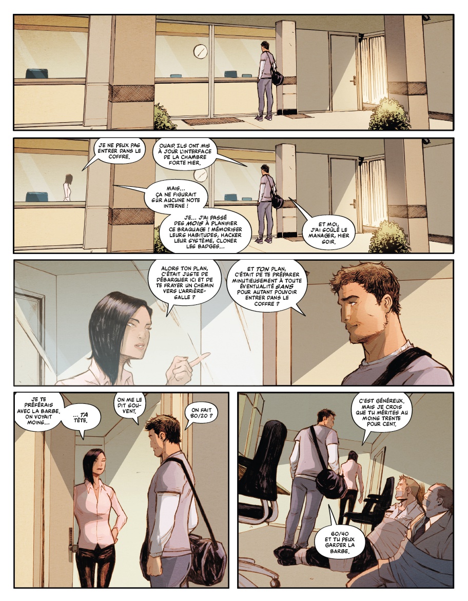 Miam ! Une bonne série popcorn ! Avec "The Big Burn", Lee Garbett et Joe Henderson nous proposent un savant mélange entre Faust, Ocean Eleven et Bonny & Clyde ! Rien que ça ! On met sa ceinture et c'est parti pour LE casse du siècle ! Owen et Carlie, deux belles gueules qui vivent de casses, se rencontrent... lors d'un casse. C'est le coup de foudre et c'est en équipe qu'ils poursuivent leurs braquages en mettant chaque fois la barre un peu plus haut, jusqu'au braquage de trop : direction la case prison. Mais lors de leur transfert, le Diable leur apparaît et leur propose la liberté en échange de leur âme... Ils ne vont pas réfléchir bien longtemps et acceptent le marché. Sauf que sans âme, c'est leur amour qui s'évanouit et leur relation fait pschiiittt ! Owen se retrouve dans la panade face à des créanciers qui lui font frôler la mort... et repasser par la case "enfer" ou il croise le Diable. L'Enfer est un casino ! Et qui dit casino dit coffre où toutes les âmes des damnés y sont retenues. Voilà un challenge qui vaut le coup ! Il n'en faut pas plus à Owen une fois remis de ce passage pour mettre sur pied un plan et une équipe de damnés comme lui pour monter le braquage du siècle et récupérer leurs âmes. Alors oui, faut être ouvert à cette petite touche fantastique, mais le rythme soutenu, l'excellente narration, le dessin efficace et les cadrages très cinématographiques embarquent rapidement le lecteur dans ce délire. Ajoutez à cela une brochette de personnages bien trouvés cachant tous bien leur jeu et ce petit road trip to inferno fait largement le boulot pour un bon moment de plaisir sur les chapeaux de roue. Si quelques facilités scénaristiques existent, ne boudons pas notre plaisir, c'est assez réjouissant et le petit clin d'oeil final pourrait même nous promettre un second tome : je suis preneur !