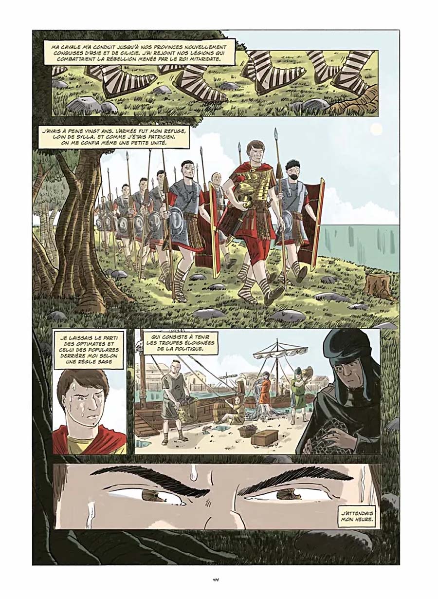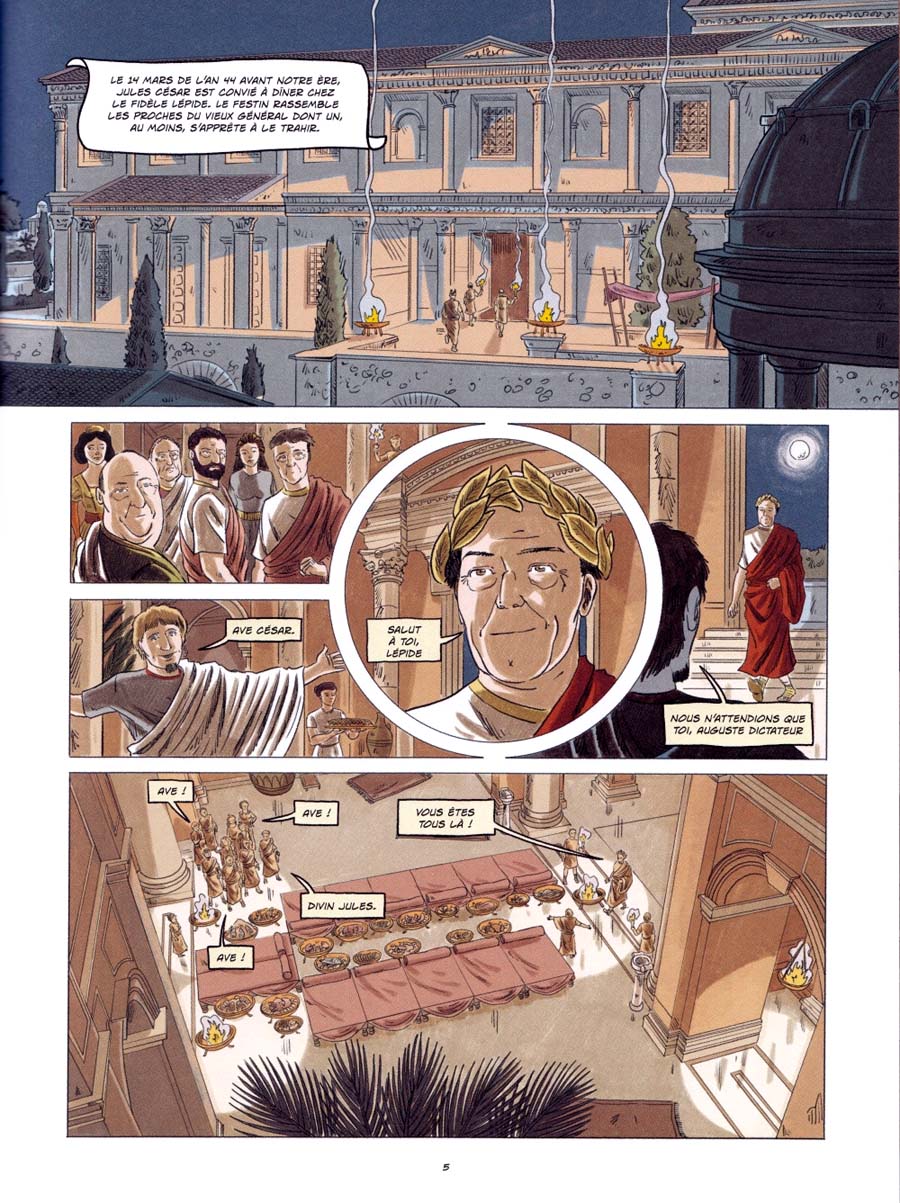 Cette série pourrait très bien avoir sa place dans une bibliothèque dévolue à l'histoire de Rome. En effet les auteurs proposent un récit historique très détaillé et référencé comme le prouve les nombreuses pages de notes en fin d'ouvrage. De nombreux passages sont basés sur les écrit de Suétone ou de Plutarque mais aussi sur les recherches de nombreux spécialistes de la période et bien sûr avec les écrits de César pendant la Guerre des Gaules. Contrairement à une série comme Murena fiction historique qui fait place à beaucoup d'émotionnel, ici il s'agit bien d'un récit historique complet et détaillé où quelques situations fictives donnent de la souplesse et de la fluidité à la narration. La lecture est soutenue mais accessible. Le personnage peu, sympathique de César mérite cette attention tellement il a marqué la destinée européenne comme modèle politique ou militaire. La vie familiale du dictateur n'est pas oublié tant qu'elle sert la destinée politique de l'homme. Les auteurs évitent le voyeurisme intime même si le fameux "le mari de toutes les femmes et la femme de tous les maris" est évoqué brièvement. Les auteurs donnent une bonne visibilité à un récit qui aurait pu être très confus tellement il y a de personnages, d'alliances et de trahisons pendant ces plus de vingt ans de pouvoir. J'ai beaucoup aimé la partie jeunesse de César très bien mis en perspective par les auteurs. A travers la guerre civile des Optimates contre les Plébéiens ce passage fonde une grande partie des actions postérieures du maitre de Rome. Le portrait est implacable tout en évitant un jugement de valeur d'une vision contemporaine. César était sans état d'âme un horrible génocidaire, esclavagiste et impérialiste. Pourtant il est resté un modèle historique qui a même eu sa place de façon humoristique dans nos albums préférés. Je trouve que cela à de quoi faire réfléchir. Le graphisme est précis . On pourrait lui reprocher son côté scolaire mais cela correspond à l'esprit d'enquête historique sérieuse que propose la série. La violence est très présente mais contenue sans volonté malsaine de voyeurisme. Ainsi le dessin équilibre bien un texte recherché qui essaye du mieux possible de rendre la pensée politique de César. Une bonne lecture pour les amateurs d'Histoire et plus.