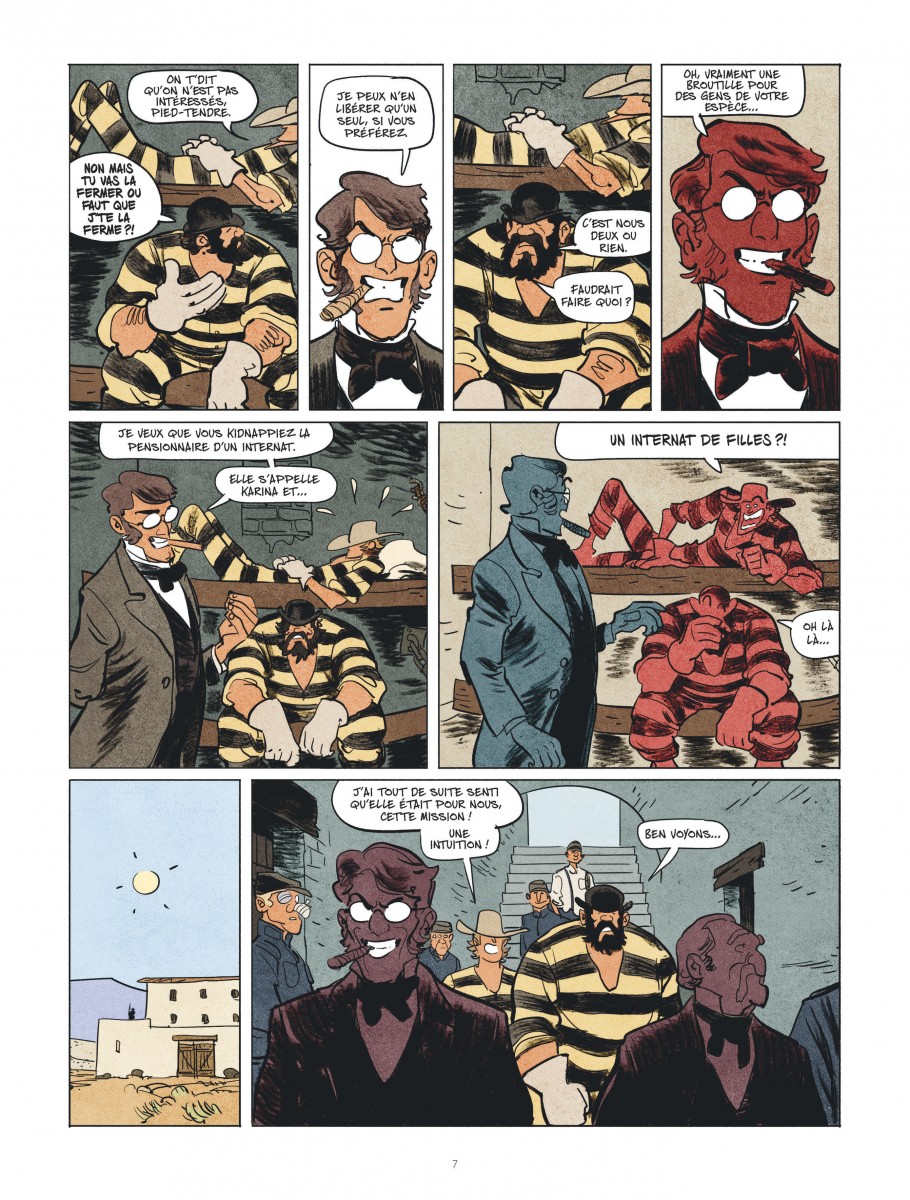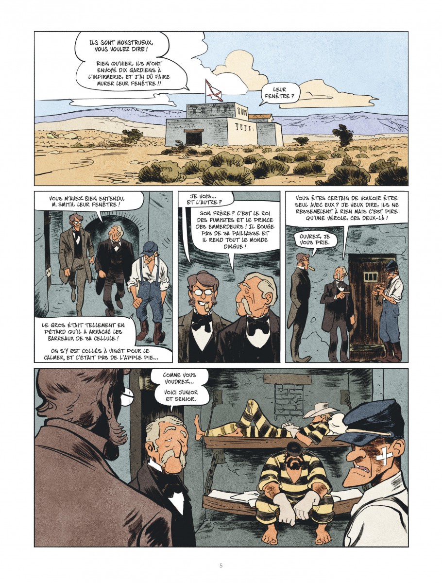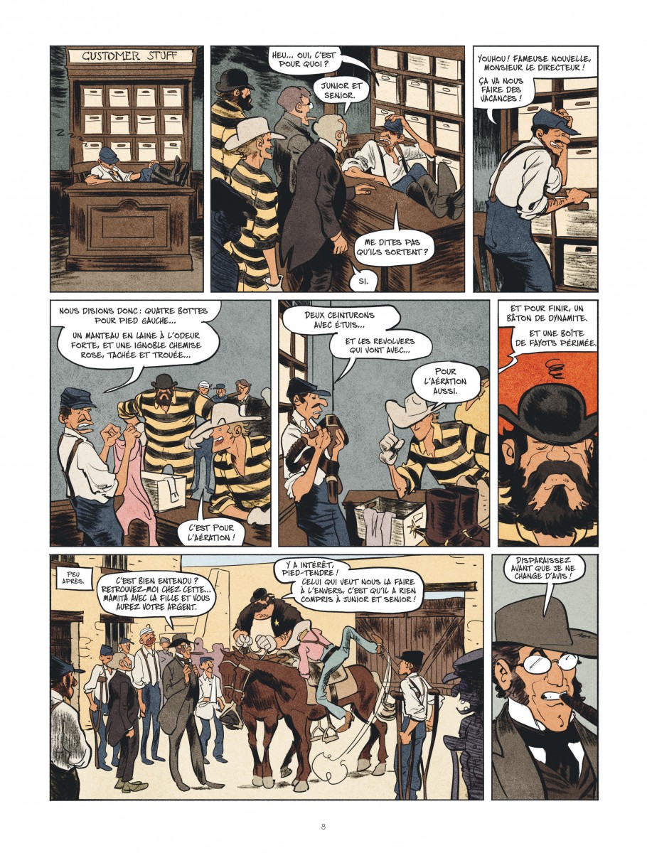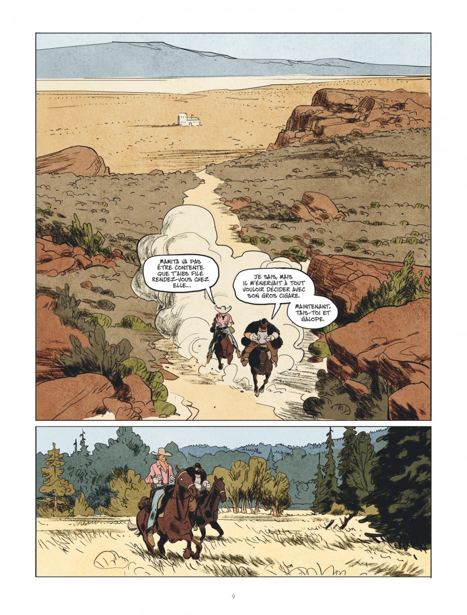 Vous ferai-je l’affront d’évoquer la cultissime série des « Trinita » comme référence principale à ce « On les appelle Junior & Senior » ?… Bien plus qu’un simple hommage, cette nouvelle série signée Robin Recht, au scénario cette fois, et Jean-Baptiste Hostache au dessin, est une véritable déclaration d’amour au duo mythique Bud Spencer – Terrence Hill : la castagne à coup de bourre-pif, les fayots, les engueulades à répétition entre les deux frangins, une intrigue enfantine, il y a là tous les éléments clés qui ont fait le succès des deux compères. Me concernant je ne garde pas un grand souvenir des Trinita. Plus spécifiquement sur la carrière du duo, j’ai en mémoire « Les Super-flics de Miami », « Pair et Impair », ou encore « Salut l’ami, adieu le trésor ». Mais bon, leur carrière respectif ou ensemble fût tellement riche… En tout cas ce Junior & Senior est truffé de références, même si je suis loin de les avoir toutes captées on les perçoit en seconde lecture. Par exemple il y a Eli Wallach qui fait une apparition et il a tendance à trop parler au lieu de tirer (si vous voyez ce que j’veux dire). Ou encore Mlle Bismarck dont s’amourache Junior, et dont on peut penser qu’elle fait référence à la femme de Terrence Hill, une américaine d’origine allemande. Les experts pourront s’amuser à essayer de tout repérer. Sinon, pour rentrer dans le vif du sujet, j’ai trouvé ça sympathique, à l’image de ce vieux duo de notre enfance. Je n’irai pas jusqu’à dire que c’est un incontournable et que ça vaut son pesant de cacahuète, mais on passe honnêtement un bon moment, ça se laisse lire, sans aucune surprise. Je me demande même si ce n’est pas une bd à mettre davantage entre les mains d’un enfant. Après tout, moi ça touche à mes souvenirs d’enfant, je n’ai revu aucun de leurs films depuis cette époque. Il y a comme un charme suranné là-dedans, qui n’est pas désagréable en soi, mais je ne ressent pas particulièrement l’envie de m’y replonger. Le dessin de Hostache est approprié, tout en rondeur, rigolo, avec des couleurs qui donne un aspect un peu vieilli évoquant nos Lucky Luke de jeunesse. Donc c’est cool, mission remplie pour lui aussi. Je ne sais pas si je serai du rendez-vous, mais je souhaite le meilleur pour les épisodes suivants et un franc-succès dans les ventes.
