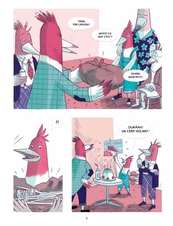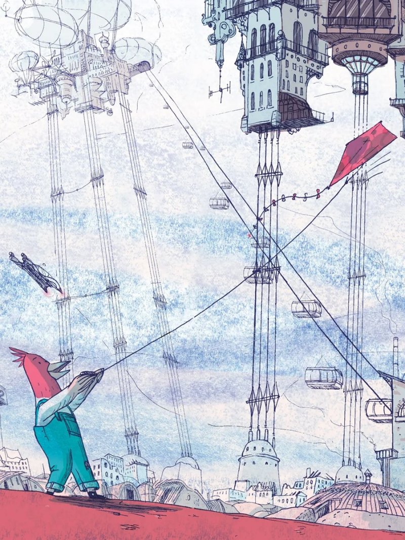 Jusqu’au jour où elle aperçoit quelqu’un, tout en bas. Elle ne savait pas que des gens vivaient au sol, il y a trop de pollution et de brouillard là-bas. Trop de tempêtes. Mais le garçon qu’elle observe n’est pas comme elle : il a des plumes et un long nez...