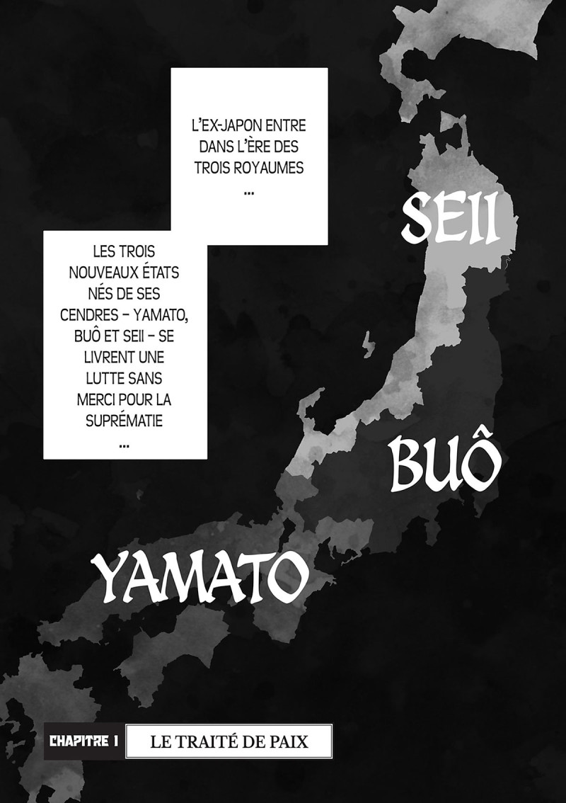 Après une succession de catastrophes politiques, écologiques et humanitaires, le Japon a éclaté en trois nations distinctes, qui ne cessent de se livrer des guerres de territoire. La civilisation s'est effondrée et le peuple vit dans la précarité, tandis que des élites corrompues l'exploitent pour renforcer leurs privilèges. Aoteru Misumi vit au sein de la commanderie d'Ehime, du pays Yamato. Mais malgré les difficultés du quotidien, ce jeune marié envisage l'avenir avec espoir... jusqu'à ce qu'un drame personnel vienne détruire son bonheur. Pour lui, c'est la goutte de trop. Refusant de continuer à subir l'injustice, il prend une décision qui changera son destin à jamais : il sera celui qui ramènera la paix... en réunifiant le Japon ! Texte: L'éditeur