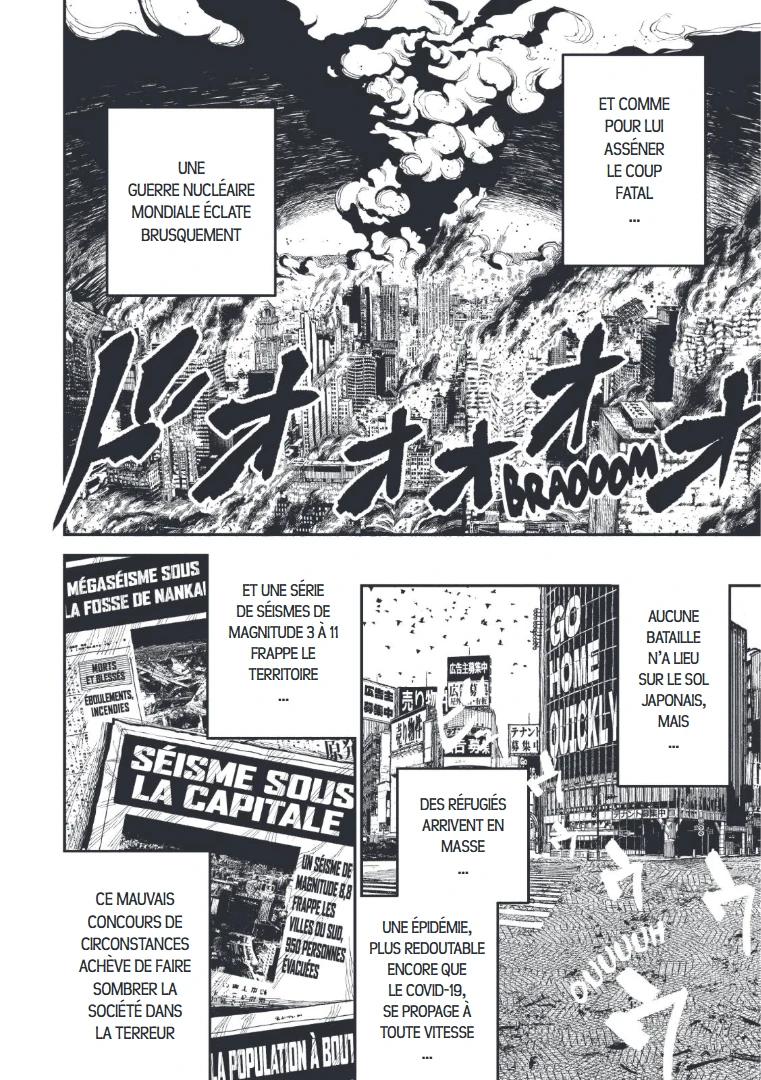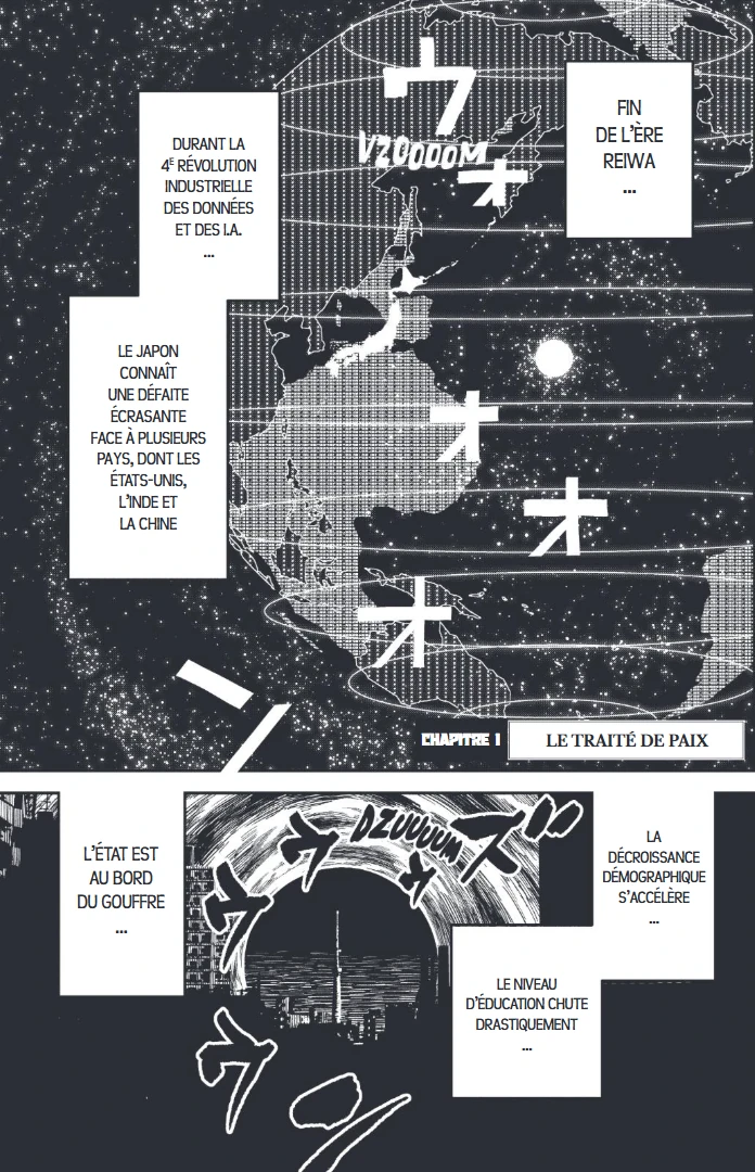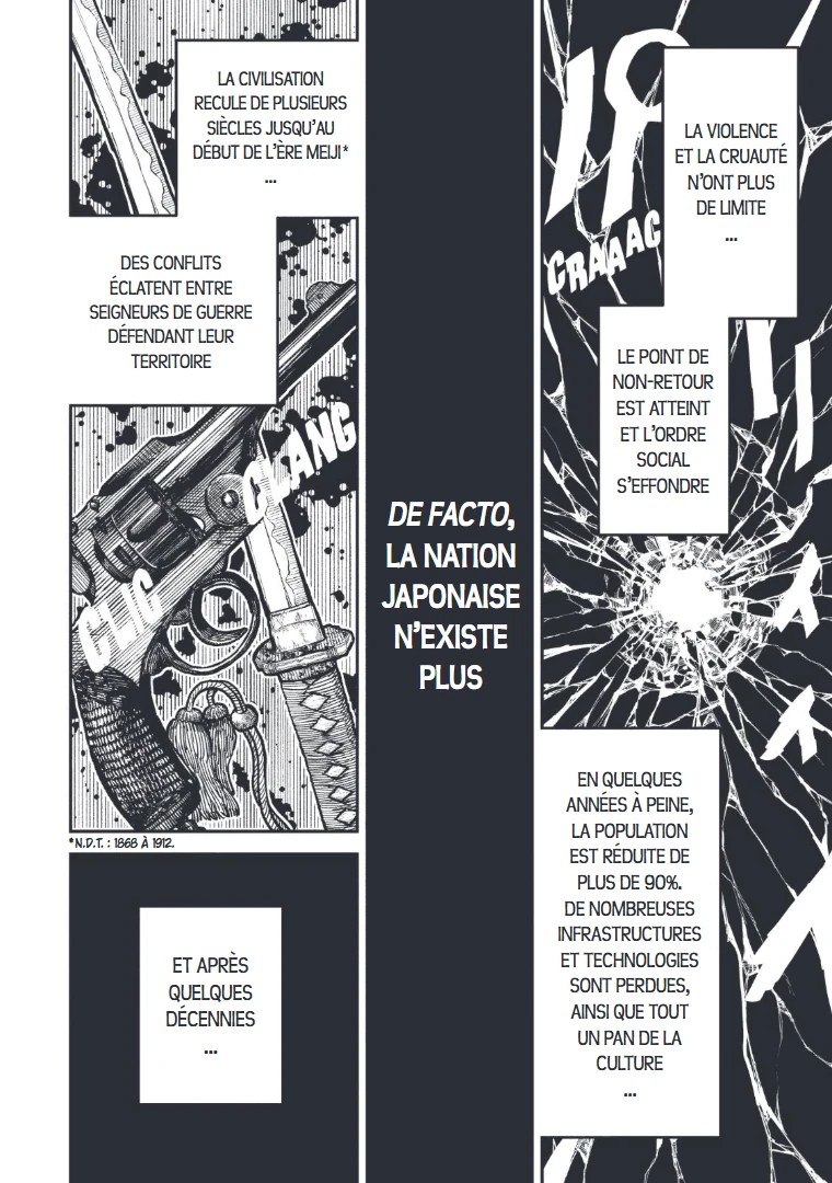 2.5 Akata présente ce manga comme ambitieux et pour l'instant je ne sais pas trop quoi en penser. Il faut dire que pour l'instant je n'ai lu que deux des trois tomes parus en français et que le premier tome est une très longue introduction au rythme trop lent. Ce n'est pas trop grave lorsque c'est pour expliquer ce qui est arrivé au Japon pour que la société s'effondre, mais l'histoire personnel du héros est cliché pour n'importe qui ayant lu une œuvre se passant dans un monde post-apocalyptique. Le héros essai de vivre sa vie tranquille avec sa femme sauf que ceux qui ont du pouvoir en abuse et grosse surprise sa femme finit tuer de manière injuste (bon j'avoue que j'ai été surprise qu'elle ne se fasse pas en prime violer de manière gratuite juste pour qu'on comprenne bien que la vie est pas juste). Cela le motive à vouloir changer les choses et pour l'instant sa quête ne me passionne pas trop et je ne pense pas que j'ai envie de continuer de lire la série pour voir si je vais changer d'avis. Le dessin est correct.