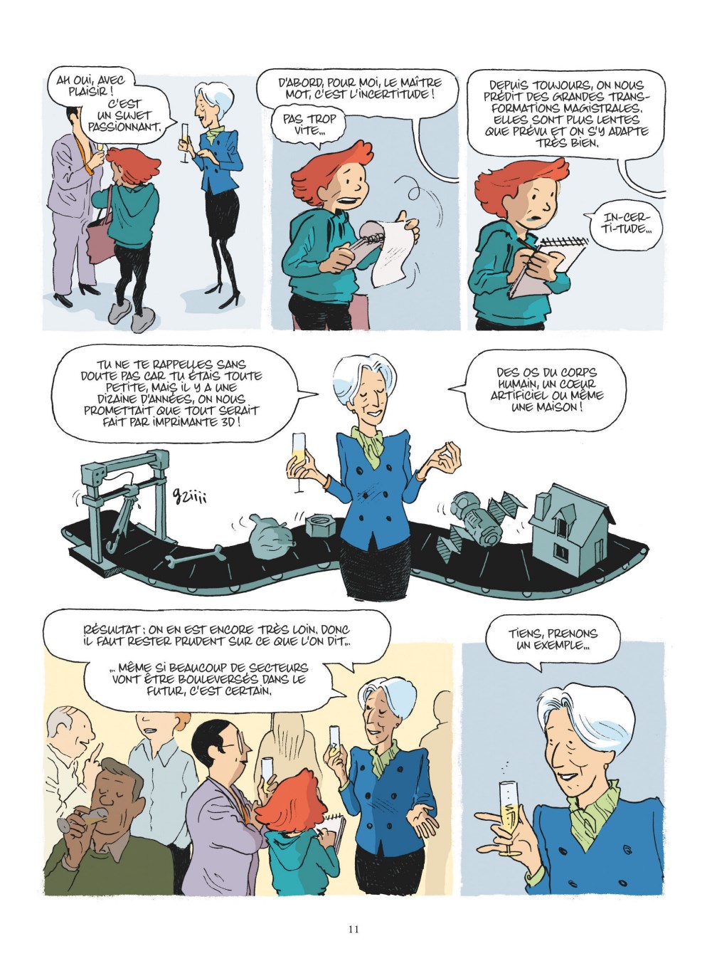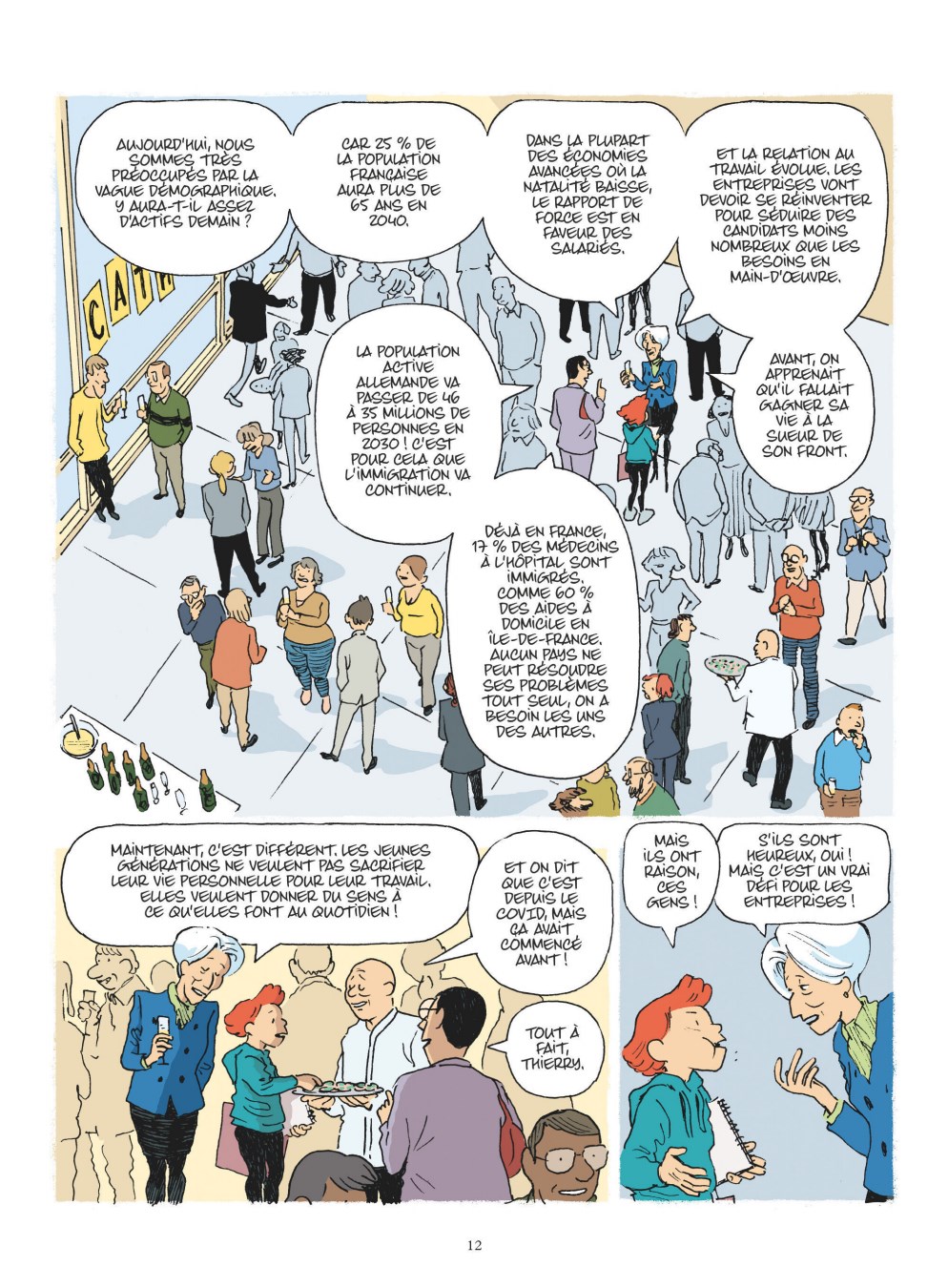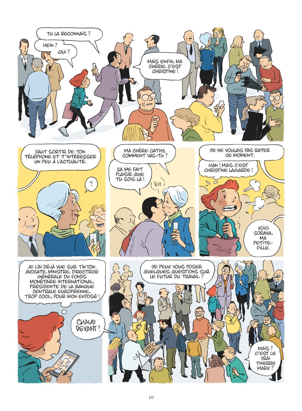 L’intelligence artificielle va-t-elle vraiment tout révolutionner ? Pourquoi l’égalité femmes / hommes est-elle cruciale dans les entreprises ? Comment concilier productivité, transition écologique et responsabilité sociale ? Quelle place pour les syndicats dans ce grand bouleversement ? Comment répondre aux nouvelles attentes des jeunes et des salariés ? Et comment mieux les former, alors que la population vieillit, que la main d’œuvre se raréfie et que les compétences évoluent rapidement ? Voici quelques-unes des nombreuses questions débattues dans ce livre, à travers le regard de 13 actrices et acteurs du monde du travail qui partagent leurs visions et leurs engagements. Une chose est sûre : réfléchir au travail de demain, c’est réfléchir dès aujourd’hui aux évolutions de notre société pour ouvrir le débat. Pour traiter tous ces enjeux, le lecteur va suivre les aventures de Soraya, jeune lycéenne qui se rend au pot de départ à la retraite de sa grand-mère Cathy, DRH dans une entreprise de parapluies. Soraya a une idée en tête : se servir de ce moment pour boucler son exposé sur le futur du travail. Mais elle n’imaginait pas pouvoir rencontrer toutes ces personnalités, et qu’elles acceptent de jouer le jeu en devenant d’authentiques personnages de bande dessinée. Véritable documentaire-fiction aussi sérieux qu’amusant, Travailler Demain est porté par Muriel Pénicaud, ancienne ministre du Travail, et le journaliste Mathieu Charrier. Ce roman graphique ambitieux dresse le portrait d’un monde en devenir et offre des pistes de réflexion pour tâcher de répondre ensemble à la question que tout le monde se pose : à quoi va ressembler le travail de demain ? Mis en scène par Nicoby avec réalisme, humour et précision, cet ouvrage est à destination de toutes celles et ceux que la question du travail intéresse, qu’ils soient élèves ou étudiants, actifs ou retraités. Ont participé à cet album : Benoit BAZIN : PDG de Saint-Gobain ; Sophie BELLON : PDG de Sodexo ; Moussa CAMARA : Fondateur & président de l'association Les Déterminés ; Pascal DEMURGER : DG de la MAIF ; Aurélie JEAN : scientifique en algorithmique ; Rachel KHAN : auteure & comédienne ; Christine LAGARDE : Présidente de la Banque centrale européenne ; Marylise LEON : Secrétaire générale de la CFDT ; Jasmine MANET : cofondatrice et DG de Youth Forever ; Philippe MARTINEZ : ancien Secrétaire général de la CGT ; Thierry MARX : Chef étoilé. Président de l’Union des métiers et des industries de l’hôtellerie et de la restauration ; Ron OSWALD : ancien Secrétaire général de l'UITA ; Isabelle ROME : ancienne ministre en charge de l’Egalité Femmes-Hommes.