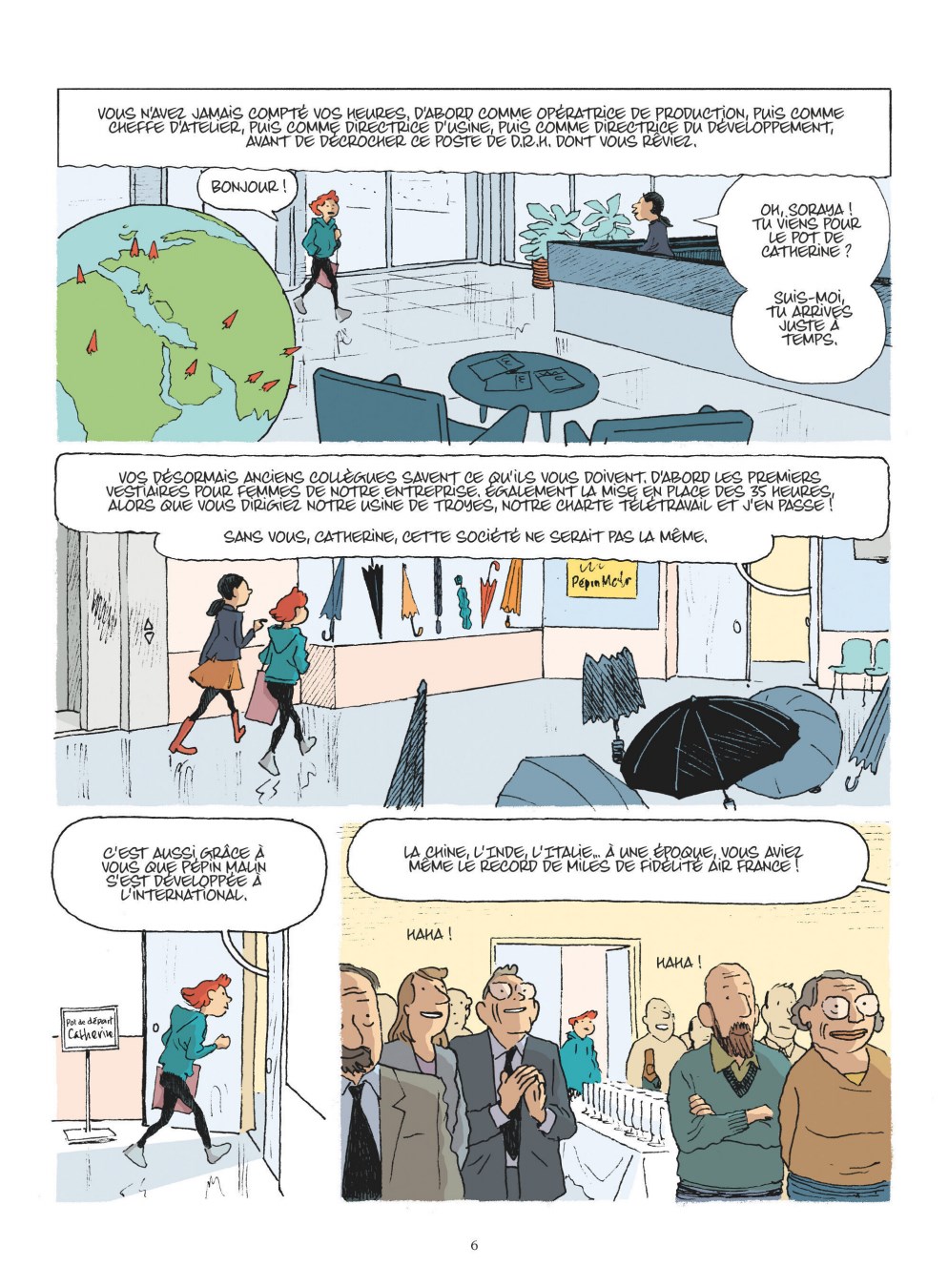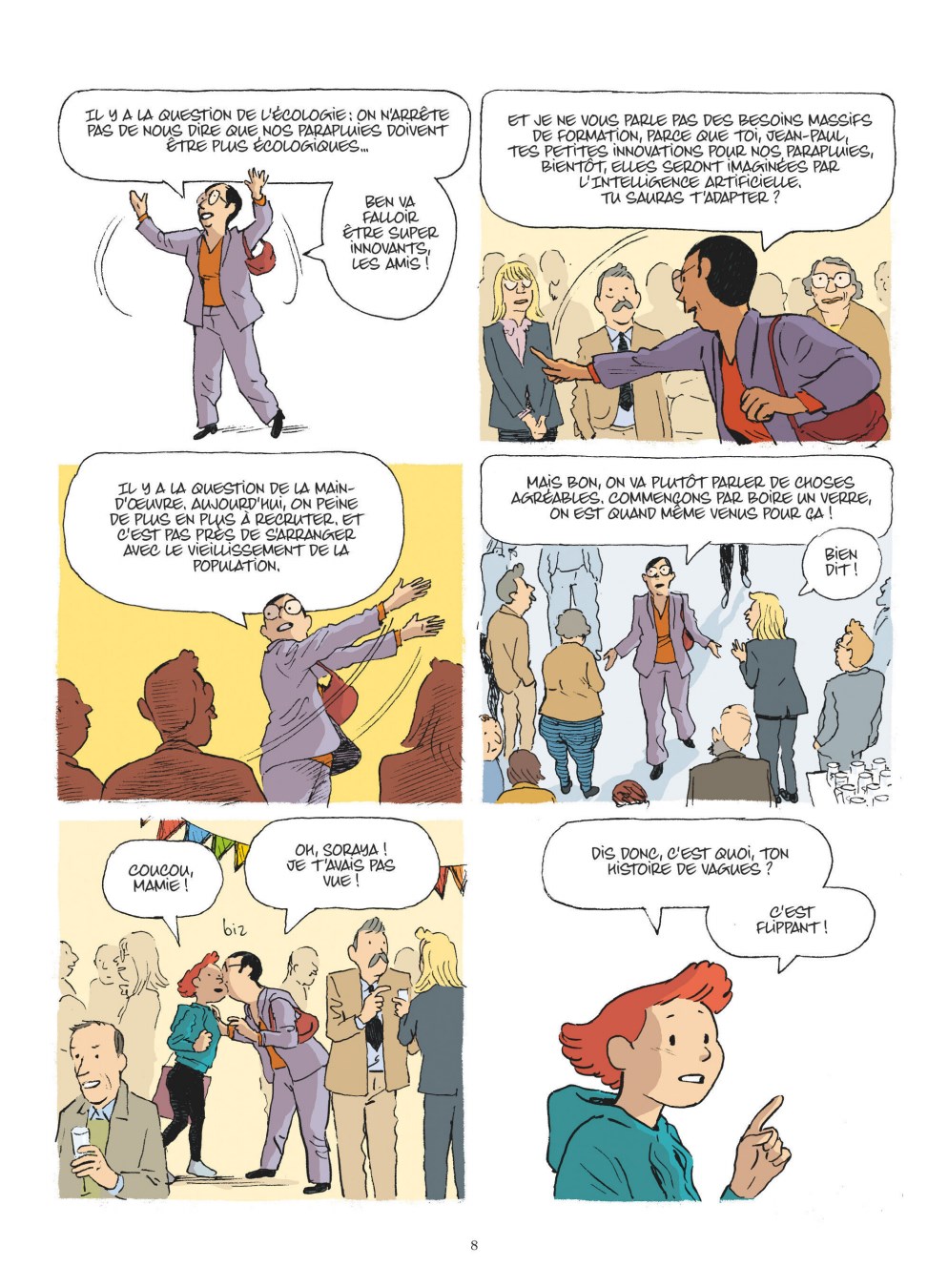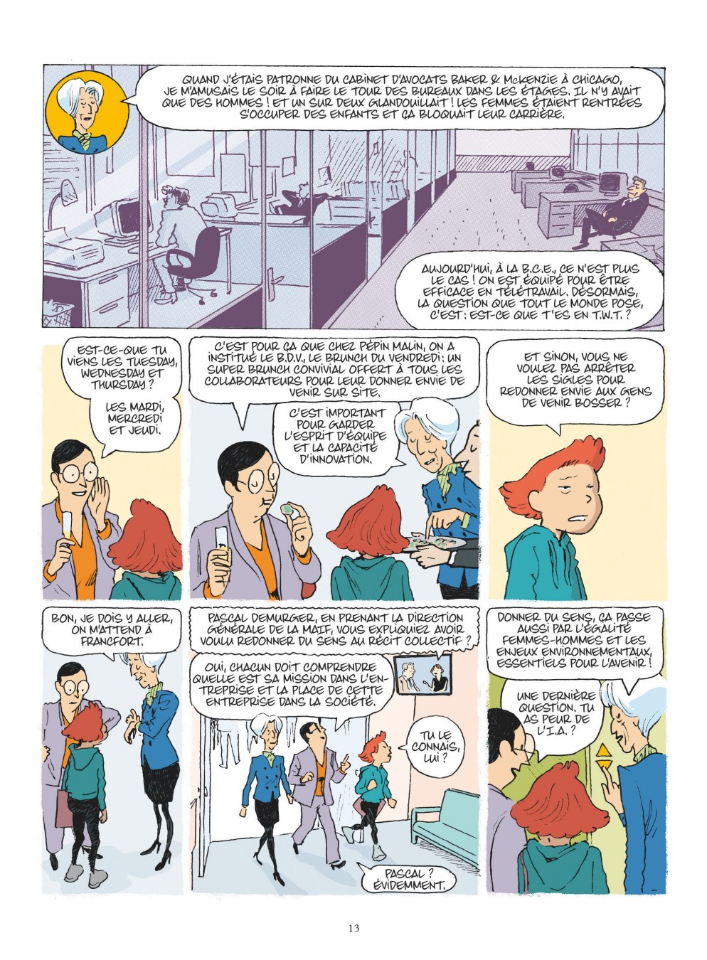L’intelligence artificielle va-t-elle vraiment tout révolutionner ? Pourquoi l’égalité femmes / hommes est-elle cruciale dans les entreprises ? Comment concilier productivité, transition écologique et responsabilité sociale ? Quelle place pour les syndicats dans ce grand bouleversement ? Comment répondre aux nouvelles attentes des jeunes et des salariés ? Et comment mieux les former, alors que la population vieillit, que la main d’œuvre se raréfie et que les compétences évoluent rapidement ? Voici quelques-unes des nombreuses questions débattues dans ce livre, à travers le regard de 13 actrices et acteurs du monde du travail qui partagent leurs visions et leurs engagements. Une chose est sûre : réfléchir au travail de demain, c’est réfléchir dès aujourd’hui aux évolutions de notre société pour ouvrir le débat. Pour traiter tous ces enjeux, le lecteur va suivre les aventures de Soraya, jeune lycéenne qui se rend au pot de départ à la retraite de sa grand-mère Cathy, DRH dans une entreprise de parapluies. Soraya a une idée en tête : se servir de ce moment pour boucler son exposé sur le futur du travail. Mais elle n’imaginait pas pouvoir rencontrer toutes ces personnalités, et qu’elles acceptent de jouer le jeu en devenant d’authentiques personnages de bande dessinée. Véritable documentaire-fiction aussi sérieux qu’amusant, Travailler Demain est porté par Muriel Pénicaud, ancienne ministre du Travail, et le journaliste Mathieu Charrier. Ce roman graphique ambitieux dresse le portrait d’un monde en devenir et offre des pistes de réflexion pour tâcher de répondre ensemble à la question que tout le monde se pose : à quoi va ressembler le travail de demain ? Mis en scène par Nicoby avec réalisme, humour et précision, cet ouvrage est à destination de toutes celles et ceux que la question du travail intéresse, qu’ils soient élèves ou étudiants, actifs ou retraités. Ont participé à cet album : Benoit BAZIN : PDG de Saint-Gobain ; Sophie BELLON : PDG de Sodexo ; Moussa CAMARA : Fondateur & président de l'association Les Déterminés ; Pascal DEMURGER : DG de la MAIF ; Aurélie JEAN : scientifique en algorithmique ; Rachel KHAN : auteure & comédienne ; Christine LAGARDE : Présidente de la Banque centrale européenne ; Marylise LEON : Secrétaire générale de la CFDT ; Jasmine MANET : cofondatrice et DG de Youth Forever ; Philippe MARTINEZ : ancien Secrétaire général de la CGT ; Thierry MARX : Chef étoilé. Président de l’Union des métiers et des industries de l’hôtellerie et de la restauration ; Ron OSWALD : ancien Secrétaire général de l'UITA ; Isabelle ROME : ancienne ministre en charge de l’Egalité Femmes-Hommes.