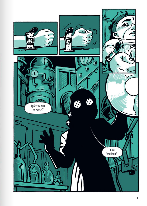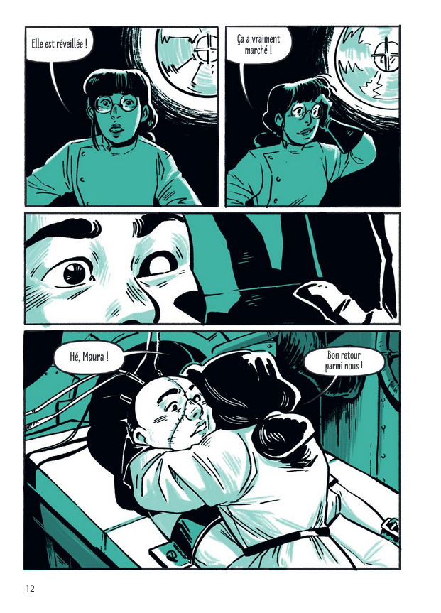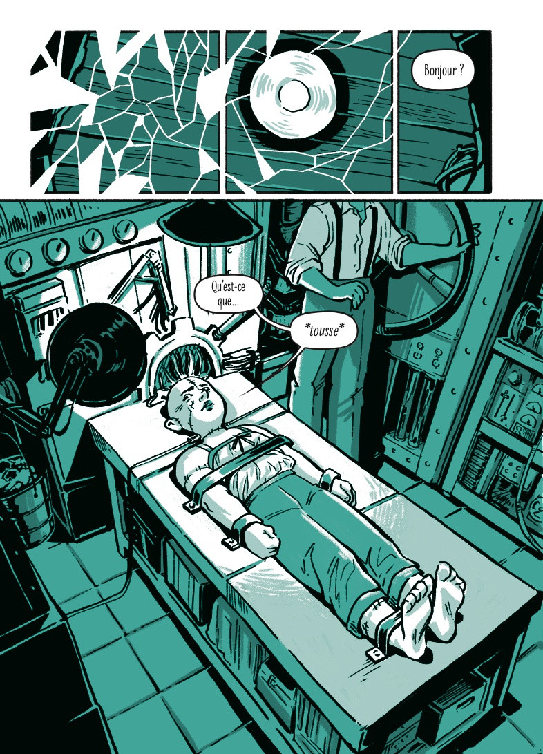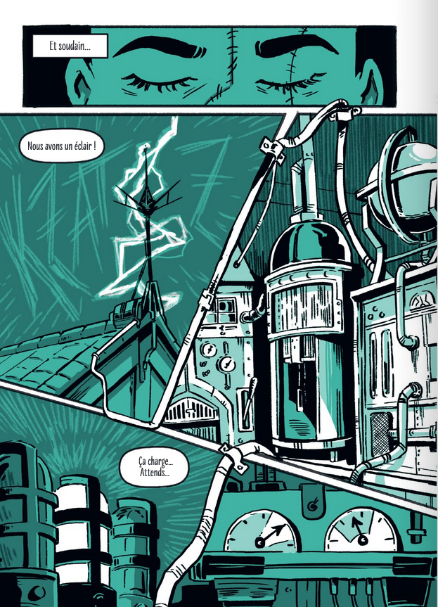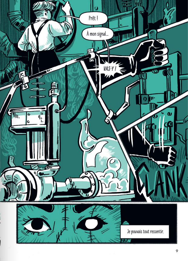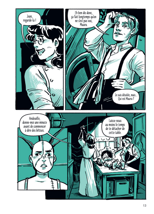 3e album de la récente collection Waves créée chez Delcourt, et c'est sans doute celui qui m'aura le moins emballé. Cet album présenté comme un remake de Frankenstein peine à embarquer le lecteur ; il m'aura fallu attendre les deux tiers de la BD pour enfin être accroché par le récit. L'album nous raconte l'histoire de deux soeurs jumelles, Frances et Maura, passionnées par les sciences. On frôle l'occulte et le fantastique s'invite naturellement dans leur environnement jusqu'à un incident tragique lors d'une expérience au cours de laquelle Maura décède. Francès n'aura de cesse de faire revenir sa soeur à la vie ; détermination qui finira par payer, car une de ses expériences conduit au miracle... ou presque... Car si c'est bien le corps rafistolé de Maura, au niveau conscience et souvenirs, ce n'est pas la même... "Maura", aidée de la "vraie" (qui apparait dans les miroirs) va tenter de donner le change jusqu'au moment ou elle va péter les plombs... Et pour le coup, c'est à partir de ce moment que le récit décolle... Dommage, car on en est déjà au dernier tiers de l'album ! Côté graphisme Talia Dutton impose une patte qui manque peut-être encore un peu de maturité mais prometteur. Sa gestion des noirs au niveau encrage m'a beaucoup plu, et ses découpages sont souvent biens pensés. Je suis moins enthousiaste sur cette colorisation monochrome qui joue sur un camaïeu de bleus. Bref, un début d'album qui prend trop de temps à lancer véritablement l'histoire, un déséquilibre qui pénalise l'appréciation globale de cette BD. 2.5/5