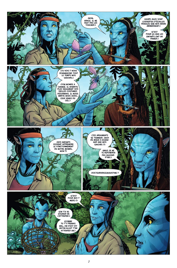 Et hop ! Encore un nouveau venu autour de la saga Avatar ! Cette fois on nous plonge un peu avant le premier film de James Cameron. Le programme Avatar n'en est qu'à ses débuts sur Pandora ; notre Dr Grace Augustine est déjà de la partie et cherche à améliorer les relations entre nos deux peuples. Pour ce faire elle veut ouvrir une école pour les enfants Na'vi. Mais une mystérieuse maladie touchant avant tout les enfants va tout remettre en cause, que ce soit l'école elle même, ou tout simplement la maigre confiance qui règne entre communautés. Si l'immersion dans la planète Pandora est toujours aussi agréable, le scénario peine quand même un peu à nous embarquer, surtout quand on connaît la suite. L'histoire est des plus classique, tout comme le dessin de Beni Lobel. Bref, plaisant, mais cet opus ravira plus certainement les aficionados de la saga qu'autre chose. (2.5/5)