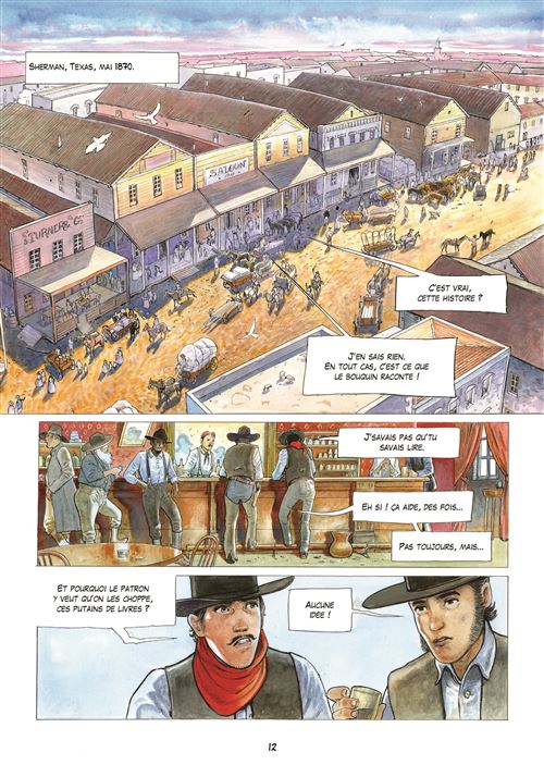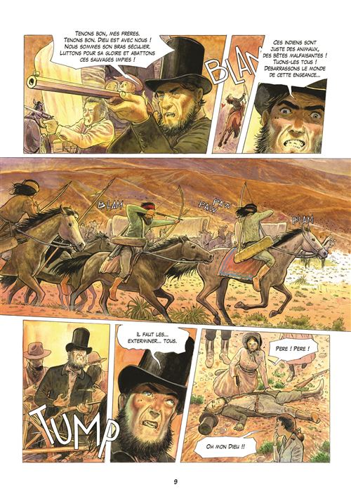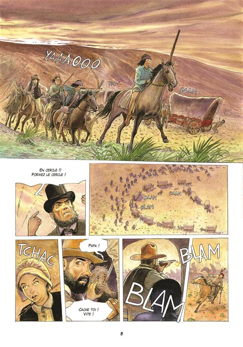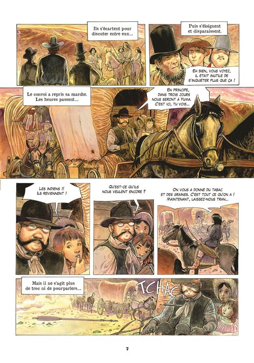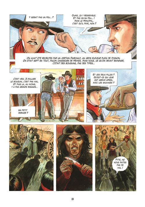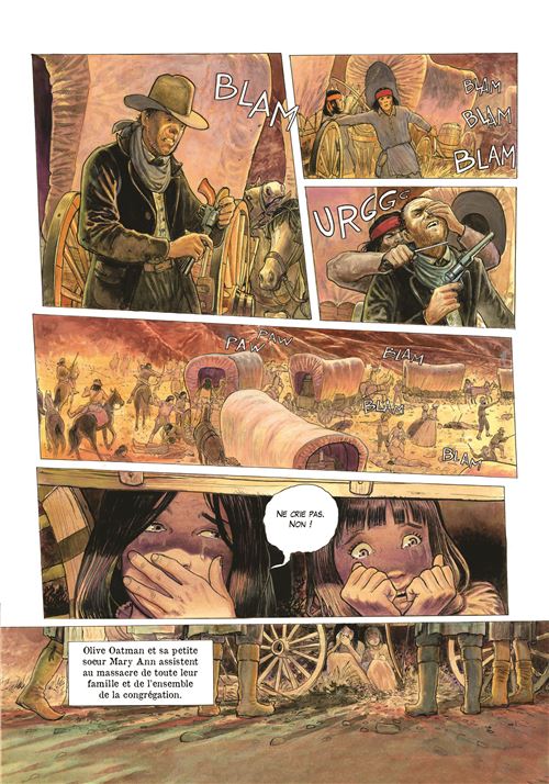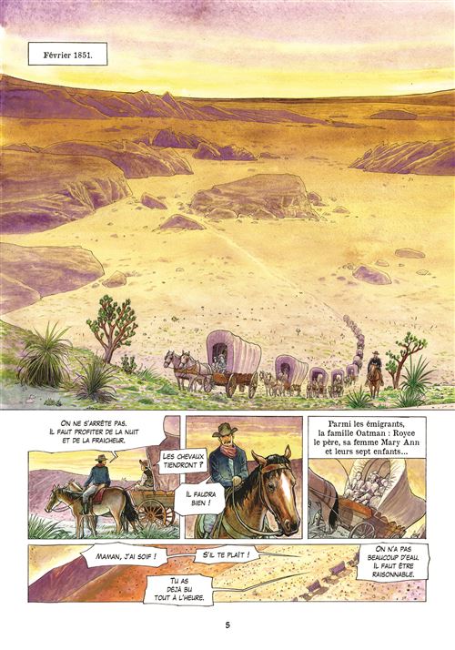 L'histoire de cette BD est tirée d'une histoire vraie, celle d'Olive Oatman. En 1851 elle fut enlevée à 14 ans, avec sa jeune sœur, par la tribu des Yavapais qui ont exterminé toutes les autres personnes du convoi qui devait les mener à Yuma. Les sœurs vivront un an chez cette tribu en tant qu'esclaves avant d'être troquées contre des chevaux et de s'établir dans un village Mohave. Le récit s'appuie sur le peu que l'on sait sur cette femme, surtout qu'elle ne fit jamais un récit véritablement exhaustif de sa vie chez les amérindiens (5 ans). Mais le peu que l'on sait est bien présent dans ce récit. Rodolphe nous raconte son histoire au travers le parcours d'un cow-boy, il a pour mission de trouver et détruire tous les livres qui racontent l'histoire d'Olive Oatman chez les amérindiens. Il veut en savoir plus sur le pourquoi de cette étrange mission, Il va donc se mettre à lire ce fameux bouquin et en relate le contenu à son compagnon de voyage. Une narration basée sur ces allers-retours entre présent et passé, et cela rend la lecture agréable, à défaut d'être passionnante. Deux parcours qui vont finir par se rencontrer pour un beau final. Rodolphe nous dévoile deux cultures amérindiennes très différentes, en particulier celle des Mohaves où les deux sœurs se feront tatouées le corps et le visage à l'encre bleue. Le dessin de Pierre-Emmanuel Dequet ne fait pas partie de ceux qui m'attire au premier regard, mais au fil des pages j'ai apprécié le soin apporté aux détails pour être au plus proche de ce Far West et particulièrement des peuplades autochtones. La colorisation dans des tons chauds est superbe. Du bon boulot et mention spéciale pour les grands espaces. L'album se termine sur une photo d'Olive Oatman prise en 1863. Pour les curieux. Note réelle : 3,5.