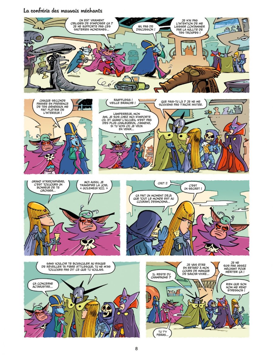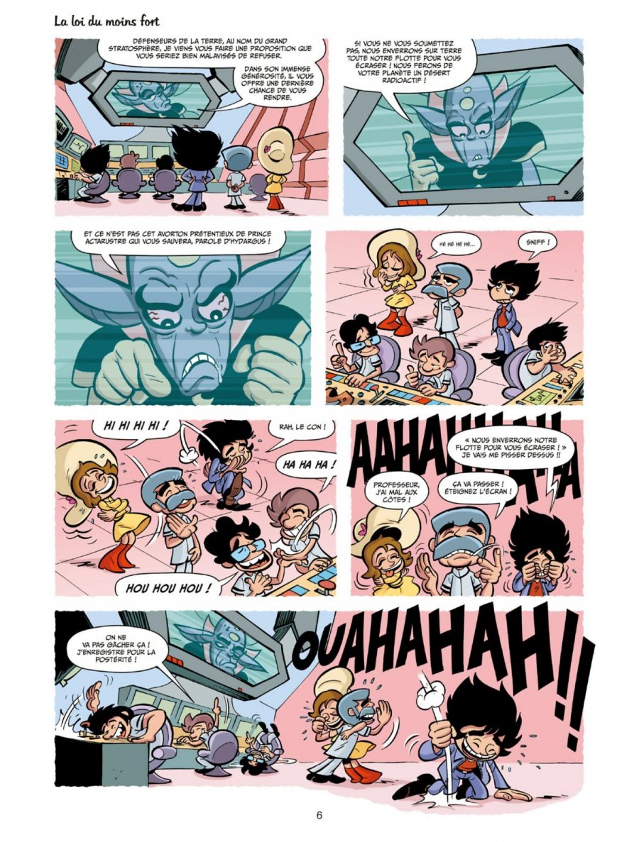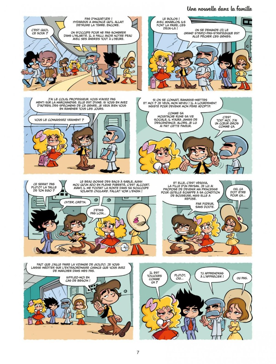 Récré A3 se présente comme une parodie déjantée des dessins animés cultes de la génération Récré A2, en particulier Goldorak, Albator et Candy. L'idée est de détourner les codes de ces séries japonaises des années 70 et 80 pour en faire une comédie absurde et pleine de clins d’oeil. Le dessin de Boris Beuzelin, qui se cache ici sous le pseudo éphémère Yockwan, fonctionne bien avec ce ton parodique. Il adopte un style chibi (petits bonshommes à grosses têtes rigolotes), à la fois caricatural et expressif, et la colorisation apporte une vraie vitalité à l'ensemble. Malheureusement, si l'intention de la série est claire, le résultat ne touche pas les deux publics que la série aurait pu viser. Le ton, volontairement potache et irrévérencieux, rappelle une ambiance de déconne un peu primaire de cour de récré : cela pourrait amuser des préados. Mais les nombreuses références ne parleront qu’aux lecteurs ayant suivi ces dessins animés à la fin des années 70 et début 80. Et pour ce public, l'humour est souvent trop bas de plafond. Certaines planches se terminent même sans que je sois sûr qu'elles contiennent un gag, et n'avancent pas davantage le fil rouge de l'intrigue. De plus, Actarustre, version vulgaire et narcissique d'Actarus, est trop central et agace plus qu’il ne fait rire. L'humour fonctionne un peu mieux dans les seconds rôles que dans la parodie frontale des personnages principaux. J'ai apprécié les Sylvidres, avec le caractère que les auteurs leur ont donné, et un peu Minos et Albator, même si on s'en lasse rapidement. Les autres personnages laissent plus indifférent, notamment la parodie de Candy, lisse et peu utile à l’histoire. Le second tome introduit davantage de références, notamment du côté des méchants, et on peut s'amuser à essayer de toutes les reconnaître. Mais quand moi-même qui suis de la bonne génération, je n'ai pas su identifier la méchante blonde et son Golemeuh, au cœur de plusieurs gags, j'imagine que la plupart des jeunes lecteurs contemporains doivent passer complètement à côté de ces clins d'oeil et de nombreux aspects de l’intrigue. La série a le mérite d’assumer son délire et de proposer un bref moment de nostalgie, mais cet hommage parodique est trop rarement drôle pour un lecteur adulte, et il ne parlera guère aux plus jeunes, pourtant potentiellement les plus réceptifs à ce type d'humour.