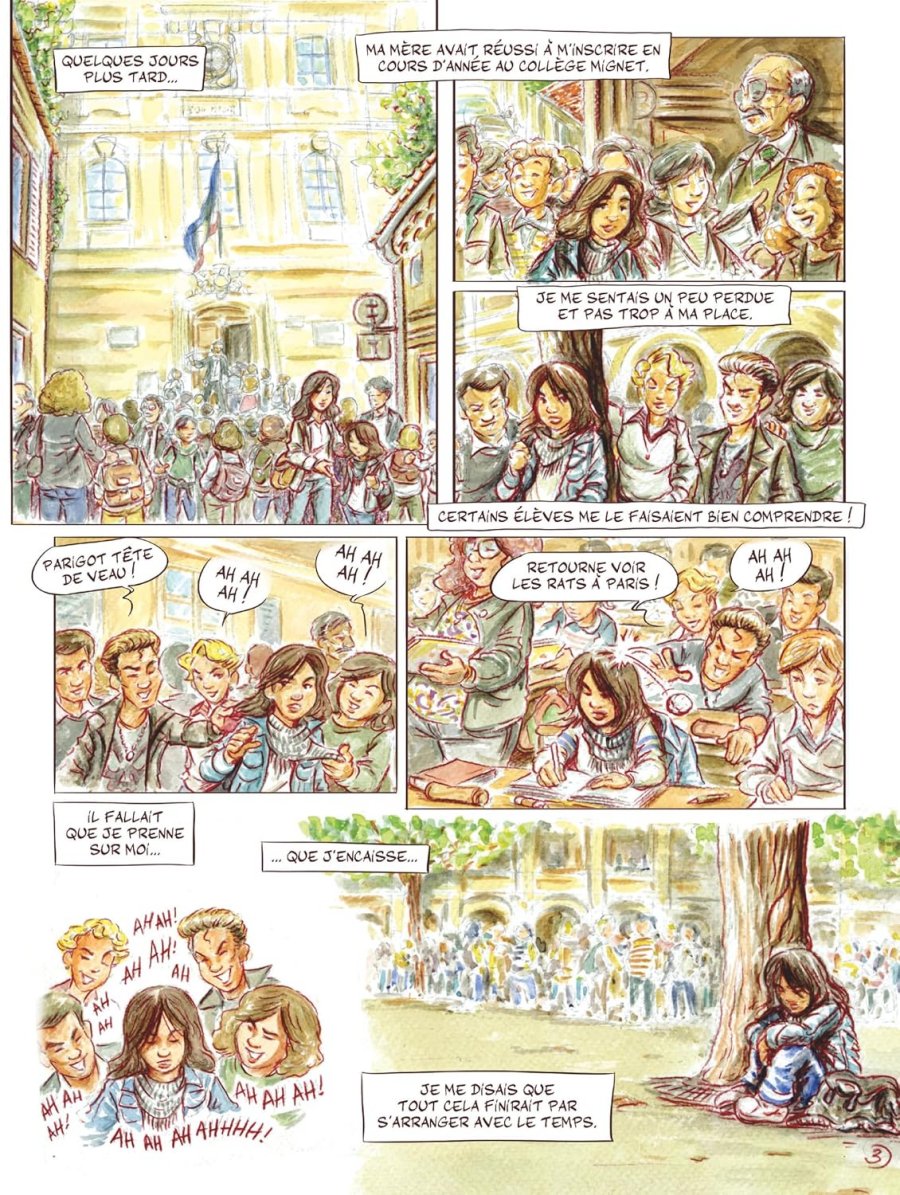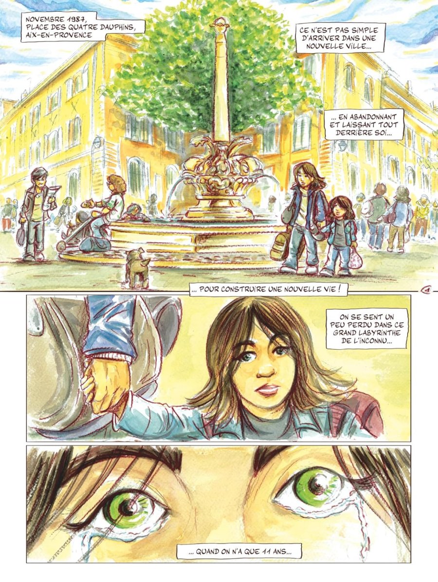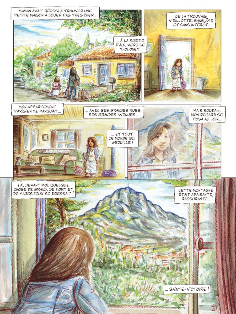 Cette montagne était apaisante, rassurante… Sainte-Victoire ! - Ce tome contient une histoire complète, ne nécessitant aucune connaissance préalable sur le peintre pour l’apprécier. Son édition originale date de 2025. Il a été réalisé par Bernard Fauconnier pour le scénario, et par Alexandre Aré pour le scénario, les dessins et les couleurs. Il comprend cinquante pages de bande dessinée. Il se termine par un dossier de quatre pages intitulé Petite histoire de la route Cézanne, comprenant plusieurs parties : Une route ancienne, Un pays pour les peintres, Des peintres des écrivains, Le baptême de la route. Novembre 1987, place des Quatre Dauphins, Aix-en-Provence. Ce n’est pas simple d’arriver dans une nouvelle ville, en abandonnant et laissant tout derrière soi, pour construire une nouvelle vie ! On se sent un peu perdu dans ce grand labyrinthe de l’inconnu quand on a que onze ans. Maman avait réussi à trouver une petite maison à louer pas très cher, à la sortie d’Aix, vers le Tholonet. Manon, sa fille la trouvait vieillotte, sans âme et sans intérêt. Son appartement parisien lui manquait, avec ses grandes rues, ses grandes avenues et tout ce monde qui grouille ! Mais soudain son regard se posa au loin… Là, devant elle, quelque chose de grand, de fort et de majestueux se dressait ! Cette montagne était apaisante, rassurante… Sainte-Victoire ! Quelques jours plus tard, sa mère a réussi à l’inscrire en cours d’année au collège Mignet. Manon se sent un peu perdue, et pas trop à sa place. Certaines élèves le lui font bien comprendre : en la traitant de tête de veau, en l’enjoignant de retourner voir les rats à Paris. Il faut qu’elle prenne sur elle, qu’elle encaisse. Évitant les railleries, elle s’isole dans la cour de récréation et elle se dit que tout cela finira par s’arranger avec le temps. L’hiver s’installe doucement, la mère de Manon trouve du travail dans un hôpital, mais les horaires sont compliqués et souvent décalés. La jeune fille se retrouve souvent seule à la maison. Alors, pour s’occuper, elle s’installe dans le jardin, elle dessine, elle peint la nature et les paysages qui changent de couleur autour d’elle. Elle ne se sent pas vraiment seule : elle sait que leurs voisins veillent sur elle. Les jours passent : elle et ses voisins apprennent à se connaître. La dame s’appelle Thérèse, elle est calme, douce, très gentille avec Manon qui lui montre ses dessins. Mais la demoiselle sent quelque chose de triste, de cassé, de brisé dans la vieille dame. Et il y a son mari… Un vieux monsieur assez étrange. Une sorte d’ours qui sort de temps à autre de sa tanière. Il a le visage fermé et ne parle jamais. Chaque jour, Manon le voit partir, marcher vers la montagne, avec tout son matériel de peinture. Il disparaît toute la journée, puis quand la lumière du jour s’éteint, il rentre chez lui, toujours sans un mot. Les semaines et les mois passent, les beaux jours réapparaissent et se dessinent avec la nature. Le ciel et les arbres ont retrouvé leur éclat lumineux. Thérèse propose à Manon de l’aider à cueillir des cerises. La jeune fille monte à l’échelle et elle mange autant de cerises qu’elle n’en cueille, se faisant gentiment sermonner par la vieille dame qui lui dit qu’il n’en restera plus assez pour faire un clafoutis. Pas tout à fait une bande dessinée de plus sur Cézanne : dans un premier temps, le lecteur se rend compte que cet ouvrage se lit très facilement, écrit dans un registre tout public. Le personnage principal que suit le lecteur est âgé de onze ans, et rentre au collège dans une ville qu’elle ne connaît pas, avec une intégration difficile car les enfants du coin voient d’abord en elle une parisienne. Ensuite les dessins présentent une apparence très douce, identique au mode de réalisation de l’illustration de couverture : des traits de contour de couleur plutôt que du noir sec et tranchant, une impression de rendu de crayons de couleur, voire de pastels, des visages arrondis avec des émotions faciles à lire, de jolies couleurs vertes et lumineuses pour les paysages naturels, également très lumineux pour quelques rares scènes en intérieur. Le récit est majoritairement raconté par des dialogues, avec des phrases courtes, faciles à lire. François a l’âge d’être un grand-père et il joue le rôle de passeur bienveillant, racontant la vie de Cézanne, avec une sensibilité particulière, à la fois pour le métier de peintre, à la fois pour la région d’Aix-en-Provence, et plus particulièrement pour ce site appelée Route Cézanne. La lecture s’avère d’une grande facilité, accessible et didactique, ancrée sur le point de vue de la jeune fille. La narration visuelle est tout aussi agréable, fortement influencée par les œuvres du maître, majoritairement celles réalisées sous le soleil de Provence. Enfin… Les couleurs claires évoquent également les œuvres de Vincent van Gogh, celles d’Alfred Sisley, tout en étant foncièrement différentes. D’une certaine manière l’artiste combine les techniques picturales traditionnelles de la bande dessinée (détourage des formes avec un trait) et quelques touches impressionnistes (en particulier dans le rendu de la verdure et bien sûr dans la silhouette de la montagne Sainte-Victoire). Il combine une approche représentative et descriptive adaptée à une bande dessinée tout public, et une évocation de l’esprit de l’impressionnisme, de la démarche de rendre compte de la sensibilité de Cézanne, de la beauté de luminosité et du paysage dans cette région. Très régulièrement, le lecteur se retrouve ainsi sous le charme d’une impression, de l’évocation d’une perception en appelant aux sensations : le feuillage de l’arbre devant lequel se dresse la colonne de la fontaine de la place des Quatre Dauphins en planche un, le premier aper
