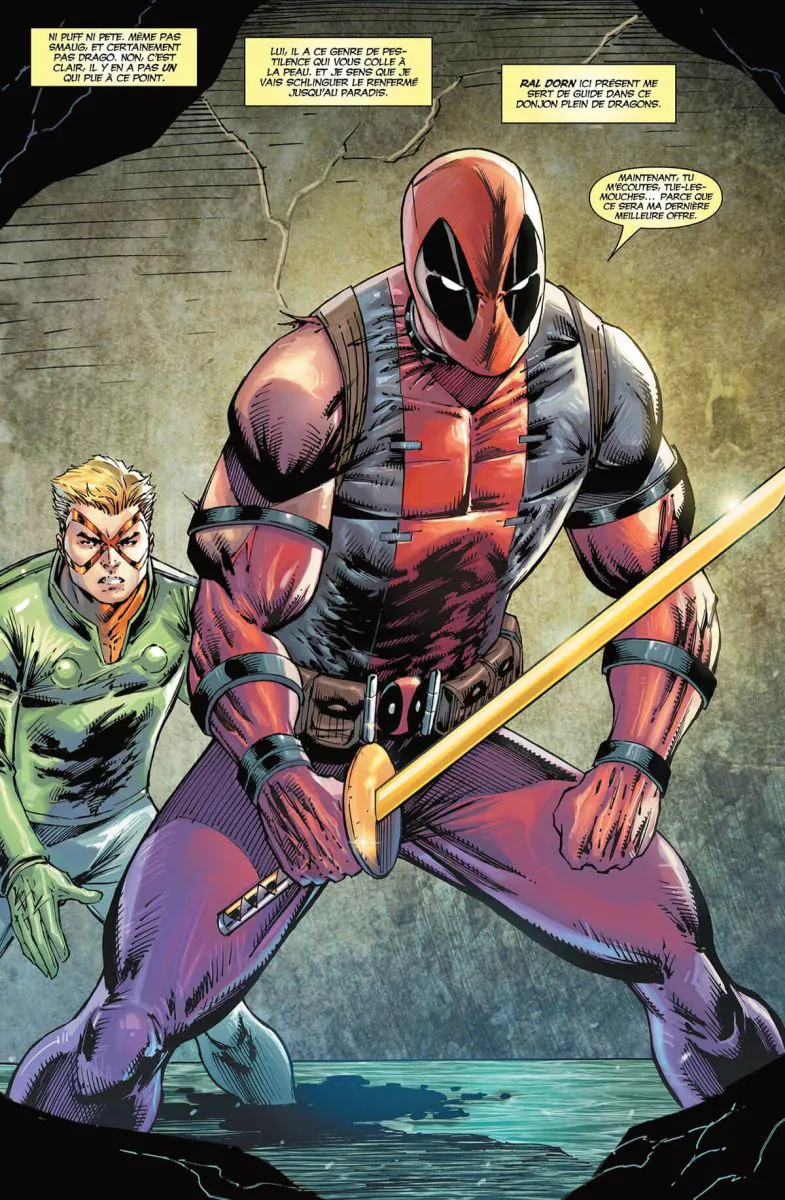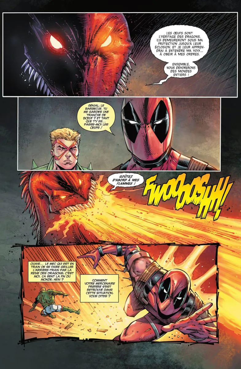 L'équipe de rêve de Deadpool . L'ultime aventure de Deadpool écrite par son créateur, trente-trois ans après ses débuts. . Récupérer un oeuf de dragon, convoité par la mafia et par des seigneurs dragonniers, est une mission que seul un fou entreprendrait... Heureusement, Lady Anime peut compter sur Deadpool pour relever ce défi ! Le Mercenaire Disert se retrouve ainsi impliqué dans une lutte de pouvoir entre Ral Dorn et le Baron Skagerackrakor pour la domination du royaume de Rammatpolen. Bientôt, Wolverine, Hulk, Ghost Spider, Cristar et le Major X font leur apparition. Amis ou ennemis ? Il est encore trop tôt pour le dire....