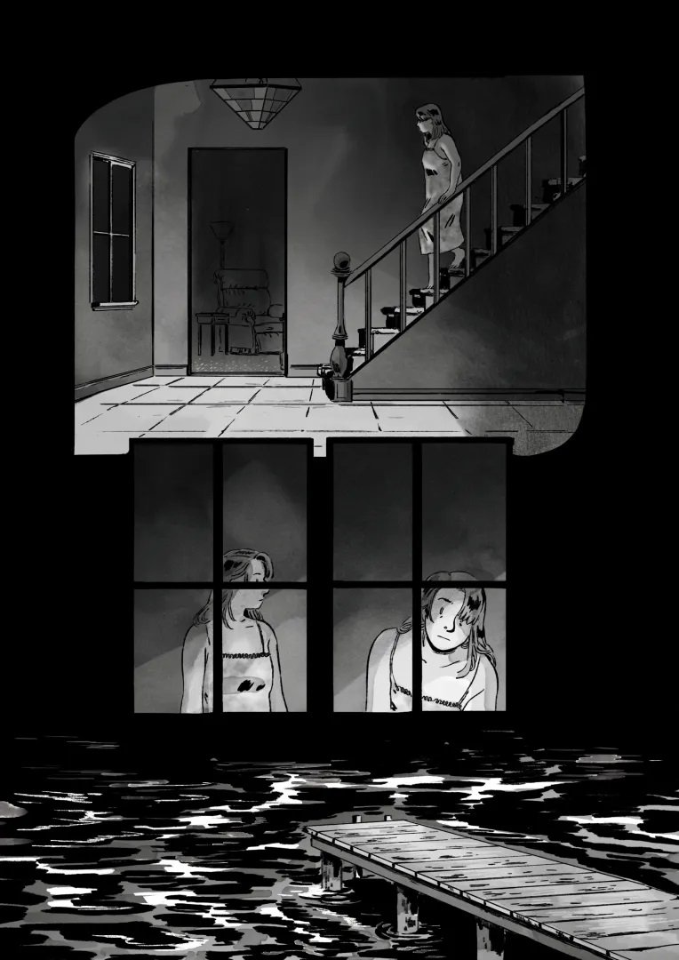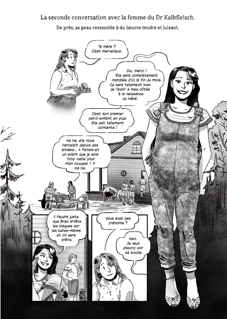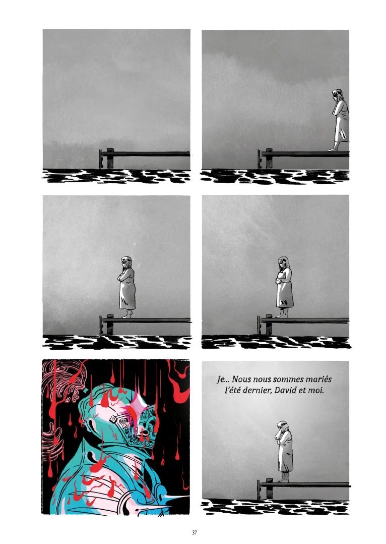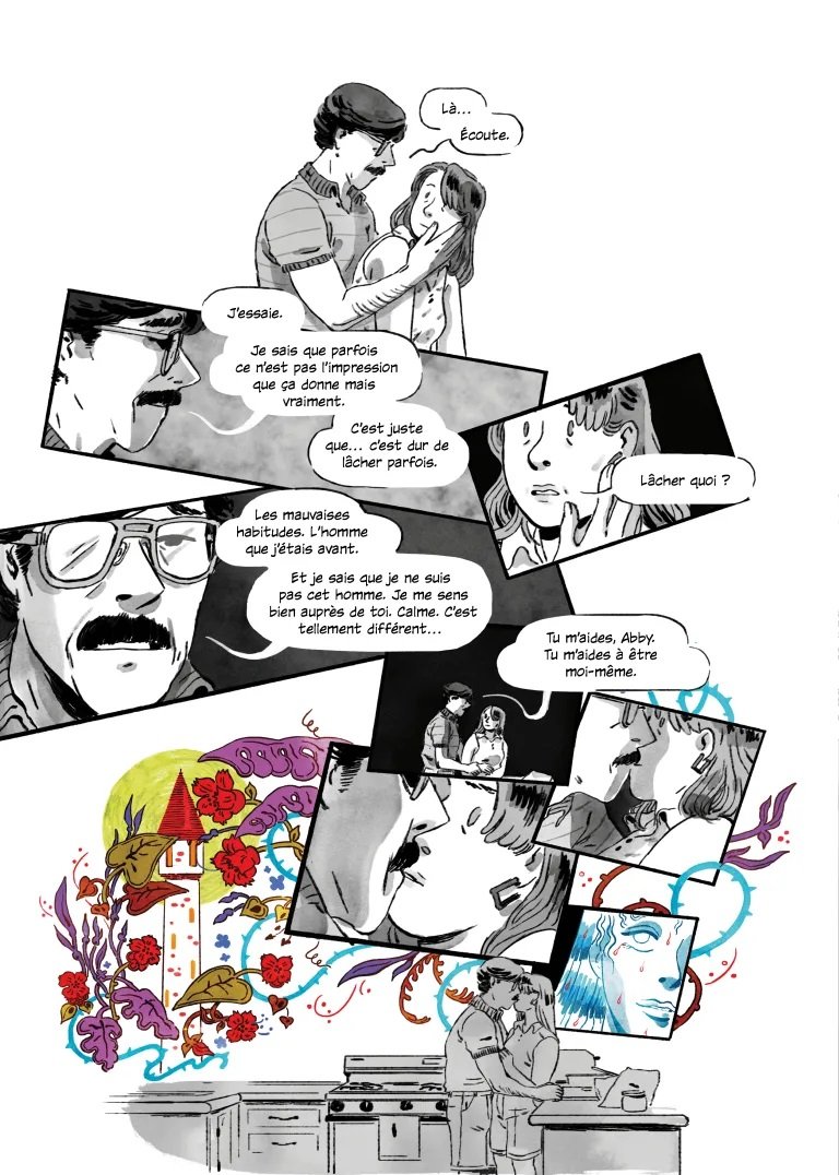 Voilà encore un bel ouvrage aux éditions 404. J'avais déjà lu Speak du/de la même auteur(rice) que j'avais beaucoup aimé tant niveau graphique que de l'histoire. L'histoire débute comme une banale histoire de famille recomposée avec une jeune femme devenue belle-mère et qui espère bien faire avec sa belle-fille d'autant plus que la maman est décédée. Abby aime cette vie même son amour avec David est un peu distant. Mais petit à petit le trouble et des questions apparaissent sur la mort de Sheila, la première femme de David. La tension monte progressivement. Si l'on pense savoir où l'histoire nous emmène on est finalement surprit par le dénouement. On est sur un conte horrifique avec un brin de fantastique ce qui a très bien marché avec moi. Me dessin n'est pas en reste avec un très beau noir et blanc pour la vie quotidienne/réelle et l'apparition des couleurs pour les passages oniriques et les fantômes. Les couleurs sont flamboyantes au milieu du noir et blanc avec des pages sublimes. Un petit mot aussi sur le livre en lui-même. C'est encore une belle édition avec un papier épais et de qualité comme la couverture d'ailleurs. La jaquette du livre est sublime aussi. Le livre a un coût 30€ mais il est pour moi amplement justifié par la qualité de l'ouvrage en lui même.