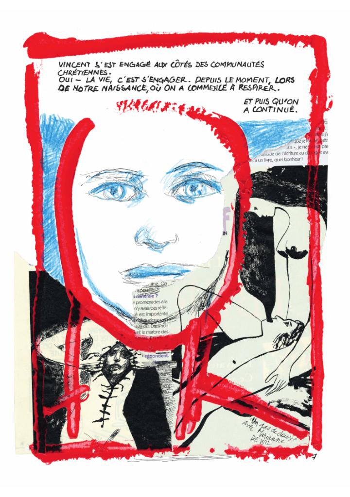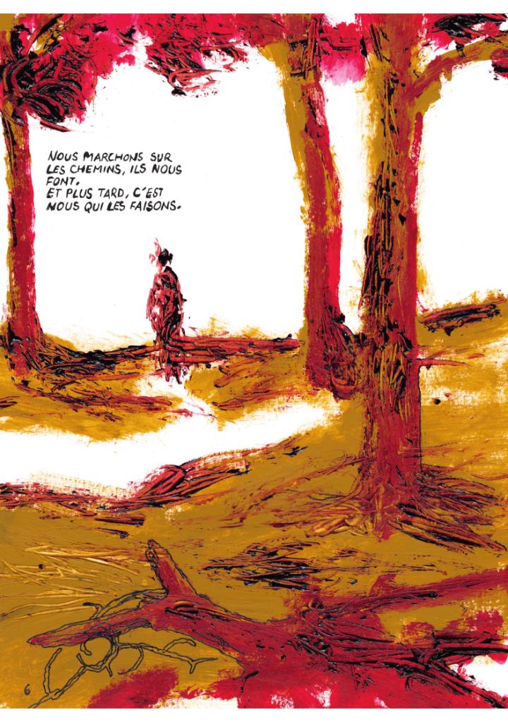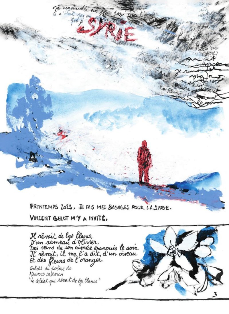 Beaucoup disent : que la Syrie redevienne comme avant. - Cet ouvrage correspond à une forme de reportage libre qui ne nécessite pas de connaissance préalable. Son édition originale date de 2025. Il a été réalisé par Vincent Gelot et Edmond Baudoin pour le scénario, et par ce dernier pour les dessins et les couleurs. Il comprend cent-vingt-trois pages de bande dessinée. Edmond Baudoin raconte qu’il a voyagé au Mexique, en Colombie, dans le Nunavut, en France pour faire le portrait des gens rencontrés. Au cours de ces échanges, il a constaté qu’à travers le monde les êtres humains ont des désirs communs. Avoir une vieillesse correcte. Pouvoir travailler. Faire que leurs enfants puissent poursuivre leurs rêves. Printemps 2023, il fait ses bagages pour la Syrie. Vincent Gelot l’y a invité. Celui-ci lui propose de venir avec lui sur les routes syriennes, qu’il a dessinées en rouge sur une carte du pays. Vincent. En 2012, il quitte la France en 4L, à la rencontre des communautés chrétiennes d’Orient. Son voyage devait se terminer en quelques mois. Il durera deux ans. Ce périple un peu fou le mène aux confins de l’Asie Centrale, puis dans le golfe persique et la corne de l’Afrique. En 2014, Daech s’empare de Mossoul et chasse les populations de la plaine de Ninive où les gens lui avaient donné l’hospitalité. Cela l’a beaucoup marqué car il ne savait pas si ceux qui l’avaient accueilli étaient encore en vie. Quelques mois après être revenu en France, Vincent repart à Erbil, au Kurdistan irakien. Il cofonde radio Al-Salam, une radio destinée aux déplacés dans les camps de réfugiés. C’est là qu’il a compris que son engagement était de vivre aux côtés de ces communautés et de les accompagner dans leur destin de vie. En 2016, Vincent s’installe au Liban et travaille pour l’Œuvre d’Orient. Son travail est de rester au contact de la population, d’évaluer les besoins sur place et de suivre la réalisation des projets. Il aime ces gens. Nous marchons sur les chemins, ils nous font. Et plus tard, c’est nous qui les faisons. Vincent s’est engagé aux côtés des communautés chrétiennes. Oui, la vie, c’est s’engager. Depuis le moment, lors de sa naissance, où on a commencé à respirer. Et puis qu’on a continué. Vincent explique à Edmond que les Chrétiens d’Orient forment une mosaïque de communautés minoritaires, souvent discriminés, parfois persécutés. En Syrie, ils étaient environ deux millions en 2011, ils seraient 500.000 aujourd’hui. Baudoin fait observer que : Leur combat a souvent été récupéré par l’extrême droite, non ? Vincent répond que : Oui, c’est vrai, certaines associations utilisent la détresse réelle des Chrétiens du Moyen-Orient pour répondre à des ambitions personnelles et des objectifs quelques fois obscurs. Ce n’est pas le cas de l’Œuvre d’Orient. C’est une des plus vieilles associations françaises. Elle a été créée en 1856 par des professeurs de la Sorbonne et du Collège de France. Un prêtre, le père Lavigerie, fut nommé à la tête de cette association. Il deviendra plus tard le cardinal Lavigerie… Edmond l’écoute, puis son esprit s’en va ailleurs. En 2020, il a illustré des poèmes de Vincent. Nul besoin pour le lecteur de maîtriser l’histoire contemporaine de la Syrie pour apprécier cet ouvrage : le régime de Hafez el-Assad (1930-2000), celui de Bachar el-Assad (1965-), la guerre civile syrienne de 2011 à 2024 en faveur de la démocratie contre le régime du parti Baas. Le bédéaste annonce explicitement qu’il s’agit d’une commande de l’Œuvre d’Orient, une association à but non lucratif fondée en 1856, aidant les Chrétiens d’Orient. Il accompagne donc Vincent Gelot, poète et coauteur de l’ouvrage Chrétiens d'Orient: Périple au cœur d'un monde menacé (2017) avec Pascal Gollnisch. Comme il l’explique dans les premières pages, Edmond Baudoin ne parle pas la langue, et il se fait expliquer certaines situations par des interlocuteurs francophones. Il demande à Vincent la raison de son voyage : son interlocuteur expose sa perception des faits sur la période commençant en 2011. Jihanne lui explique la position des Chrétiens en Syrie. L’évêque Jacques raconte sa vie de moine, sa séquestration. Vincent parle du martyre de la ville de Hama. Nabil, un membre des Maristes bleus, raconte comment il a vécu la guerre. Le père Jihad raconte l’histoire de Mar Moussa El Abashi (Saint Moussa, le visage brulé), c’est-à-dire Le monastère de Saint-Moïse-l'Abyssin à quatre-vingt-dix kilomètres au nord de Damas. Les auteurs savent mêler l’histoire du pays avec une forme de tourisme singulier. De manière tout à fait légitime, le lecteur peut s’interroger sur le positionnement du récit, ou le point de vue à partir duquel la Syrie va être considérée. S’il connaît déjà l’œuvre de Baudoin, il connaît la réponse avant même de commencer sa lecture. S’il n’en est pas familier, il comprend rapidement qu’il s’agit d’un point de vue humaniste sincère, une volonté d’établir un contact vrai. Cela peut paraître surprenant sachant que l’artiste ne parle pas la langue du pays. Il reprend une démarche qu’il a mise en œuvre dans plusieurs pays (dont il ne parlait pas la langue non plus) : réaliser le portrait de son interlocuteur, en l’échange de sa réponse à une question. Le dessinateur l’a écrit à de nombreuses reprises : deux êtres humains qui se regardent fixement pendant une dizaine ou une vingtaine de minutes constitue une expérience rare dans la vie d’un être humain. De fait les portraits reproduits dans l’ouvrage présentent des particularités qui les font ressortir. Les deux premiers sont tenus devant eux la personne représentée, dessinée d’une manière différente, produisant un effet de mise en abîme totalement naturel. Les suivants sont reproduit