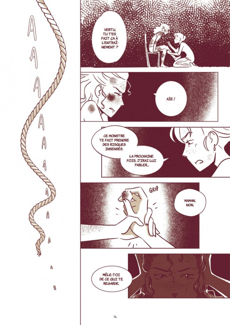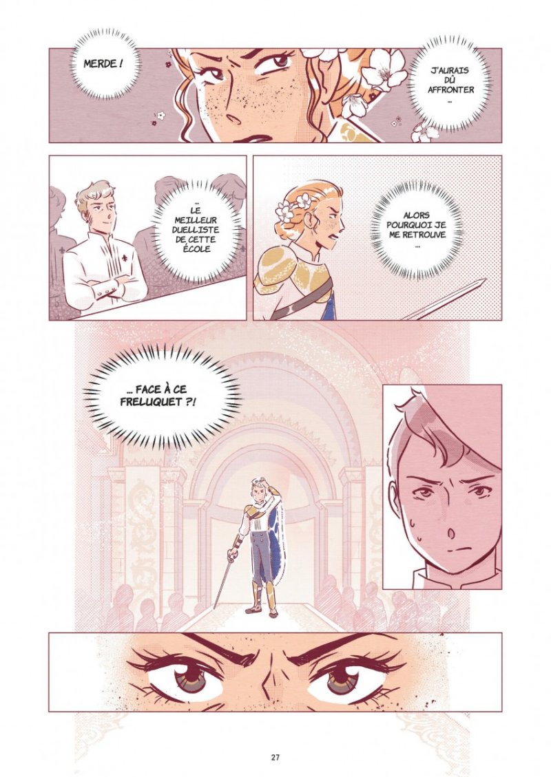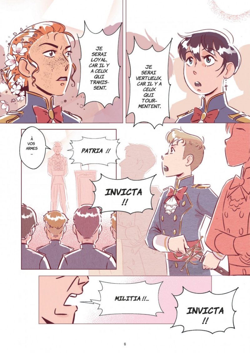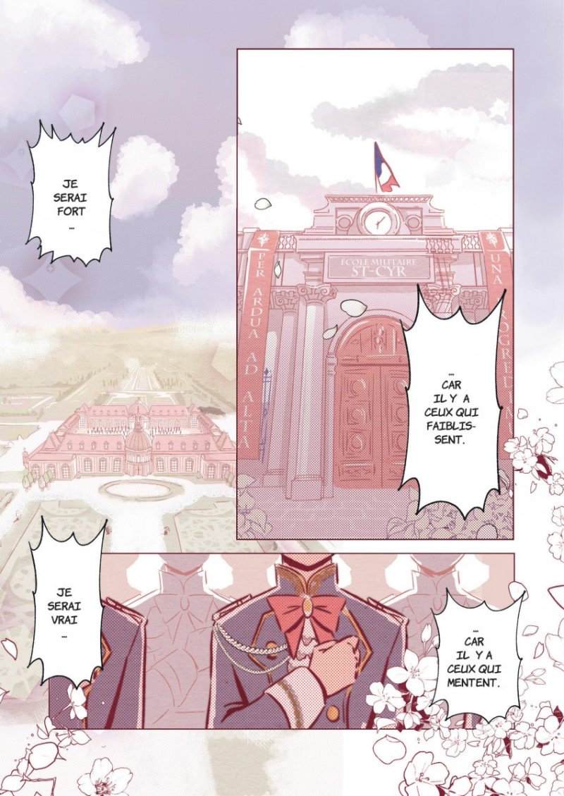 Voilà une œuvre sur laquelle je ne sais pas encore pleinement quoi penser mais que je trouve indéniablement intéressante. Vertu de St-Cyr, avec son titre et sa couverture, m'a paru à l'origine être un banal récit historique vantant la gloire passée et (disons-le) grandement enjolivée (voire même inventée) de la France, le tout dans un enrobage "girl-power". Sauf que voilà, curieuse que je suis, j'ai quand-même essayé de voir de quoi il retournait et, quand j'ai vu qu'il s'agissait vraisemblablement d'un récit souhaitant surtout parler de sujets comme le harcèlement scolaire, l'élitisme bourgeois et la cruauté et le froideur d'un système patriarcal, j'avoue que j'ai sincèrement eu envie de voir de quoi il retournait. Vertu de St-Cyr nous raconte l'histoire de Vertu Dumas, une jeune femme souhaitant rejoindre les rangs de l'armée et qui devra faire face à un système archaïque, cruel et inhumain broyant chacun-e des élèves entrant dans l'école. Ou l'on plie, ou l'on casse. Vertu, orgueilleuse et désireuse de justice, fera tout son possible pour résister mais finira par rejoindre malgré elle l'infernale machine qui régit l'école, et c'est avec Ysaure L'Éstoiles, une jeune fille dont la vie sociale a été réduite en miette lorsque d'affreuses rumeurs sur sa soi-disante perte de virginité on commencé à circuler, et Alyosha Novotny, petit frère du grand chef de la bande dirigeante, secrètement homosexuel, que Vertu va commencer à instaurer une rébellion, une vengeance même. Bon, sur ce point, difficile pour moi d'en dire plus, c'est justement là que ce premier tome se termine. L'histoire est classique, la mise en scène ne m'a pas convaincue et le dessin, bien qu'expressif, ne me parle pas tant que ça. Sur ces points l'album ne m'a pas vraiment marqué en bien, et pourtant je vous ai partagé le fait que je le trouvais tout de même très intéressant lors de mon introduction. Pourquoi ? Parce que l'album ne mets pas des gants et souhaite aborder son sujet ouvertement et clairement. Harcèlement systémique, pression social, bizutages, peur, contrôle des foules, discours sexistes, racistes, classistes, nationalistes et homophobes normalisés et intériorisés, la radicalisation des pensées et des paroles, les beaux discours de façades et les actions "positives" qui ne font pas de vague, qui ne changent rien… On nous parle de tout, tout ce qui constitue un système social cherchant par tout les moyens à conserver des séparations de classes, de sexes/genres claires et qui cherche à se donner des airs de progressisme. Le fait que le récit et la mise en scène, tant dans les dialogues que dans l'usage de certaines commodités modernes, mélange le récit historique et certains us et coutumes de notre époque à nous nous rappelle le caractère intemporel de ce genre de récit. Au delà du caractère intemporel, il est aussi question d'un fonctionnement de pensée, d'une construction sociale qui refuse de mourir, qui se cache sous des atours progressistes et bien pensants mais qui continue bel et bien d'exister, d'agir, d'écraser les mentalités. La post-face où les autrices parlent de ce qui les a inspiré pour ce récit est justement intéressant. Le sujet de l'embrigadement et de la dichotomie entre les discours tenues et les actions effectuées par les classes dirigeantes, par les institutions nationales, sont encore bel et bien d'actualité. Donc voilà, même si la forme du récit ne me parle pas vraiment, que la narration m'a paru trop convenue, je reconnais amplement à cette création de ne pas être creuse et mièvre pour autant, d'être joliment travaillée et documentée dans son fond même. Je n'irais sans doute pas plus loin, faute d'attache, mais nul doute que d'autres personnes pour qui ce style parle plus sauront apprécier ce récit qui, je l'espère avec cette prémisse engageante (bien que classique), semble bien parti pour être a minima sympathique et réfléchie.
