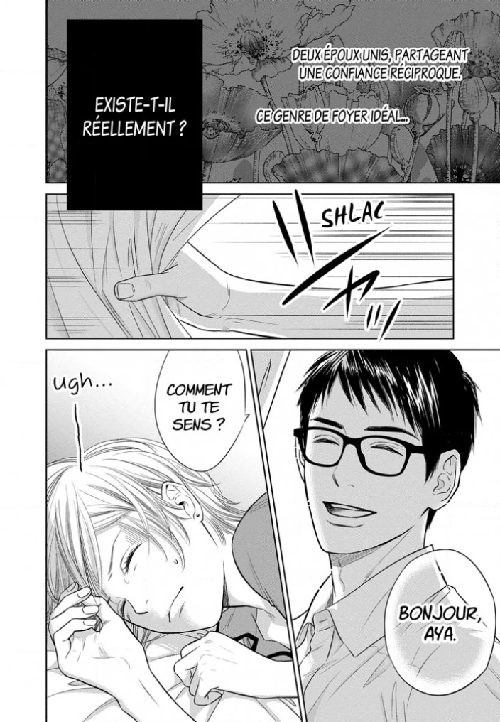 Aya, 29 ans, est mariée depuis deux ans. Elle jouit d'un quotidien paisible aux côtés de son époux Kazuma, un homme honnête et séduisant que tout le monde autour d'elle lui envie. Mais un jour, Aya découvre sur le téléphone de son mari un message lourd de sens. De plus, ce dernier se met à rentrer plus tard que d'habitude... "Dois-je enquêter sur l'infidélité de mon mari ?" "Est-ce que mon mari me trompe... ?!" Ainsi commence une vie conjugale pleine de doutes... Texte: L'éditeur