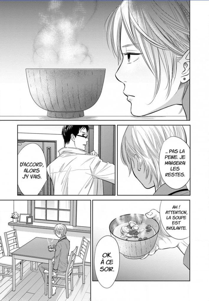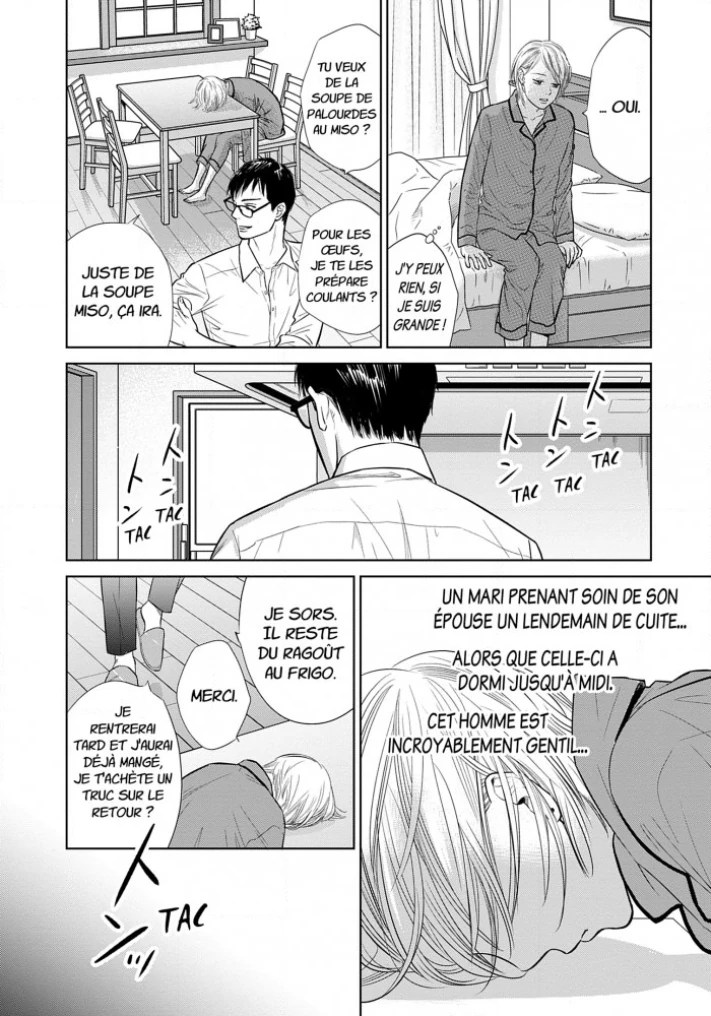 Un manga assez étonnant parce qu'il traite de son sujet, une femme qui pense que son mari la trompe, de manière réaliste. On voit donc suivre les interrogations de la pauvre héroïne qui ne sait pas quoi faire. Au travers de son histoire et celle de son mari, on va aussi voir des problèmes d'autres couples...En effet, la vie n'est pas facile dans ce Japon qui aime bien mettre les gens dans des cases bien définis et c'est dur d'être femme au foyer (quoique l'héroïne a un travail à temps partiel, n'ayant pas encore d'enfants) ou employé dans une grande entreprise. Le ton est réaliste ou du moins tout semble crédible. Le scénario n'est pas aussi cousue du fil blanc qu'il semble au premier abord et il y a des bonnes surprises. L'héroïne est attachante. Malgré tout, je trouve qu'il y a des défauts dans le scénario. Le pire étant qu'après avoir vu le point de vue de l'héroïne pendant plusieurs tomes, on va voir la version des faits du point de vue du mari pendant 2 tomes et on apprend rien de vraiment nouveau après toutes les grosses révélations du tome 4. Il y a quelques moments sympas, mais globalement j'ai eu l'impression que je perdais mon temps et que cela ralentissait inutilement le scénario. Il y a aussi le personnage de l'étudiant qui travaille avec l'héroïne que je trouve assez énervant. En fait, j'ai trouvé que c'était une bonne série dramatique, mais pas au point de trouver cela passionnant à lire. Quant au dessin, c'est typique le genre de dessin qu'on retrouve dans ce genre de mangas pour femmes (quoique c'est paru dans un appli qui ne semble pas destiné a un seul sexe). C'est pas mal et ça va bien pour ce type de récit.